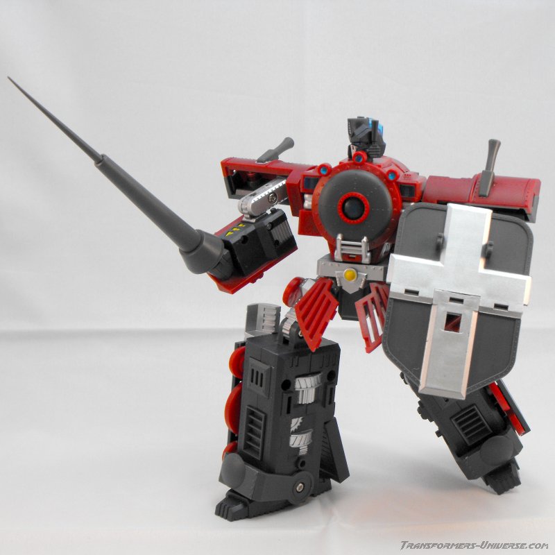 The figure has nothing worth complaining about in terms of posability. The shoulder-elbow-forearm design takes a moment to get used to, but everything works fine with no restrictions. The legs, too, are pretty much fully posable, despite the fact that the Knight Morpher wears the train engine's rail guard as an apron (of sorts) on his hip. The two parts can bend out of the way for whatever pose you want, no problem. In terms of wrist movement the Knight Morpher adopts a trick of sorts. The fists are immobile, but he's got two different sets of them which can be interchanged. The second set has the wrists tilted forward, so he can point his lance forward instead of straight up. Not sure that was strictly necessary, but it's a nice detail.