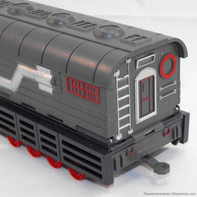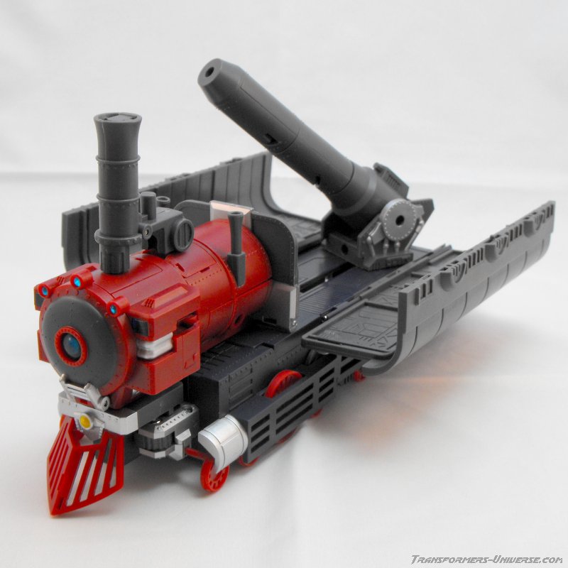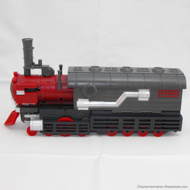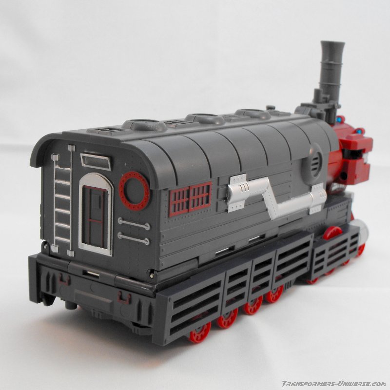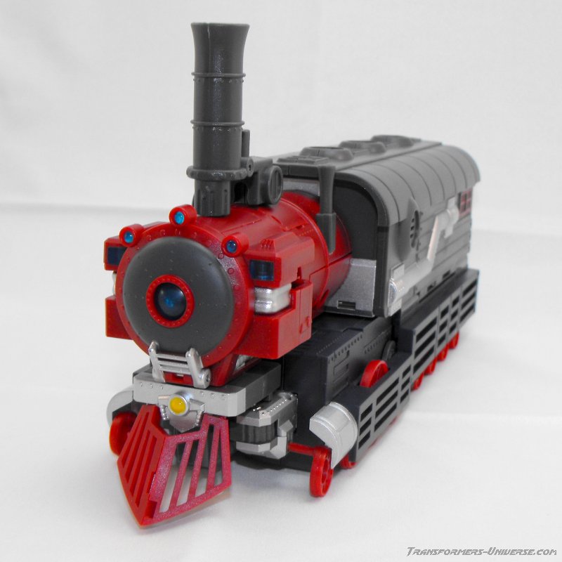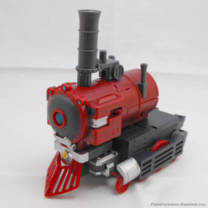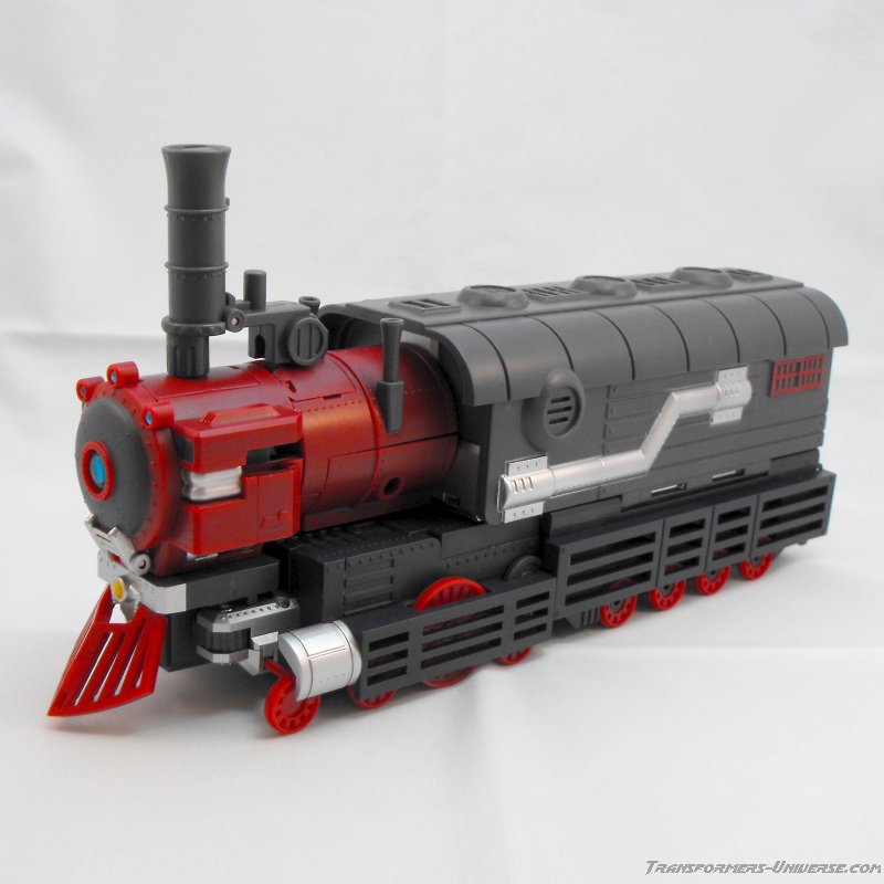 Alternate Mode: Given that this figure depicts Optimus Prime as he would have looked had the Transformers come to Earth in the late 19th century, his alternate mode of a steam railroad engine is very much fitting. Again, though, the designers tried to stick close to the classic Optimus Prime look and so Prime transforms into a red engine with a grey wagon that attaches to him in alternate mode, just like the truck trailer of yore. Very nicely done. The transformation, too, is almost 1:1 identical to how G1 Prime transforms into his truck mode.
