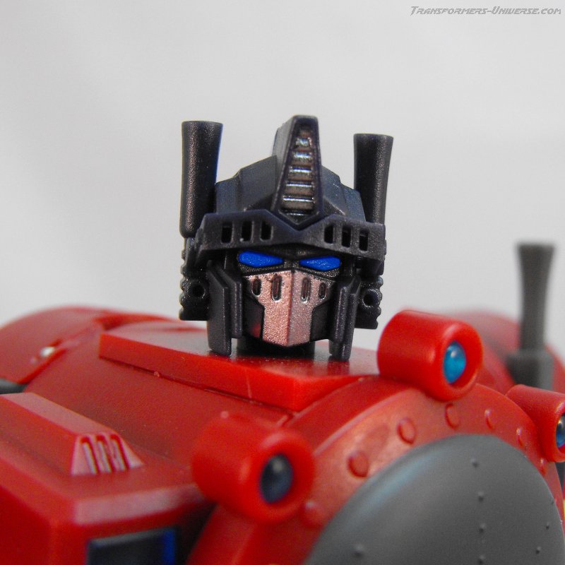 The train offers little room for complaint. But the engine as well as the wagon behind it are very nicely detailed. A very nice detail, btw: The silver pipes running alongside the wagon mirror the stripes on G1 Prime's trailer. I'm a bit worried about the tiny little red plastic wheels of the train, but so far they've proven more sturdy than they look, so no points deduction here, either. All in all, a very nice-looking train mode. And if you want, you can have Optimus' head peak out front, so he can see where he's driving.