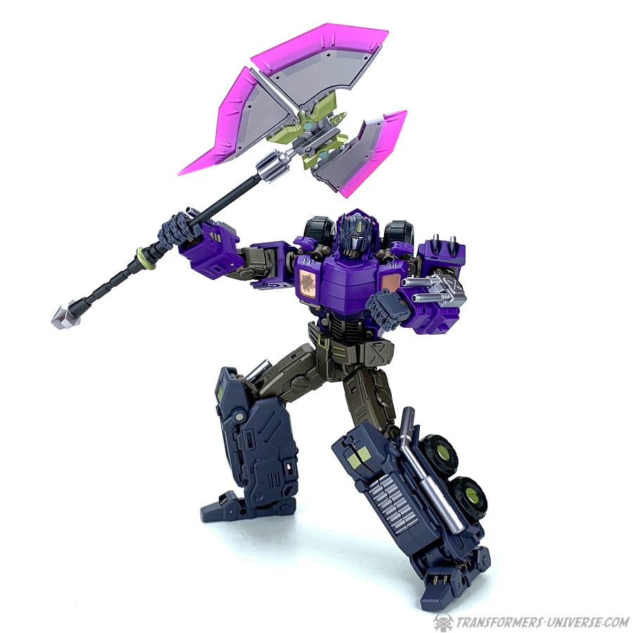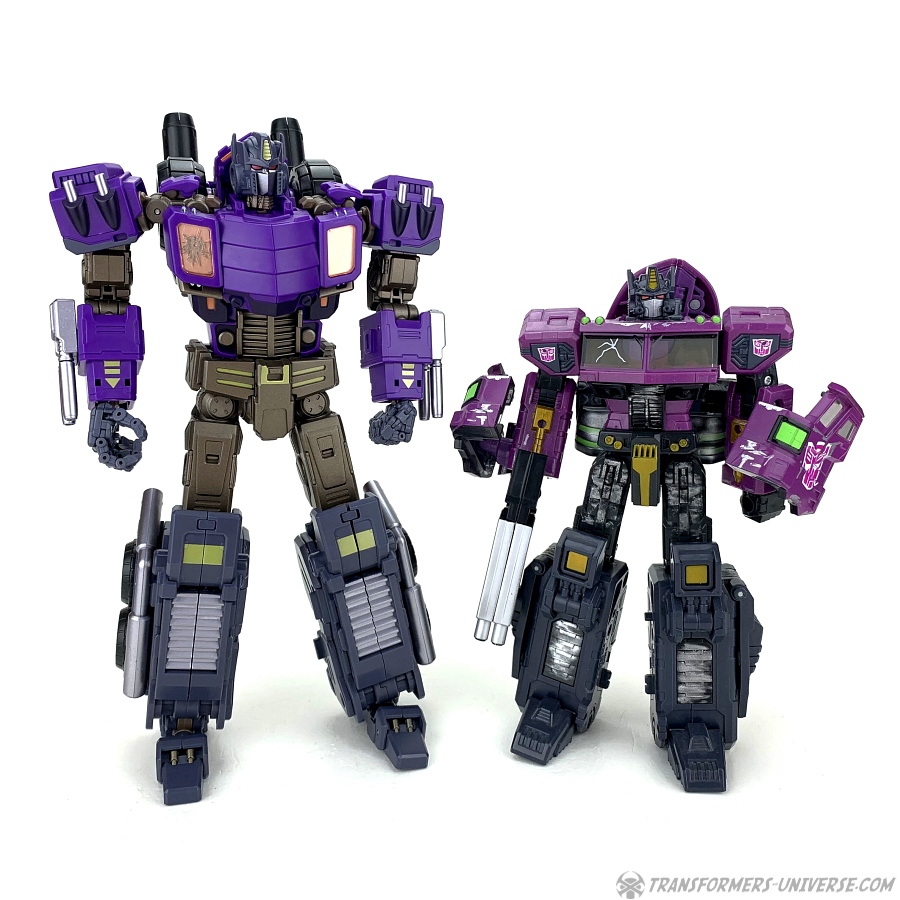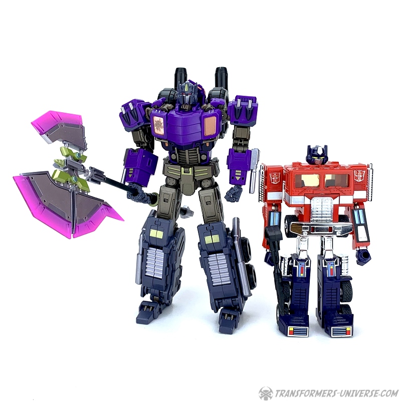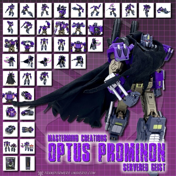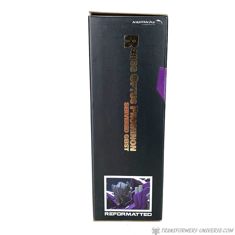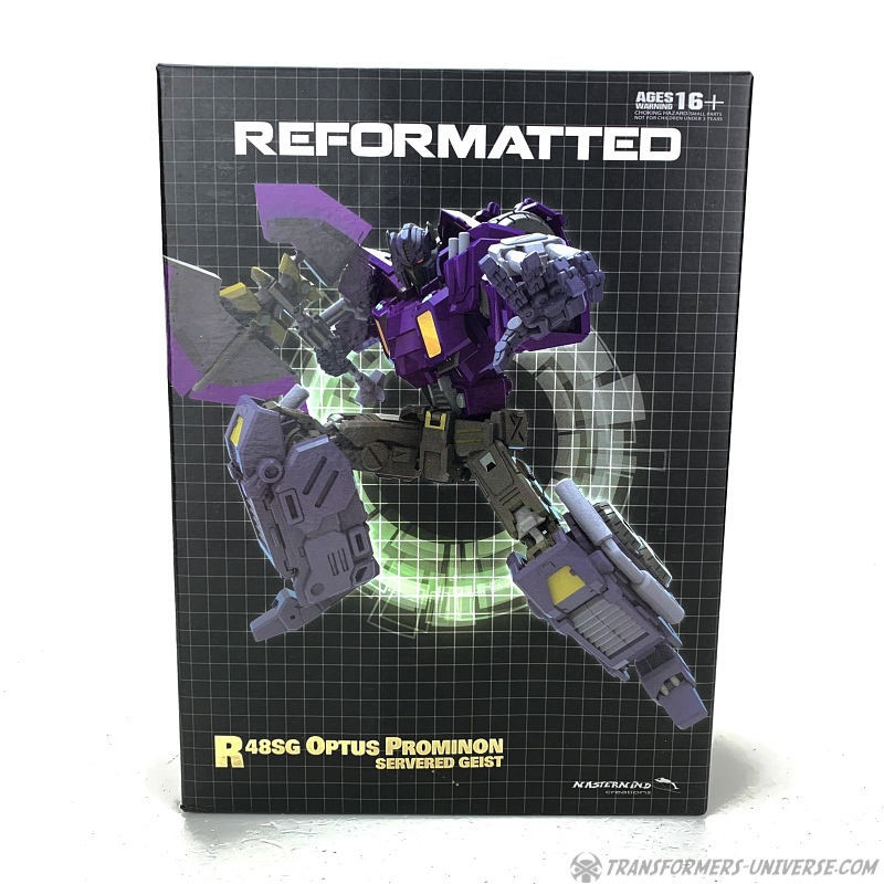 Prelude: When you’re a Third Party company creating a figure inspired by Optimus Prime, why not name it Optus Prominon? Sure, it’s a bit of bastardized Latin, but it more or less means the same thing. Also, every Optimus Prime figure, be it official or third party, needs to be repainted at least once, preferably numerous times. And while the old black repaint remains the favorite, the purple Shattered Glass (or Servered Geist, rather) version is almost as prominent by now. So let us take a look at Mastermind Creations’ version of the evil Autobot leader. Let’s say go!