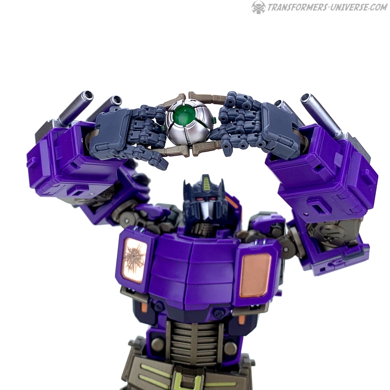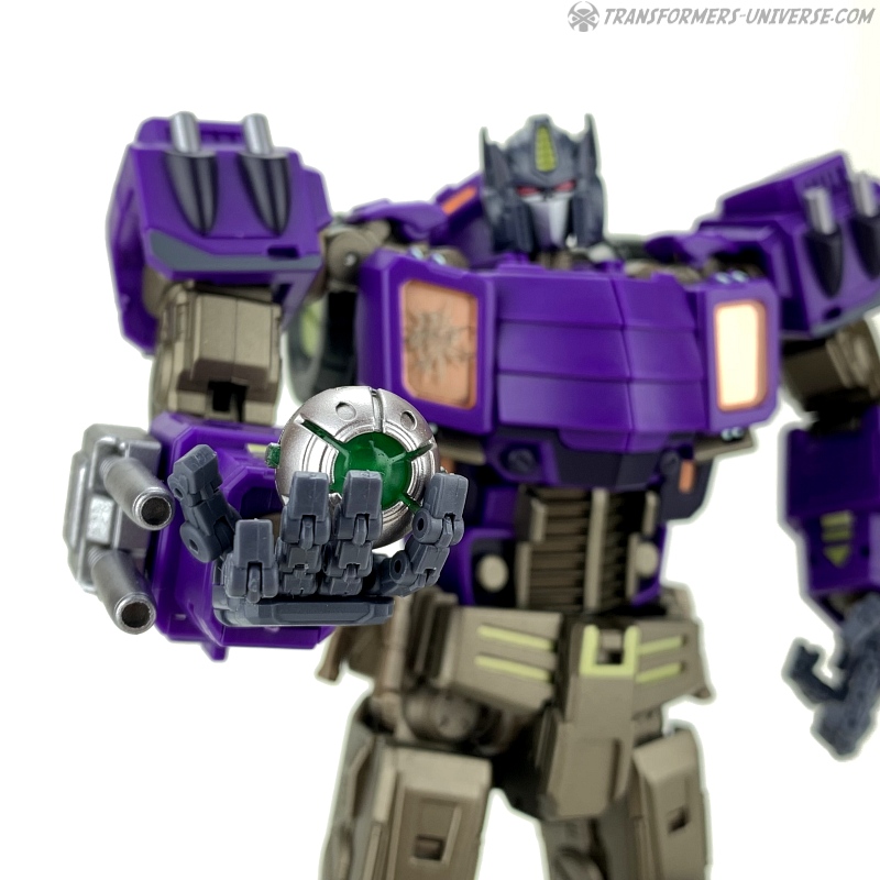 As is almost standard for most Optimus Prime figures, official or third party, Optus Prominon can open up his chest, revealing a Matrix of Leadership (is it called that in Shattered Glass?). The unusual thing, and really my one and only complaint about this figure, is that it’s just the centerpiece of the Matrix inside his chest. The handles of the Matrix are extra parts, which he can carry on his hips. I would very much prefer the whole thing to be one piece, as the handles easily fall off his hip and are thus easy to get lost.