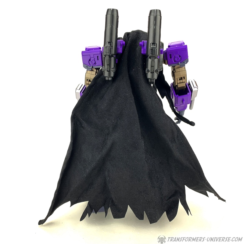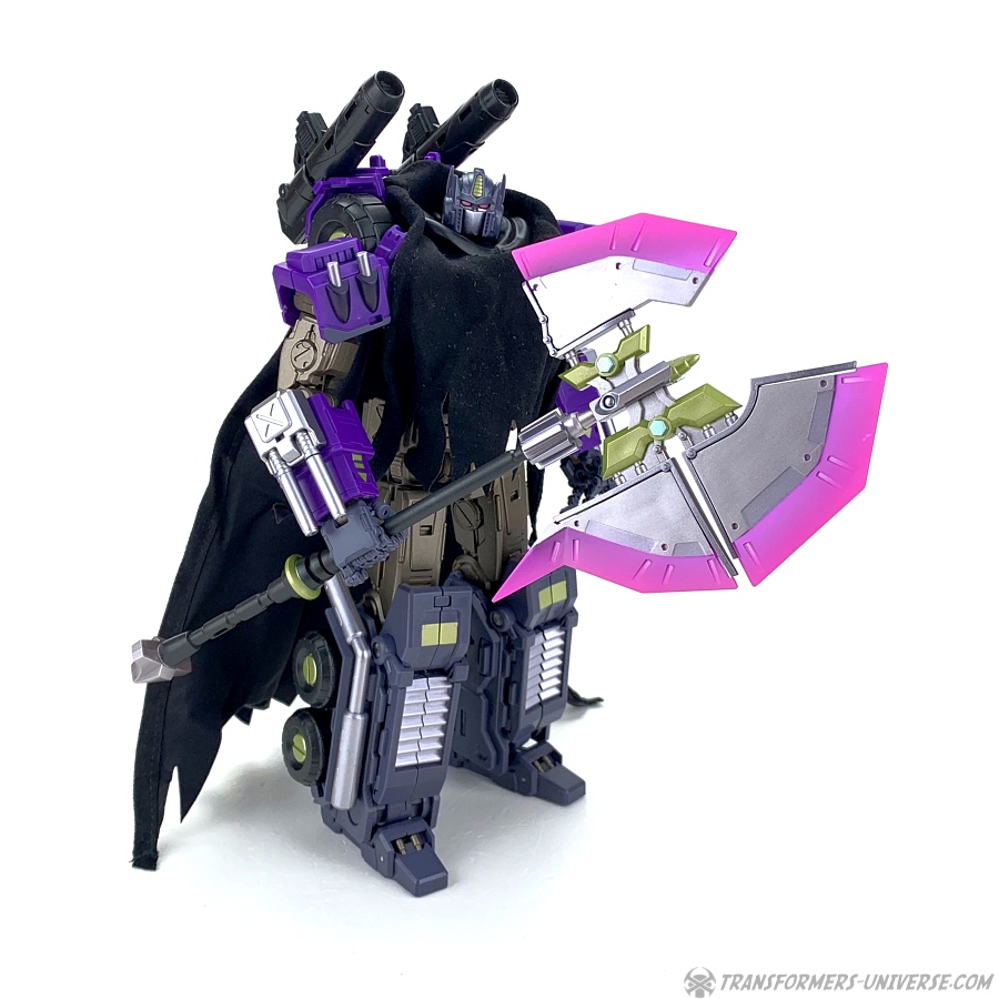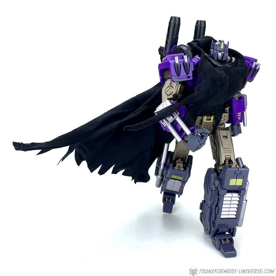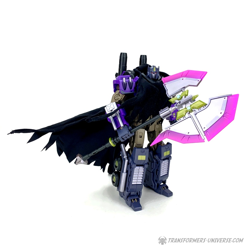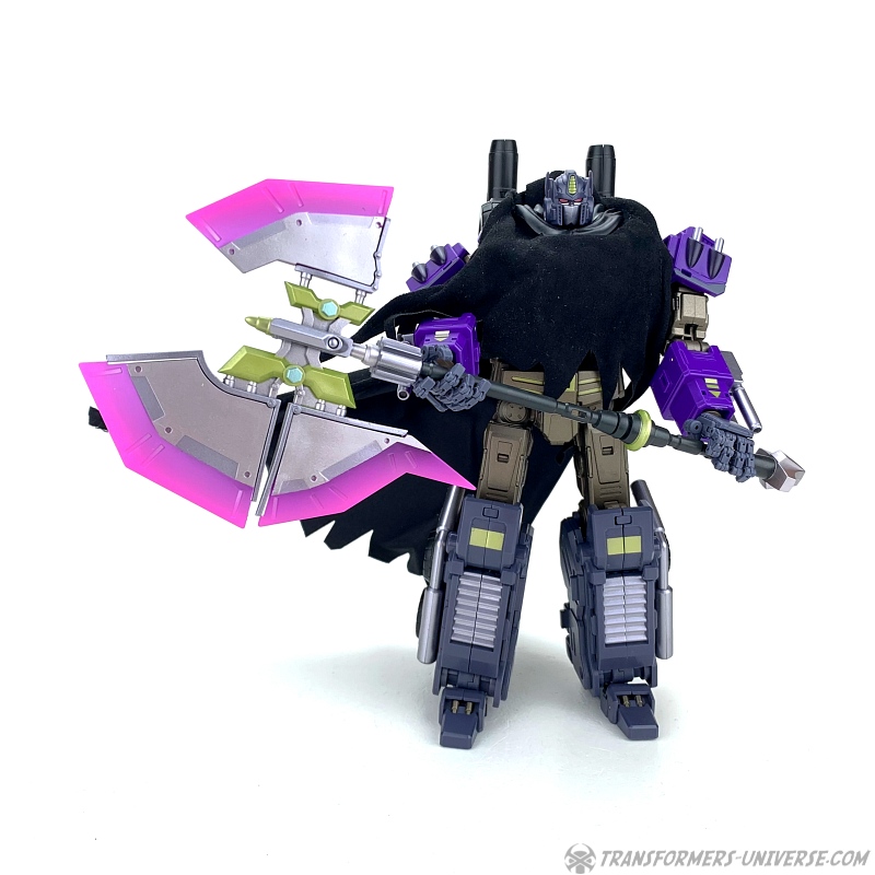 Optus comes with quite a few accessory parts. His main weapons – apart from the removeable smokestacks on his forearms – are two black blasters he can either hold in his hands or mount on his shoulders. I love the shoulder option, especially since the guns can flip up and forward. Very nicely done. He also carries a huge axe, as most Optimus figures do these days, which he can wield one- or two-handed with a long or short handle, your choice. To emphasize his evilness, he also comes with a black cape, complete with collar piece. The nice thing about the cape is that it contains wire, so you can move it into any shape you want. Very nice.