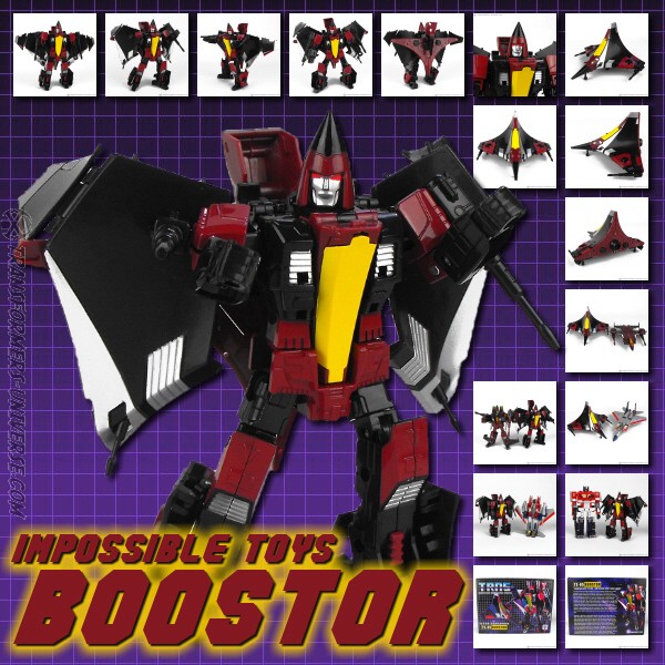 Prelude: Legal stuff first as always. Boostor here is not a figure released by Hasbro or Takara-Tomy and thus not officially a Transformer. He’s from Impossible Toys and clearly meant to be the Decepticon Seeker Thrust, but for legal reasons he can’t be called by that name.