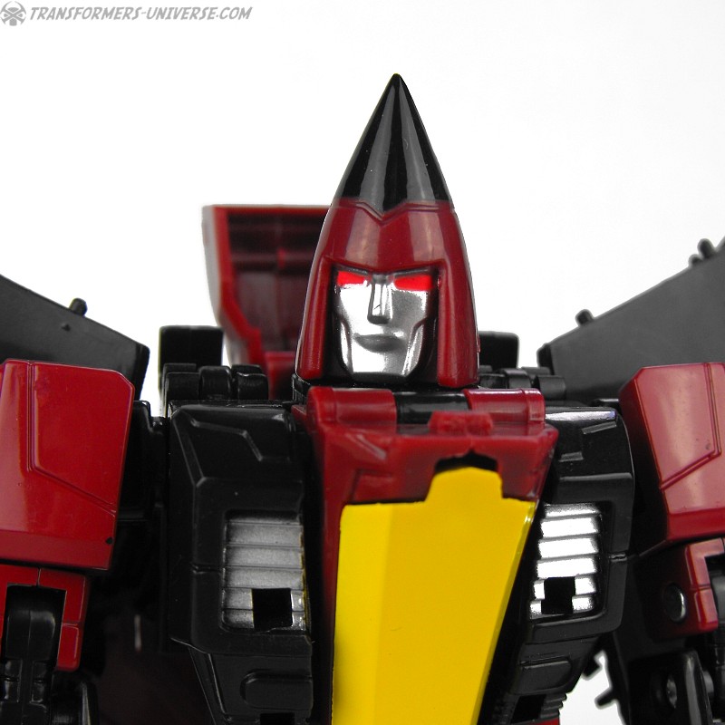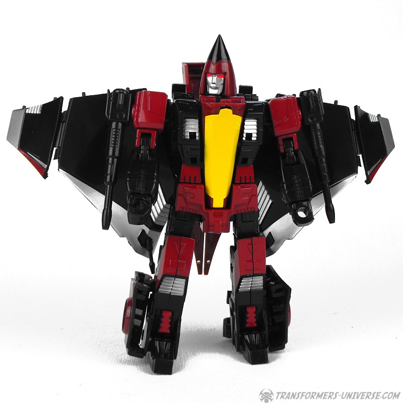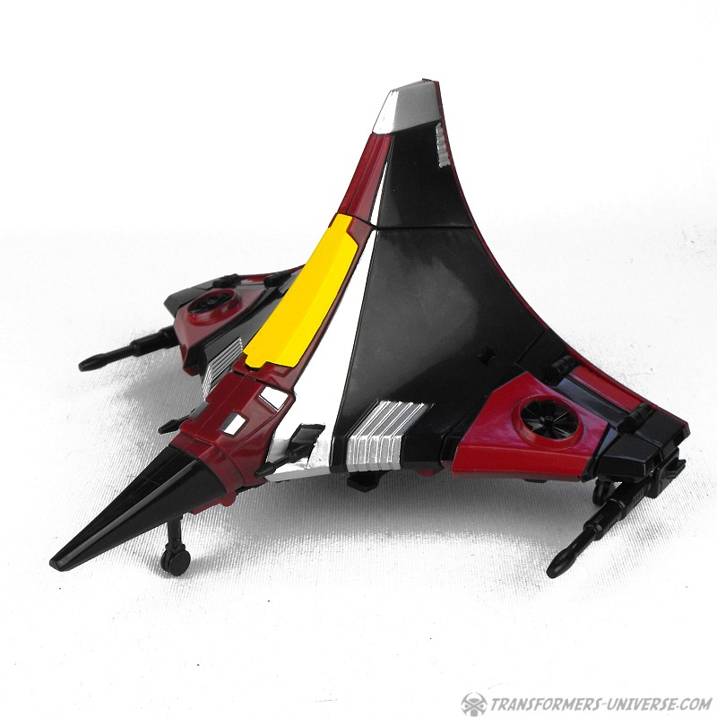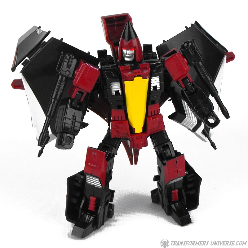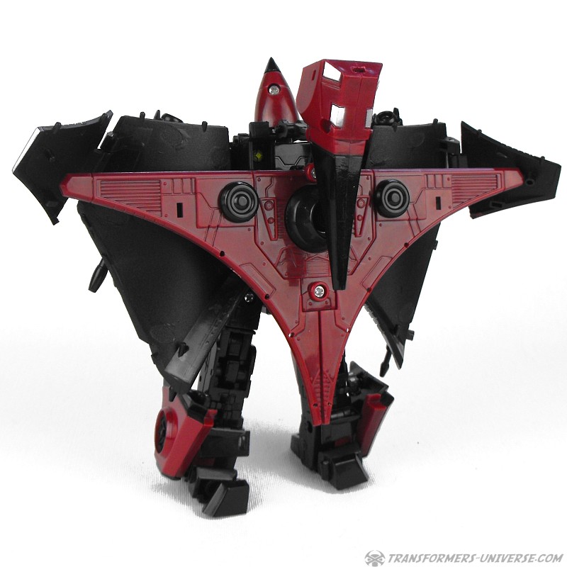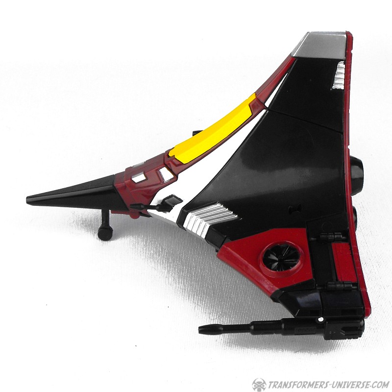 So yes, the robot as such heavily resembles G1 Thrust, except for the big wings and other kibble on his back. Basically the entire outer hull of his alternate mode is there, a big three-point piece that serves as the back of the aircraft, as well as the wings which form the sides. The result looks surprisingly good, though, as the big kibble parts are only really noticeable if you look at the robot from the back. From the front you do notice that he looks a bit different than your standard G1-style Seeker, but not much. So in terms of trying to create a figure from the (very difficult) animated template, I’d say mission accomplished.