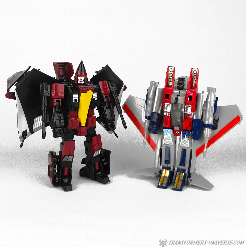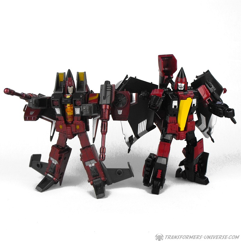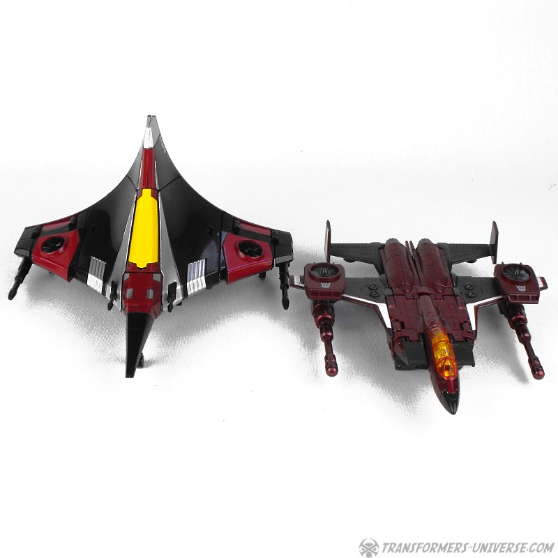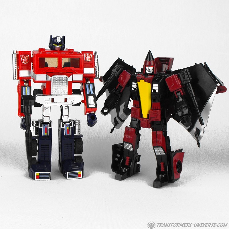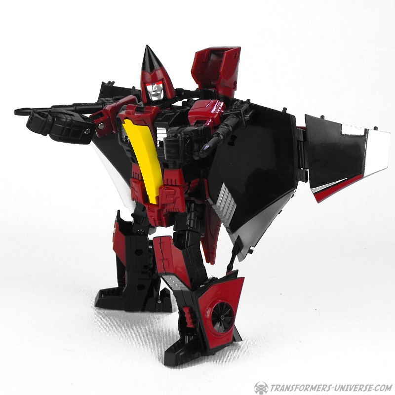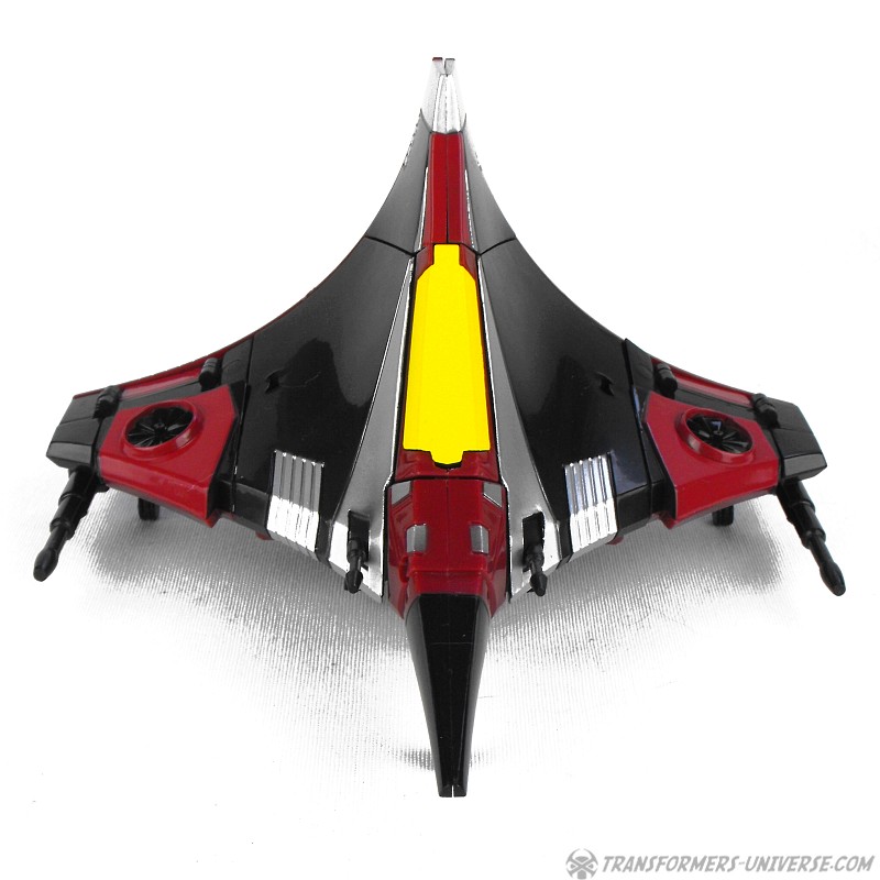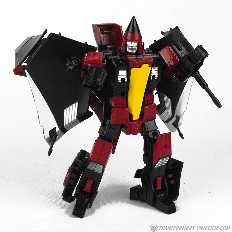 So yes, the robot as such heavily resembles G1 Thrust, except for the big wings and other kibble on his back. Basically the entire outer hull of his alternate mode is there, a big three-point piece that serves as the back of the aircraft, as well as the wings which form the sides. The result looks surprisingly good, though, as the big kibble parts are only really noticeable if you look at the robot from the back. From the front you do notice that he looks a bit different than your standard G1-style Seeker, but not much. So in terms of trying to create a figure from the (very difficult) animated template, I’d say mission accomplished.