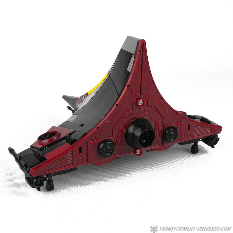 Alternate Mode: Boostor transforms into a three-sided flying pyramid, basically. The proper term is Tetrajet and it’s an alien aircraft that manages to look very cool and sleek, I must say. It takes quite some doing to line up everything and get all the panels clicking together properly, but the result looks pretty spiffy and could easily be at home in any given science fiction movie of your choice. The arm cannons go on the wing tips, a second set of smaller cannons is sculpted onto the hull, and everything fits together quite well. The craft has a landing gear as well, though getting the front wheel out requires very small fingers or some kind of tool for an aid. So all in all, a very good-looking alternate mode, no complaints here.