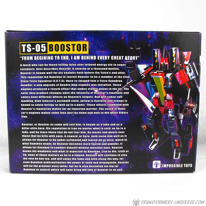 So basically, it’s the fault of the fans. Shame on you, fans. Anyway, a better explanation might be that Impossible Toys vastly overestimated the market for toys that adhere strongly to the original G1-style aesthetics, rather than the current Classics/CHUG-style figures Hasbro is banking on. As I write this review the Tetra jets are on clearance pretty much everywhere, which is also the reason I bought this one. I found the idea very interesting and wanted one in hand, choosing Boostor out of the seven available models was more or less incidental. Bottom line: a very nice idea, decently realized, but lacking the kind of mass appeal Impossible Toys was banking on, I guess. Recommended to G1-fans who can find it at clearance (pretty easy right now).