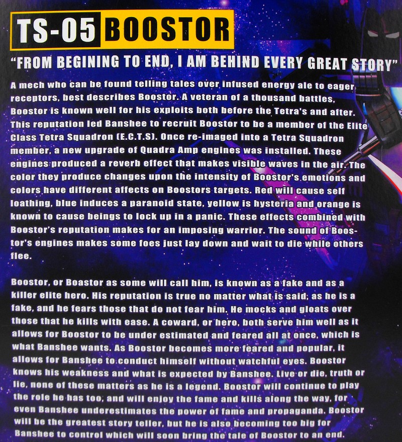 Robot Mode: Boostor and his Tetra Squadron mates are supposed to portray the Decepticon Seekers in their original form on Cybertron, as seen in the original G1 cartoon pilot and several later episodes. Which is a very thankless task, mind you, seeing as the Sunbow animators somewhat cheated by having all the Transformers in their Earth-vehicle-based robot modes already, even though they still transformed into alien alternate modes. Given that, it was pretty much unavoidable that Boostor and his mates would end up being shell-formers.