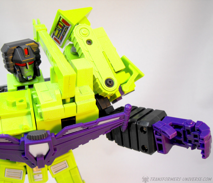 The new hip is the main part of the upgrade set, but far from the only one. The set also includes a new purple mixing drum for Mixmaster (apparently quite a few fans are kind of anal about the color of Mixmaster's mixing drum for some reason), a new chest shield for Devastator (not really that different from the original one, just a tad wider), a pair of new arms and two different heads. The arms are almost identical to the original ones in appearance, but they include elbow joints and articulated hands. The only downside to them is that you can't replace the fists with missiles, but again, a small price to pay. To go with the bigger hands, you also get a new rifle.