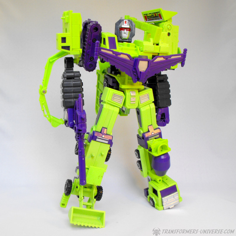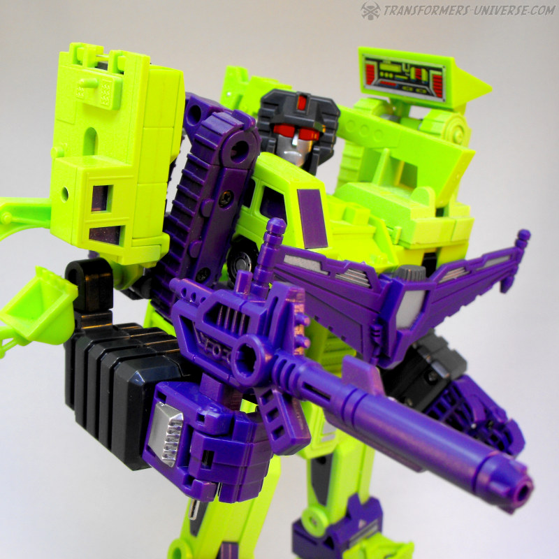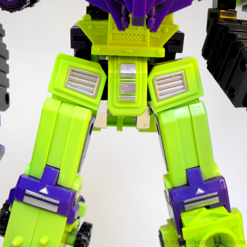 Upgrade Set: The biggest problem of G1 Devastator was his complete lack of lower body articulation. While the arms could move somewhat, he was a statue from the waist down. Junkion Blacksmith fixes that by giving him a completely new hip, complete with upper legs and knee joints. It has little to do with that purple plate Devastator originally had in that place and finally gives the big guy some leg movement. It also makes him a good deal taller, too. The only thing the new hip / waist can't do is attach to Long Haul in vehicle mode, but that's a small price to pay, I think.