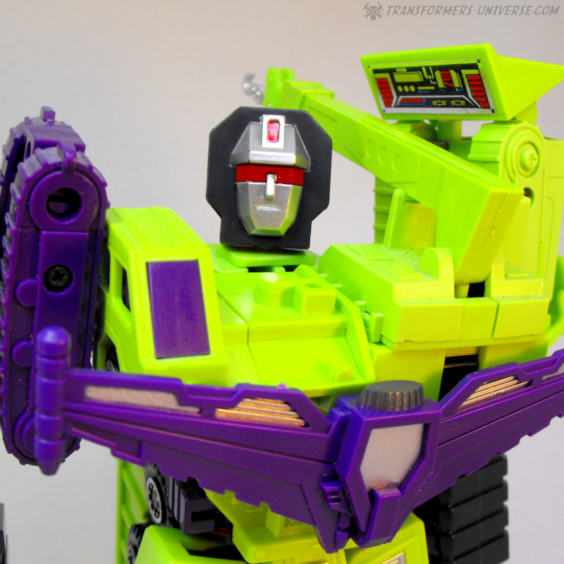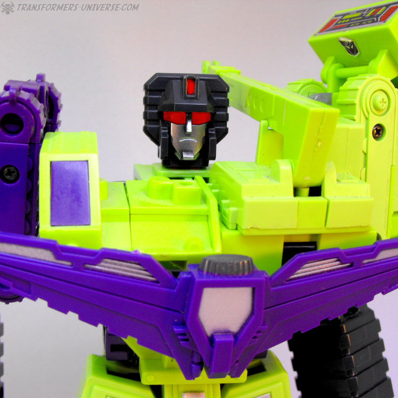 Finally the two new heads. Devastator had two vastly different animation models for his head in the original cartoon (sometimes switching within the same episode), so we got two heads you can chose from. Both look good, personally I like the one in the first few pictures the best, but that's really a matter of taste. Both heads are on a neck joint, so Devastator can look around now. So the bottom line: an all-around great improvement to the G1 combiner. Just about the only downside being that not all the new parts can attach to the vehicle modes of the Constructicons.
