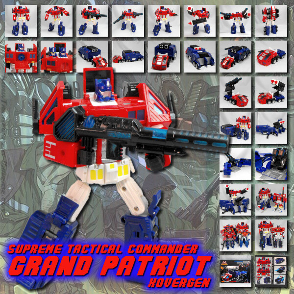 Prelude: Grand Patriot is, of course, supposed to be Optimus Prime, but being a toy made by a third party manufacturer instead of Hasbro or Takara-Tomy, it can’t be called that. GP is a rather broad homage to the various Transformers / GI Joe crossovers we’ve seen over the years, but not to any specific one. There are two versions of this figure, one in Optimus’ classic red, the other in military green.