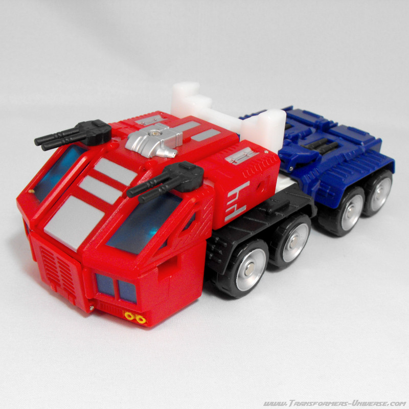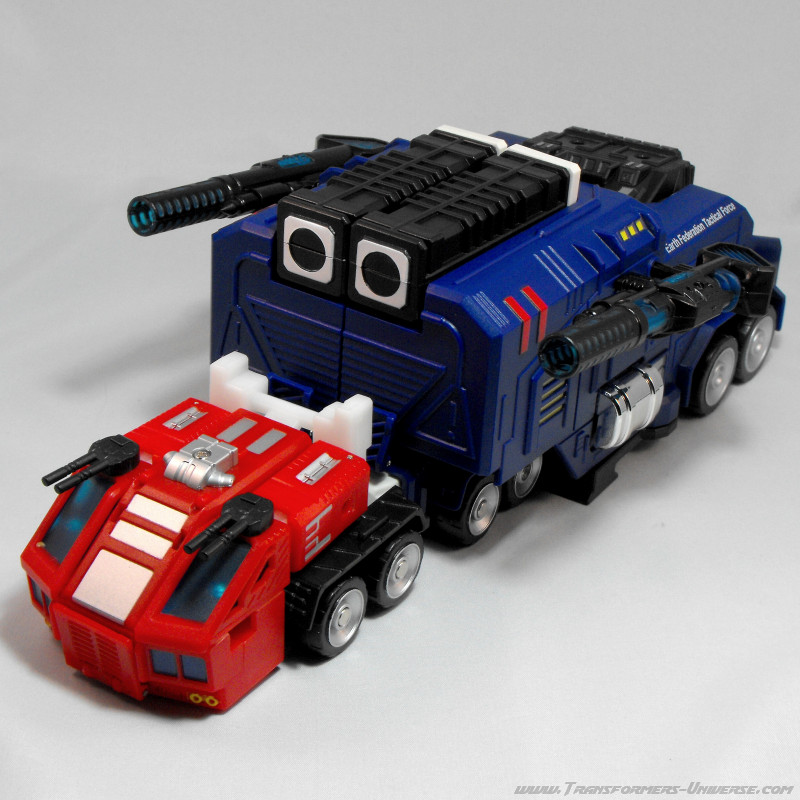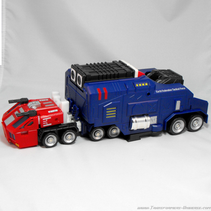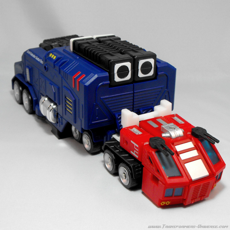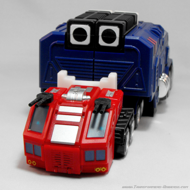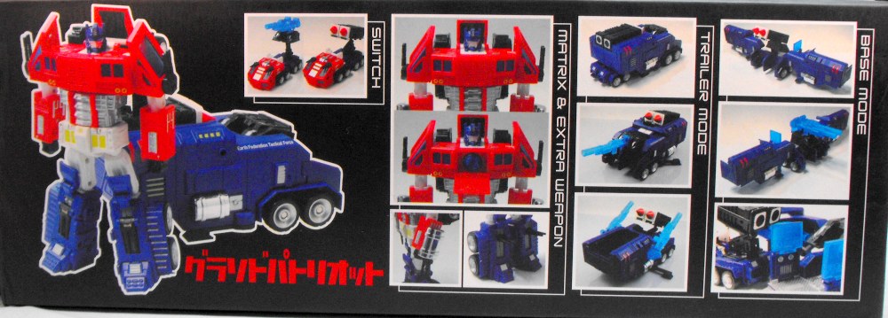 Vehicle Mode: Grand Patriot transforms into a truck-like vehicle based on the GI Joe "Rolling Thunder" military assault transport, a toy originally released in 1988. I never owned that particular vehicle and only know it from pictures, so all I can say here is that there is some resemblance (more so in the green version of Grand Patriot, of course, seeing as that’s the color of the original Joe vehicle, more or less). The actual GP robot becomes the red tractor of this vehicle, while a blue trailer makes up the rest.