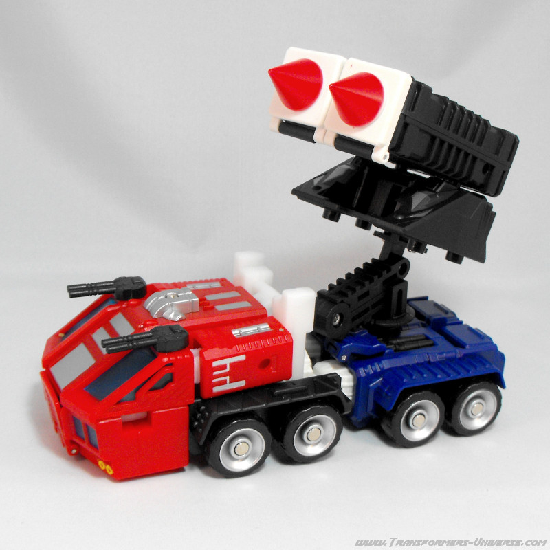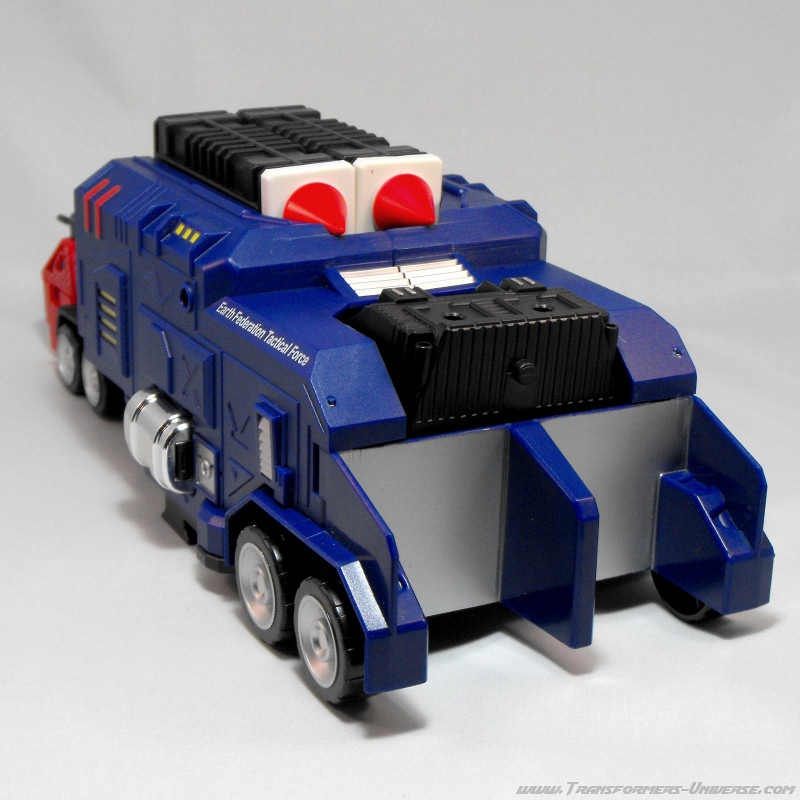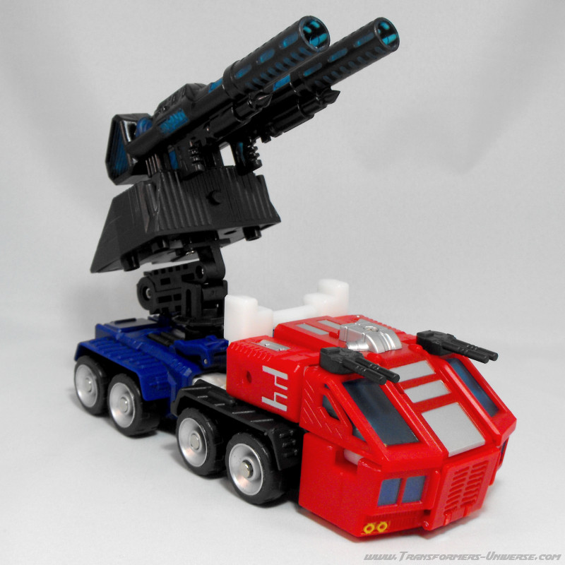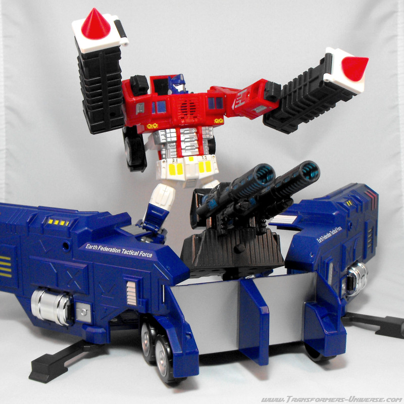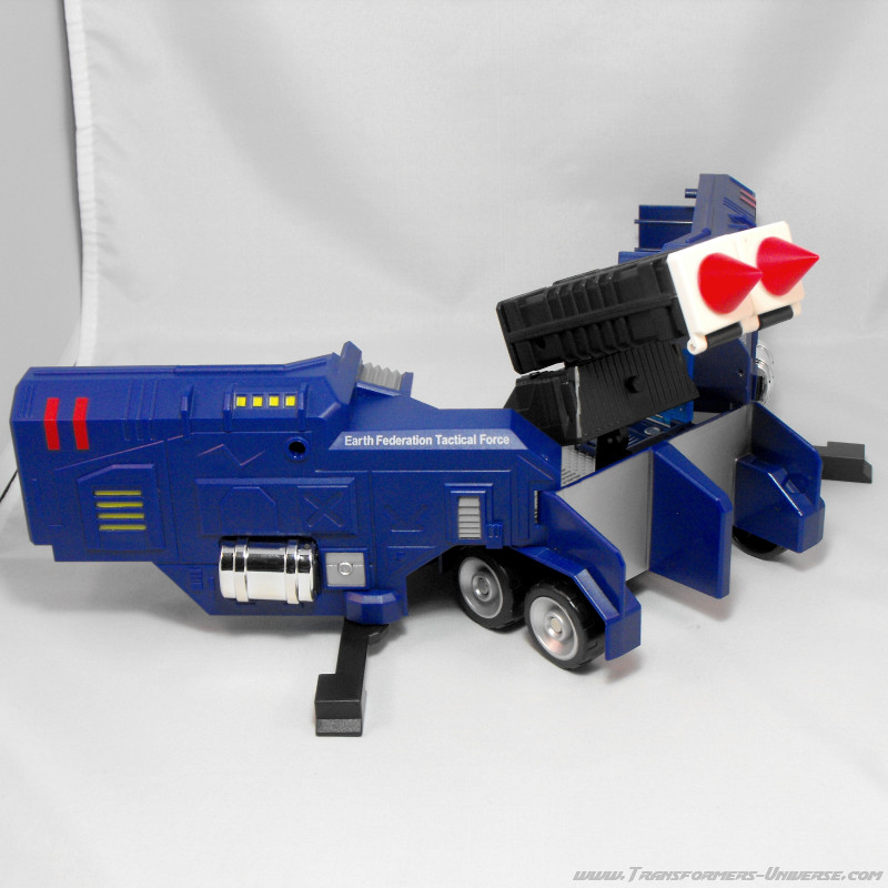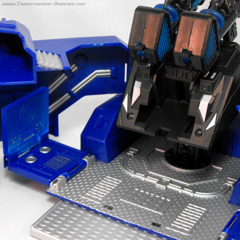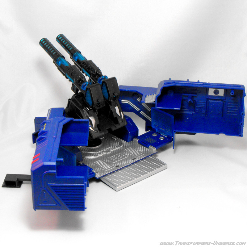 Station Mode: Grand Patriot’s blue trailer can open up into a battle station. You basically just pull the two halves apart, somewhat similar to the battle station trailer of G2 Laser Optimus Prime. You now have the fixed turret in the center, while the detachable one can remain on either side or be left out. You can mount either the missiles or the rifles on either turret, it’s up to you. The inside of the station isn’t terribly intricate, the only thing worth mentioning are the two fold-out translucent screens on either side of the central platform. Not much more I can write here. It’s a decent battle station, but no more than that.