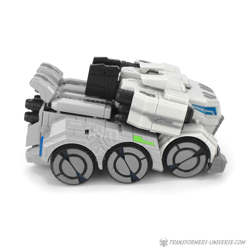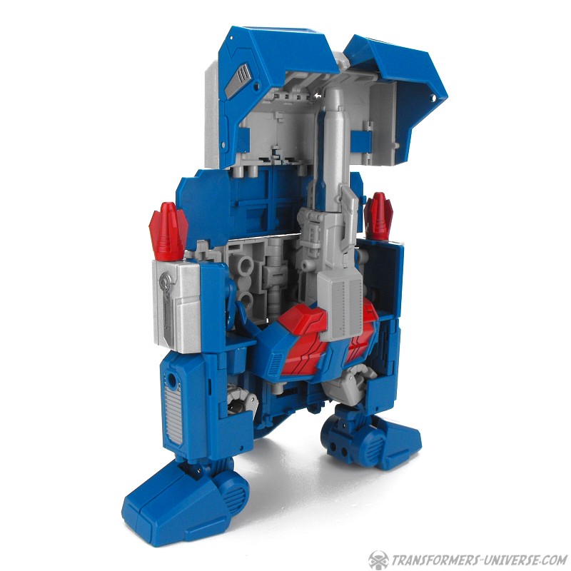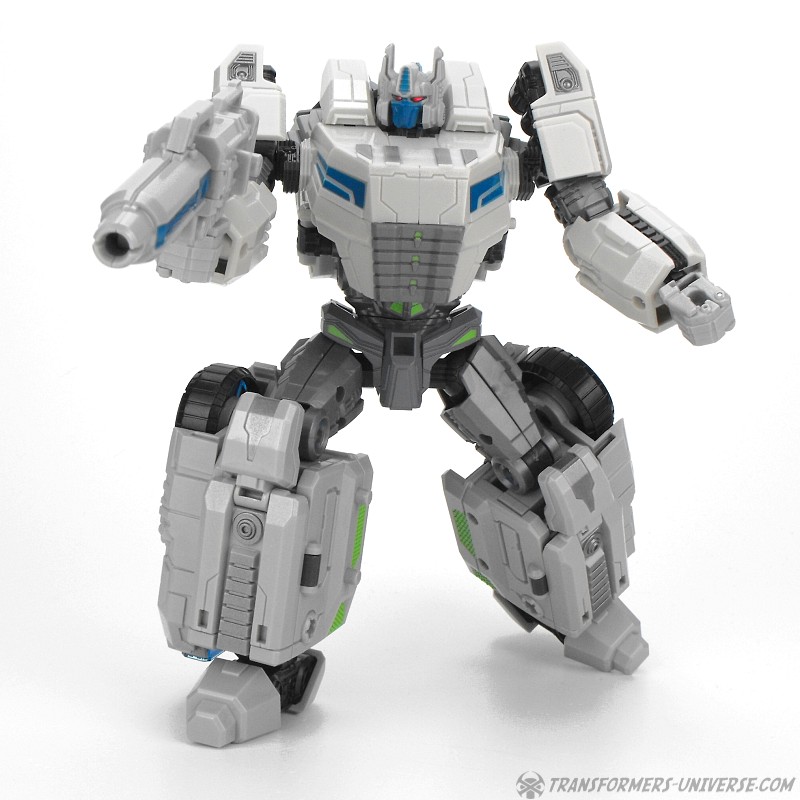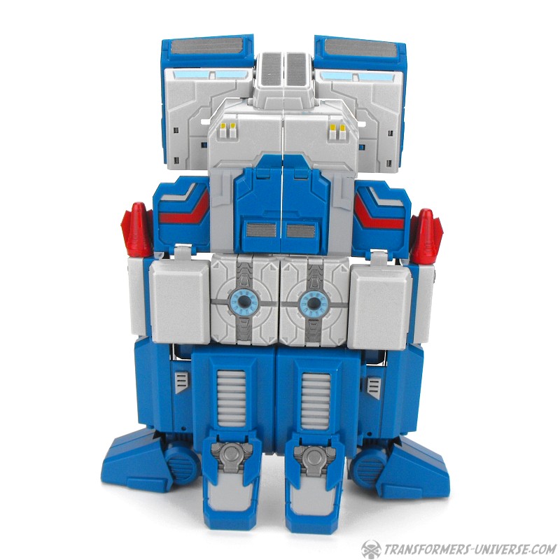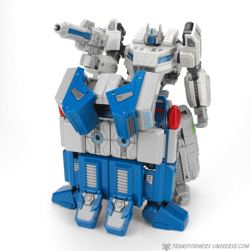 Robot Mode: Apollo’s standard robot mode is a repaint of Planet X’s previous Jupiter figure, based on Fall of Cybertron Optimus Prime. The figure is about Voyager-sized, I’d say, and looking very powerful. Like quite a few Ultra Magnus figures that are repainted from Optimus Prime figures he is mostly white with several blue highlights. He also sports some green highlights, though, referencing Minimus Ambus from Combiner Wars and the IDW Comics.