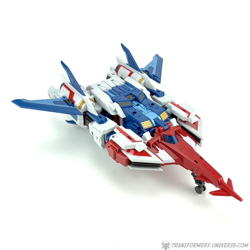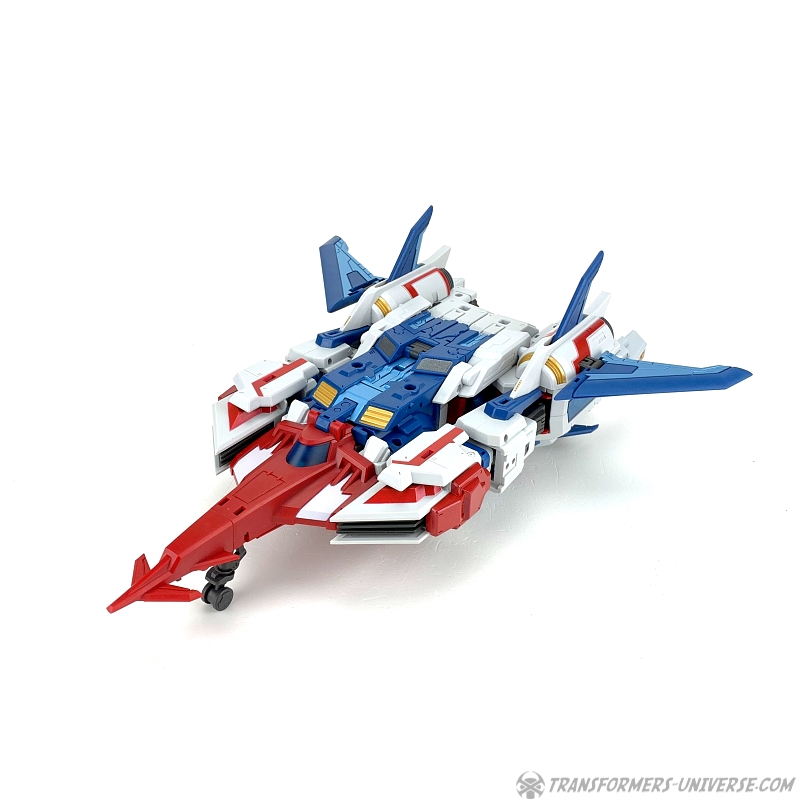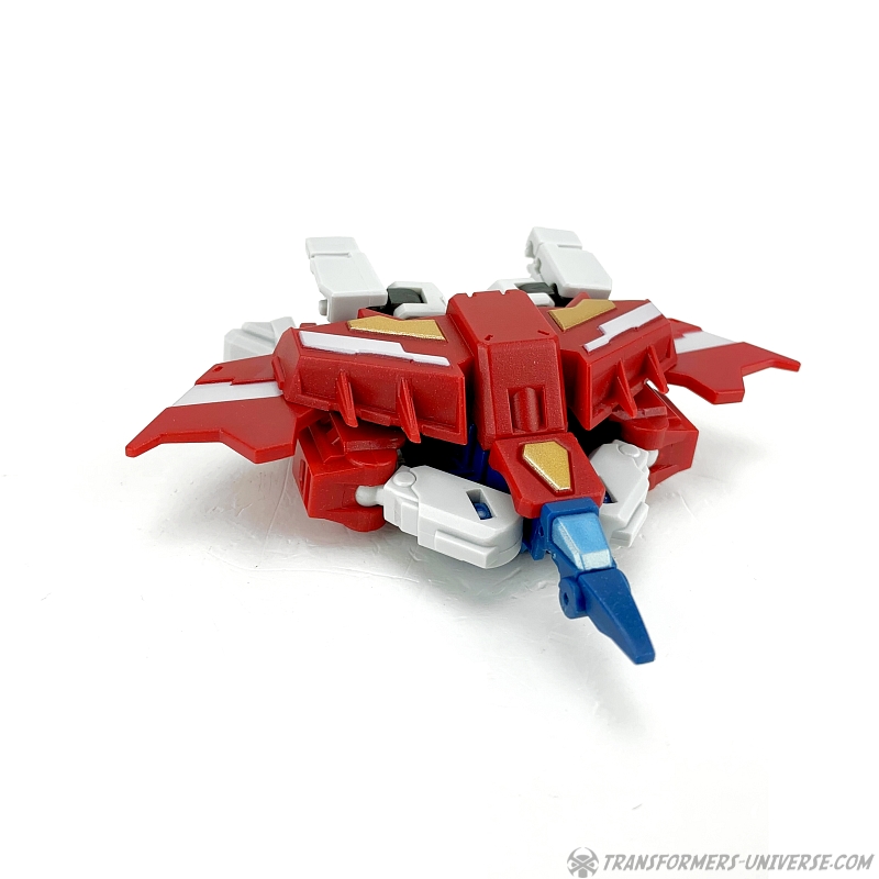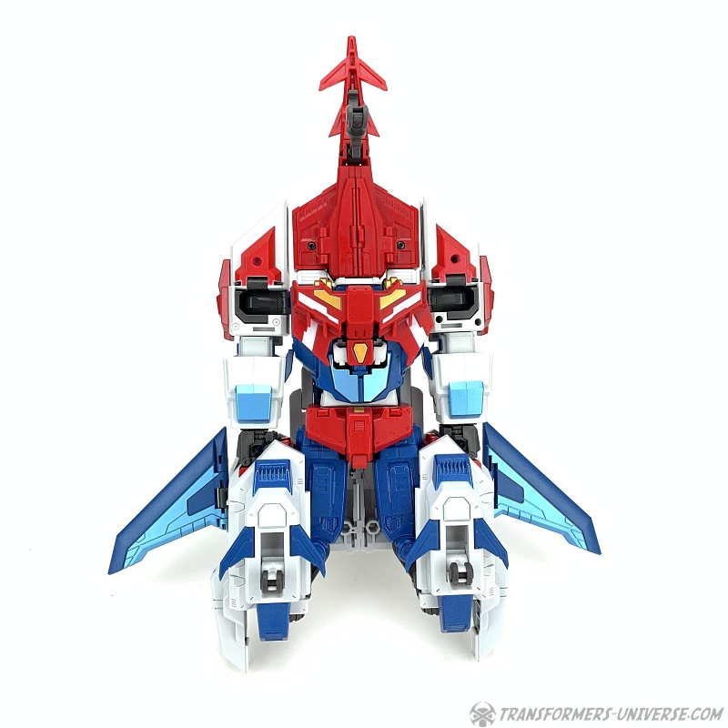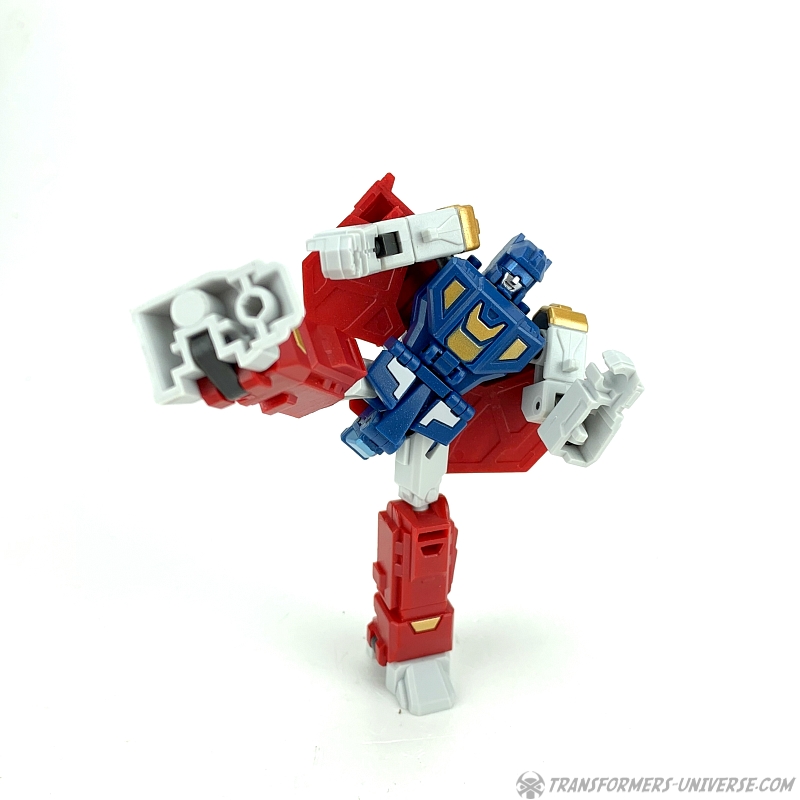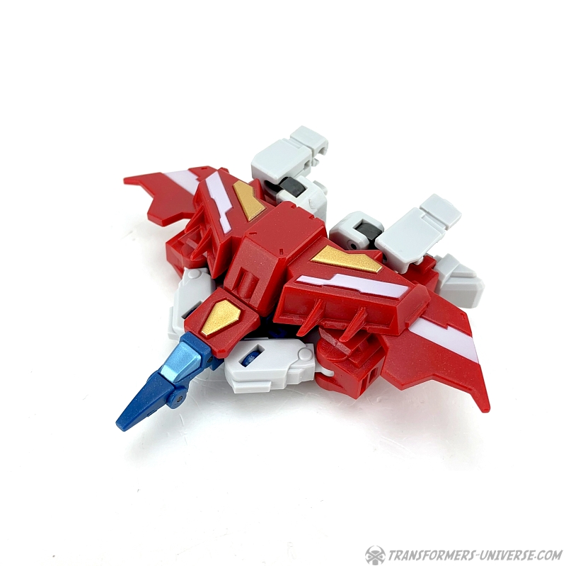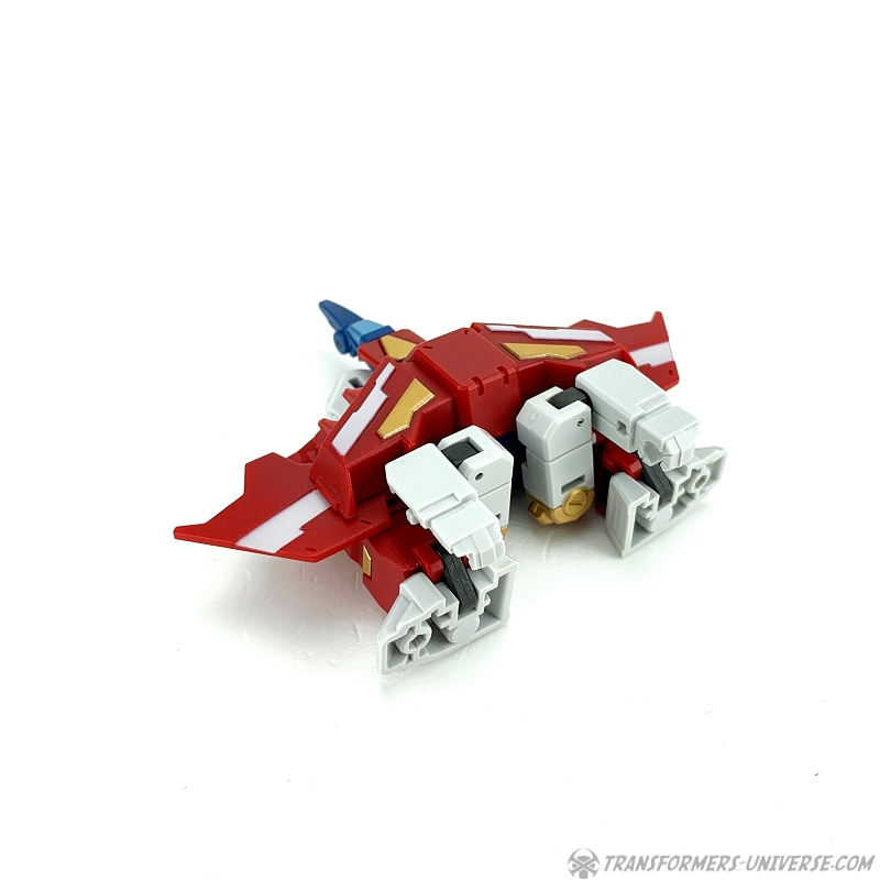 Kadmos transforms into a huge science fiction space jet and can do it without having to remove the smaller robot, too. The resulting jet looks very cool, no complaints, and holds together pretty well, too. The transformation is more or less identical to that of the original Star Saber and easier than it looks in the instructions, too. The jet has a fully functional landing gear and the only visible robot bits are the hands, which are only recognizable from the underside. So bottom line: a great larger robot that transforms into a great space jet. This is definitely the reason to buy this figure.