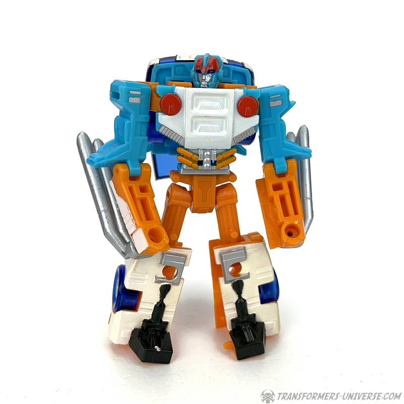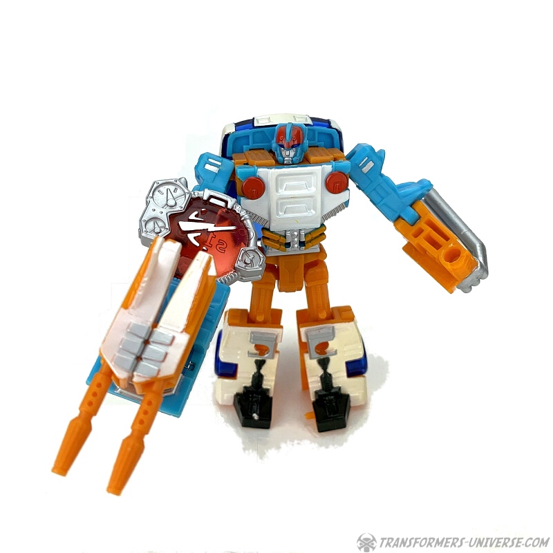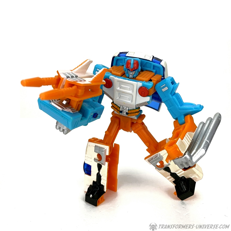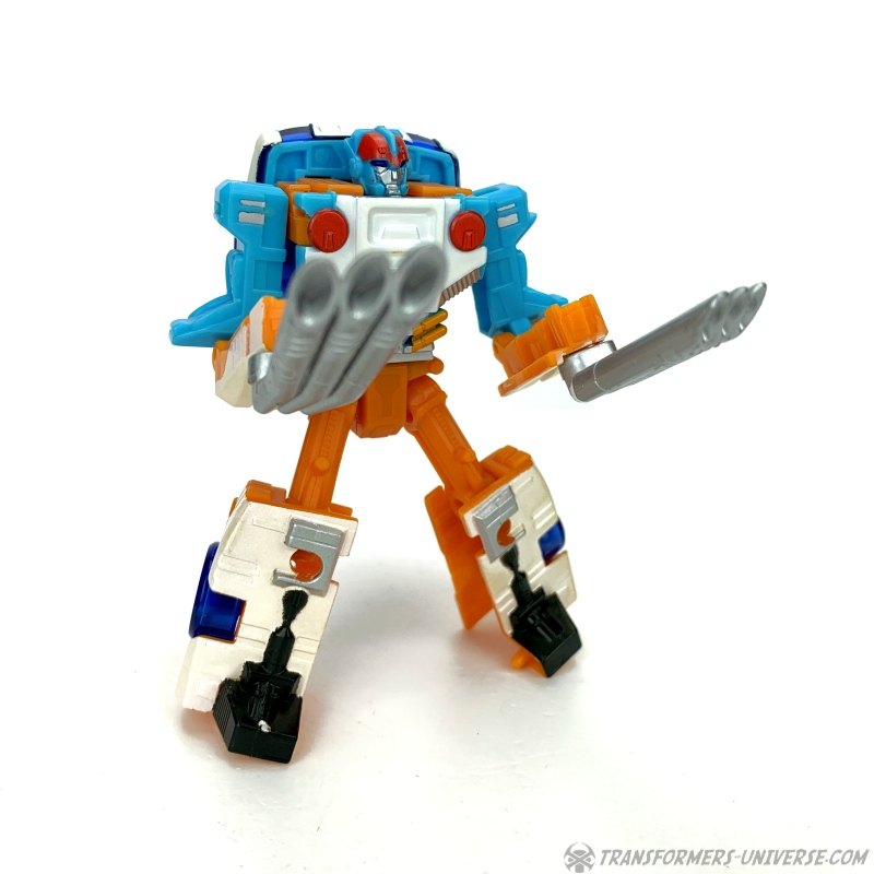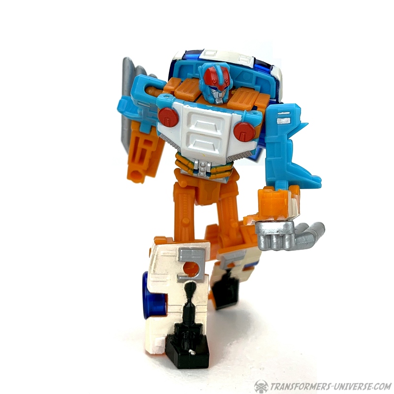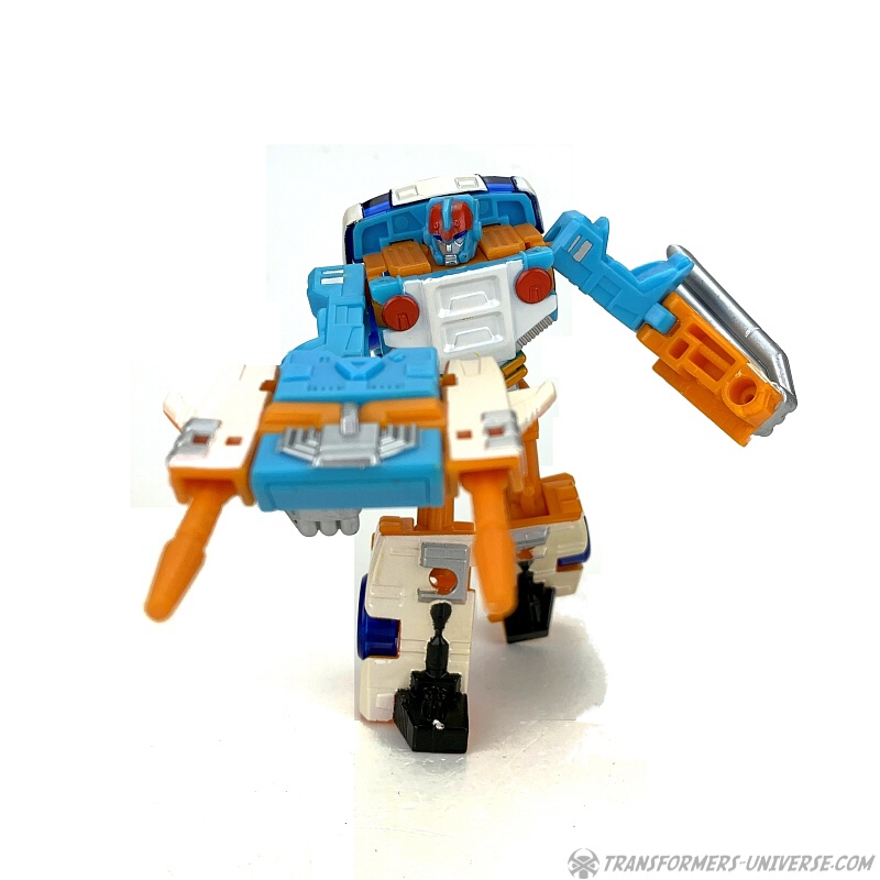 Robot Mode: A basic-sized robot, Clocker makes a solid appearance with good posibility, nice detailling and some fun gimmicks. Apart from his gun, which can flip up when activated by the Cyberkey, he has the smoke stacks on his forearms that can flip forward like oversized claws. The colouring fits him, too, and he is an all-together nice package in robot mode.