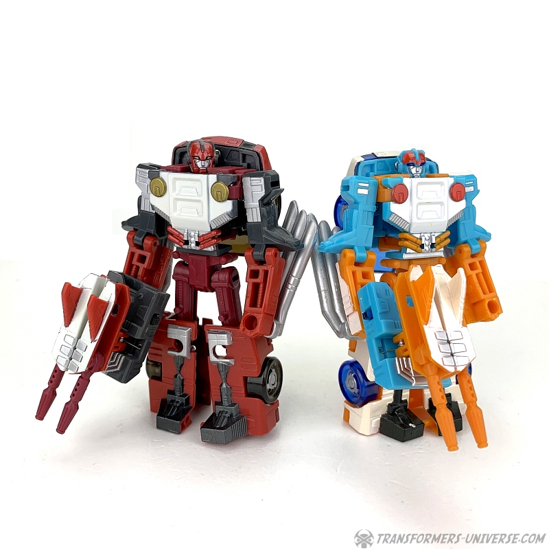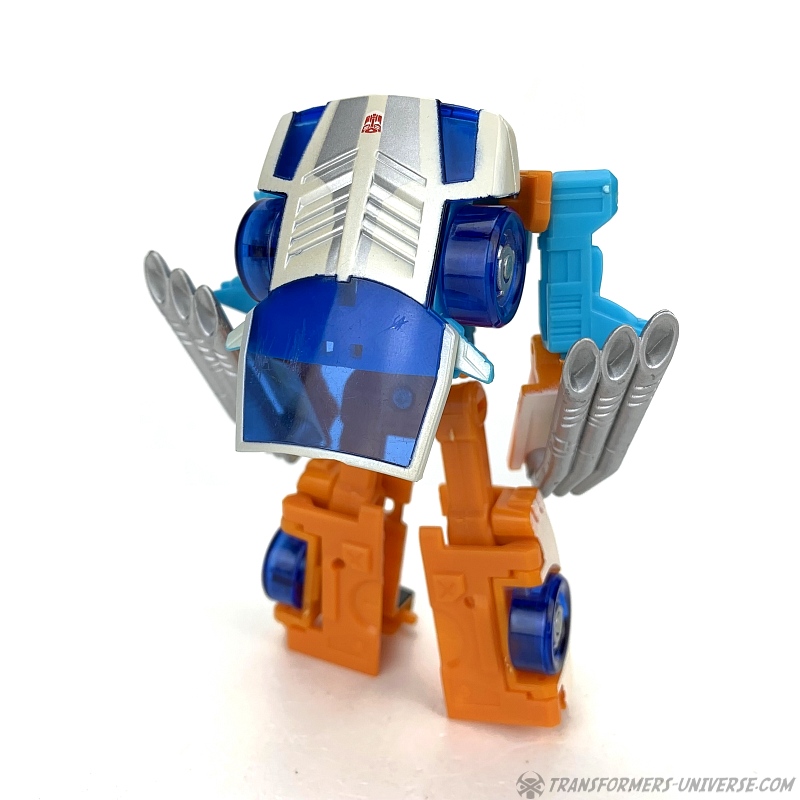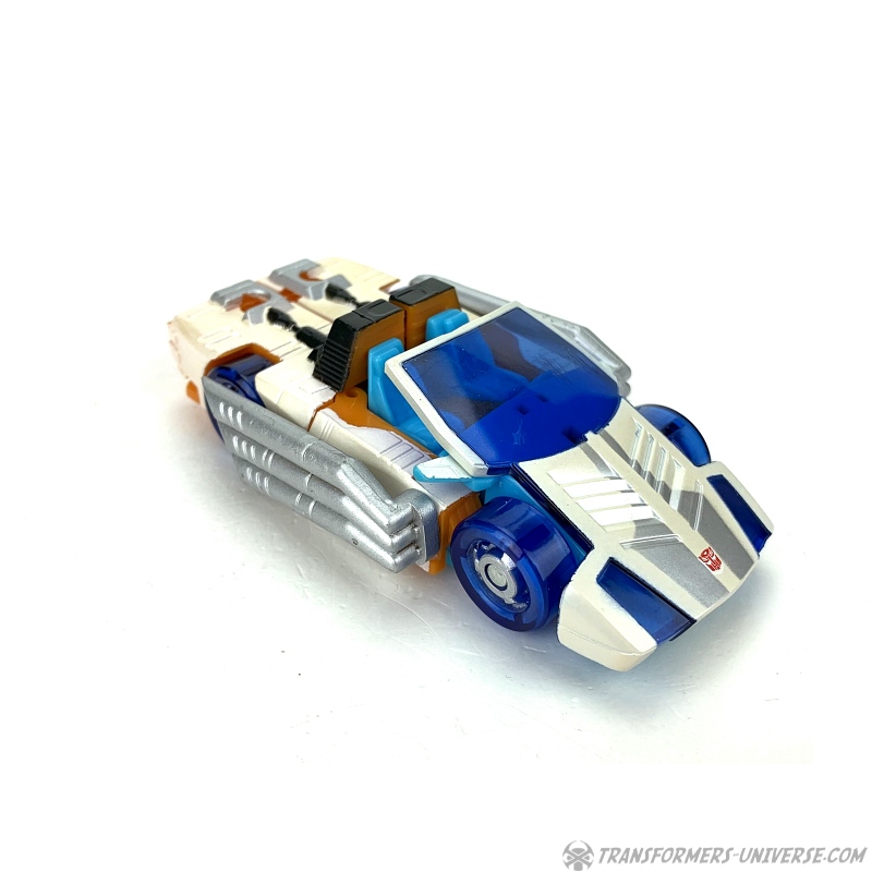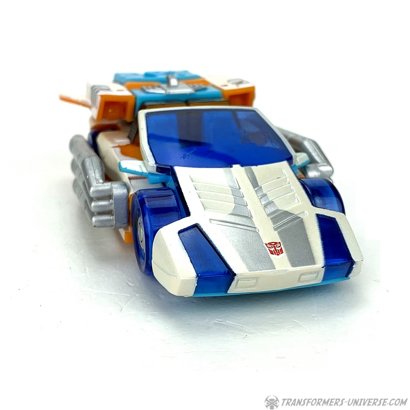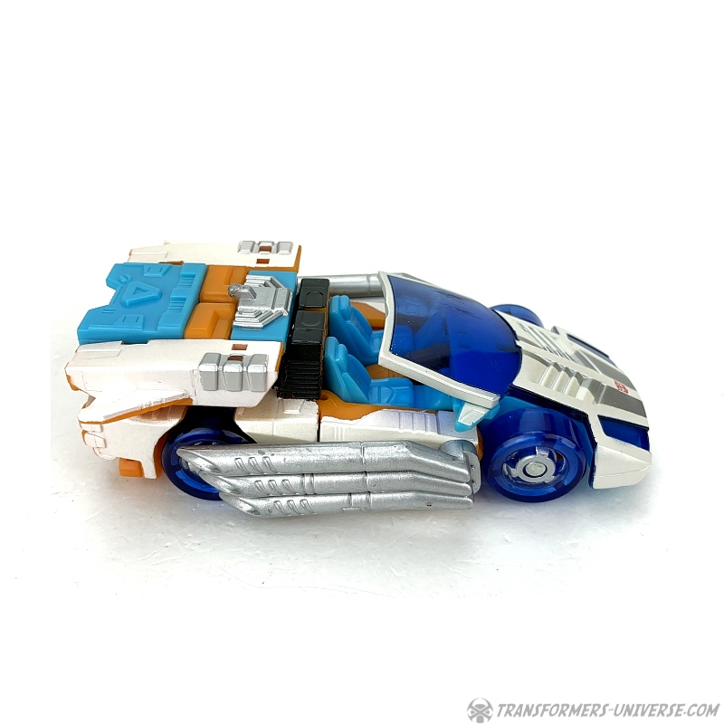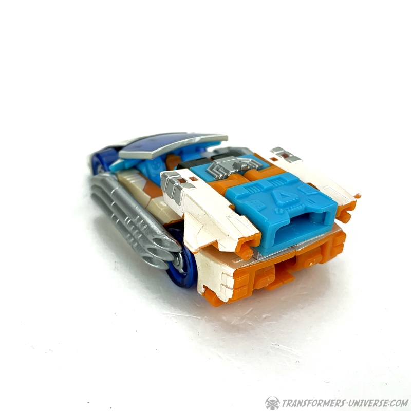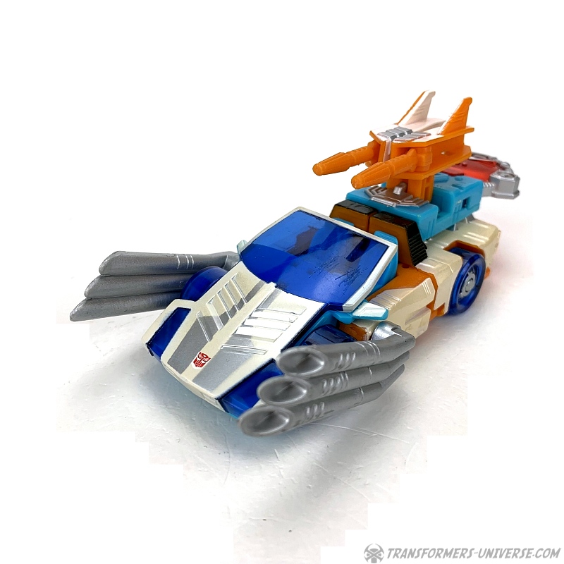 Alternate Mode: Clocker transforms into an open racing car and does a pretty good job. The car doesn't look a hundred percent realistic to me, the front part a bit too narrow in regards to the middle and the back, but all in all it doesn't look half-bad. The gun is now the trunk and can activate here as well, while the smoke stacks run along the sides and can flip forward for attacks. Bottom line, a nice car mode that could have been a bit more streamlined, I think.