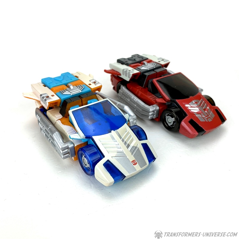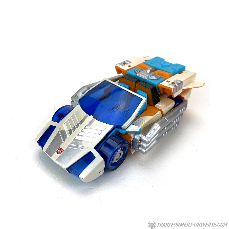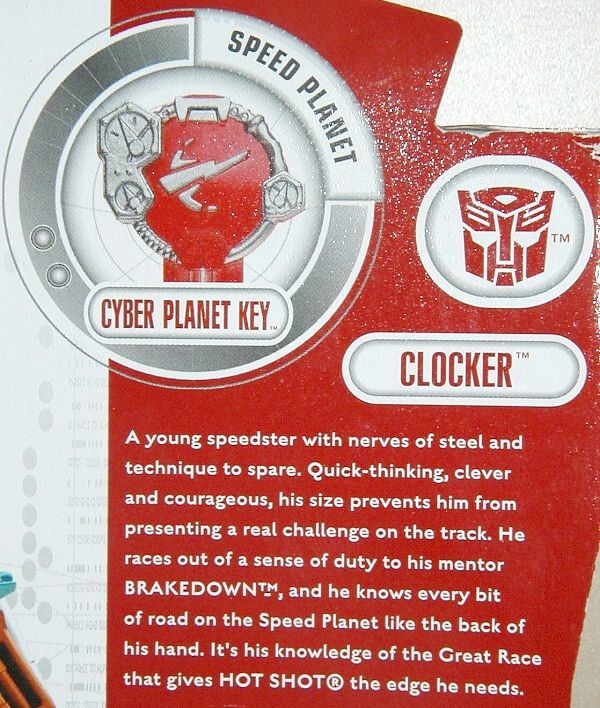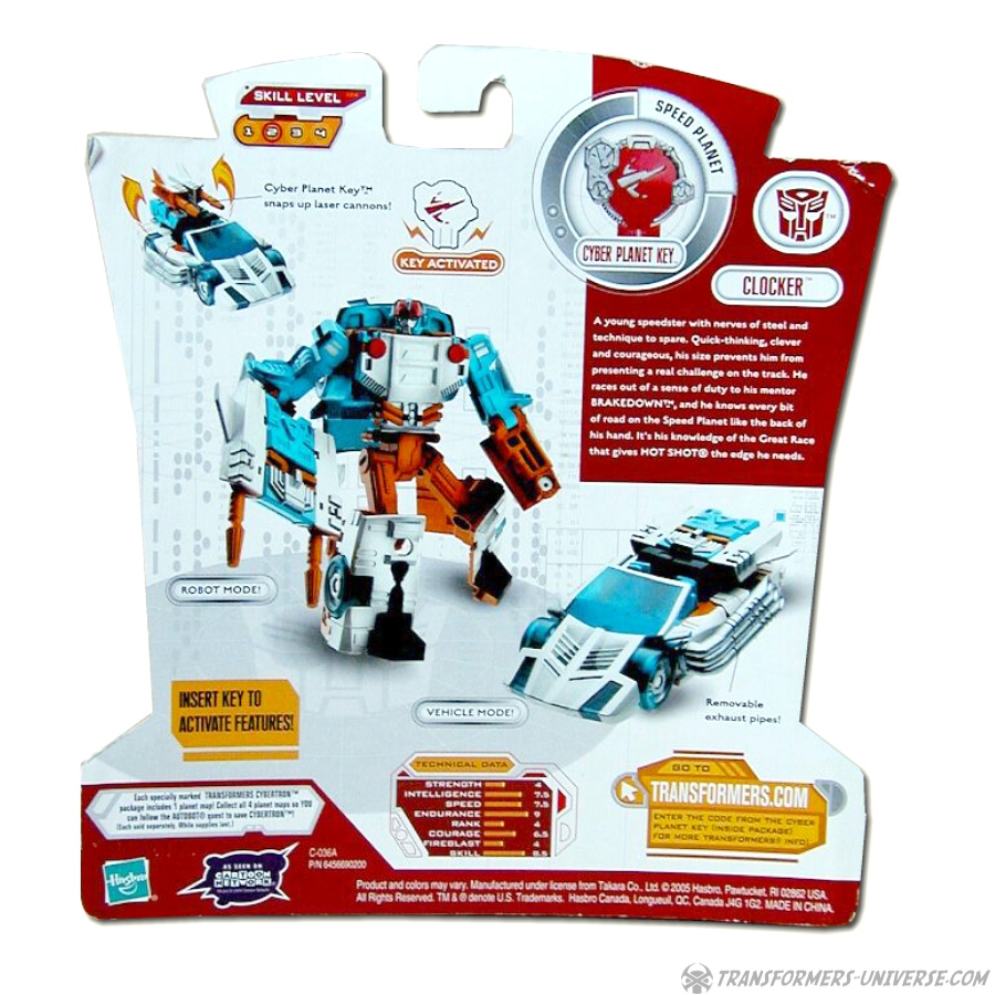 Remarks: Clocker didn't play any sort of major role in the Cybertron cartoon series. He was a student of the aging speedster Brakedown and aided Hot Shot in the Great Race, but that's pretty much it. As a toy, though, Clocker is solid. He makes the best out of a basic-sized frame that has to incorporate the Cyberkey gimmick and walks away a nice little car Transformer that I can recommend to all Cybertron fans.