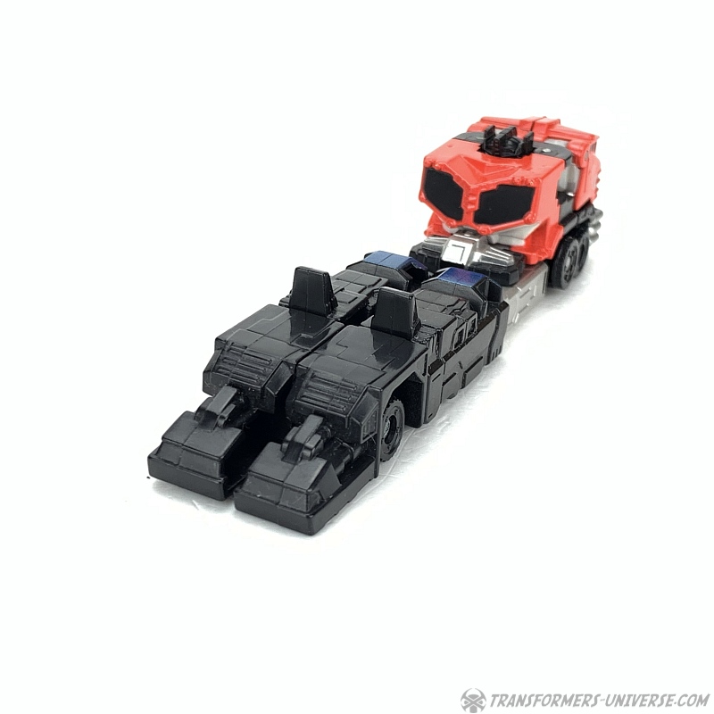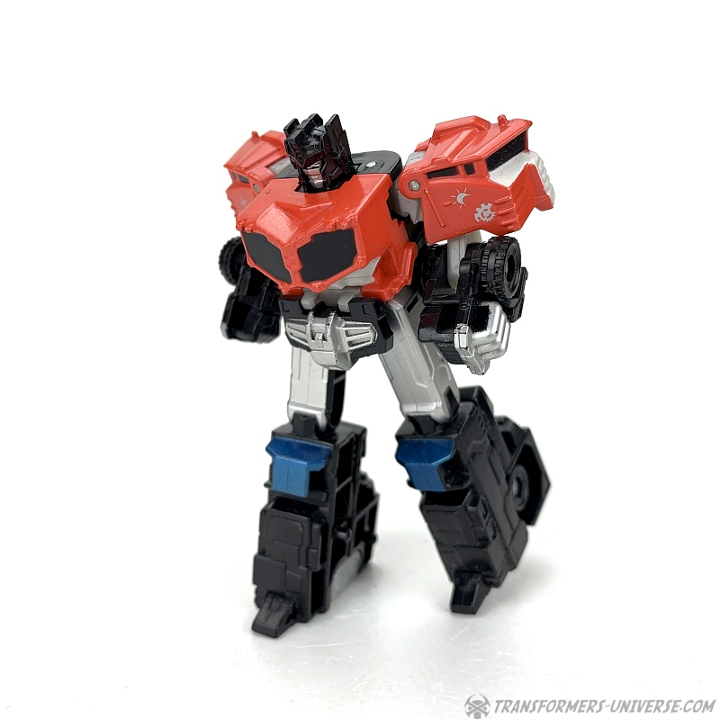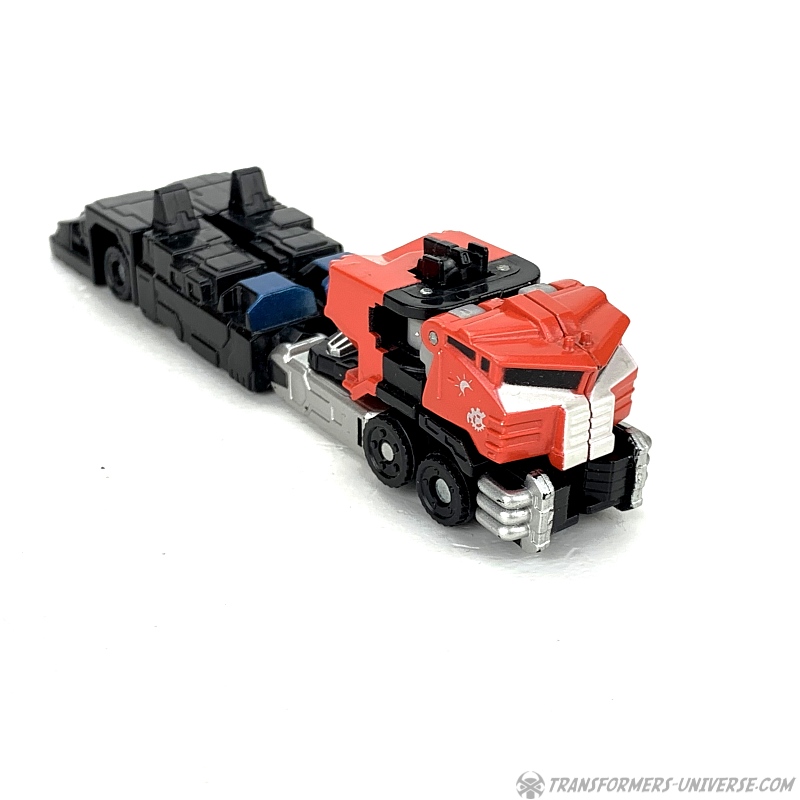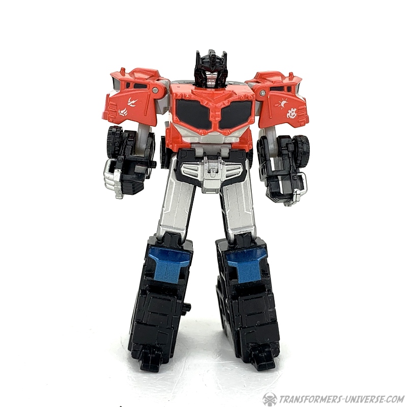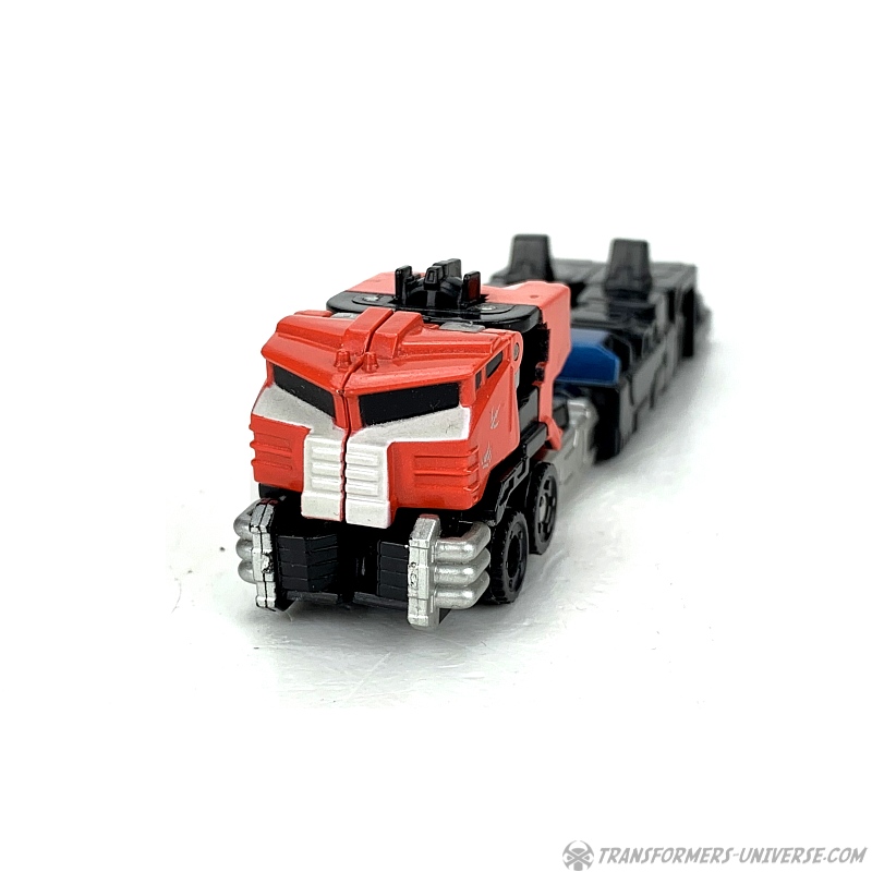 Alternate Mode: Optimus' truck mode is about as good as that of the bigger version, meaning: not so good. Judged solely in terms of being a decent miniature of the big version, though, it's doing a good job. Taken on its own merit, though, the lack of a trailer makes the flaws of this mode (too-long rear) even more obvious than with big Optimus.