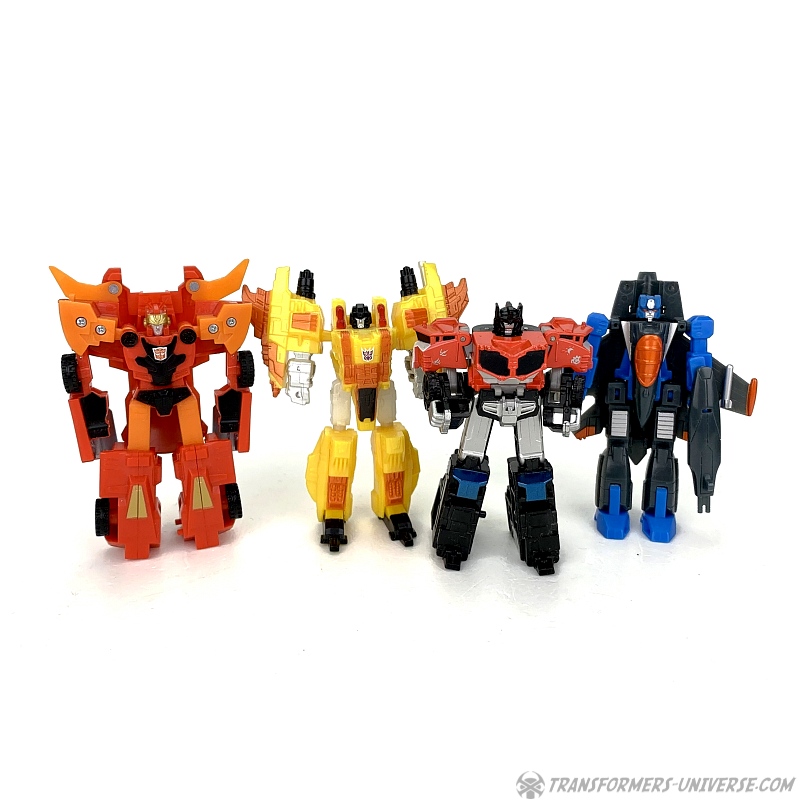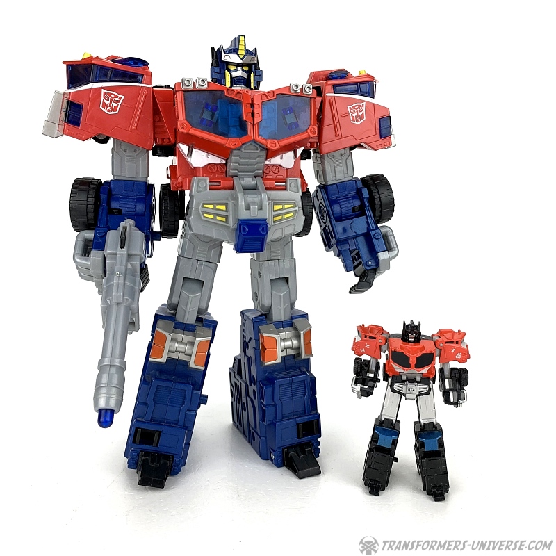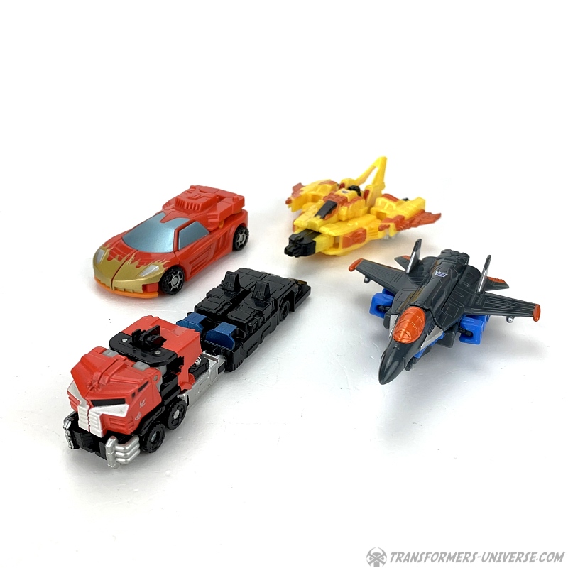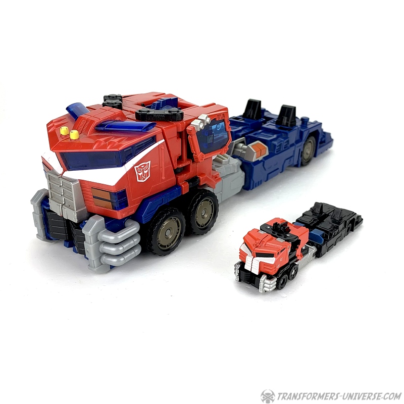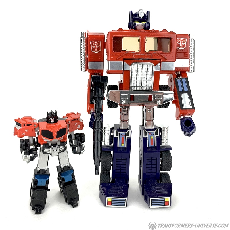 Alternate Mode: Optimus' truck mode is about as good as that of the bigger version, meaning: not so good. Judged solely in terms of being a decent miniature of the big version, though, it's doing a good job. Taken on its own merit, though, the lack of a trailer makes the flaws of this mode (too-long rear) even more obvious than with big Optimus.