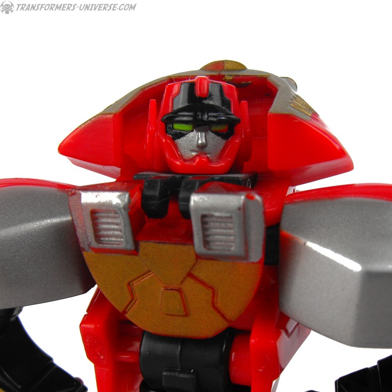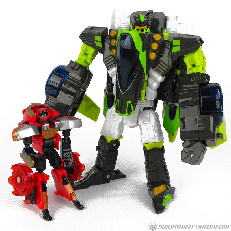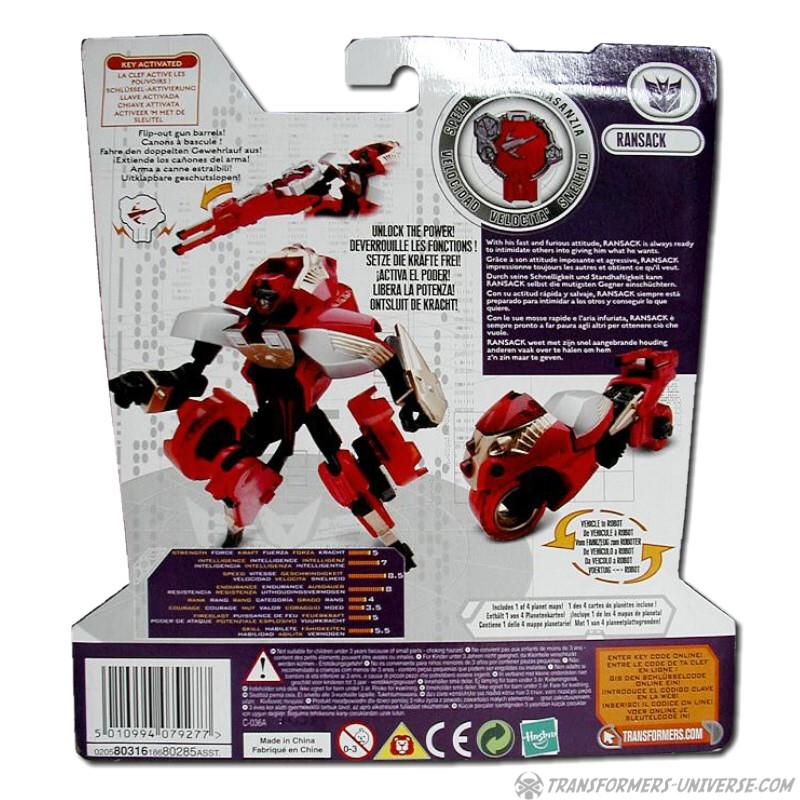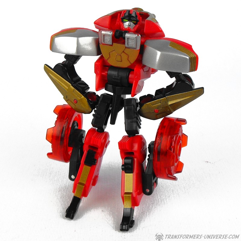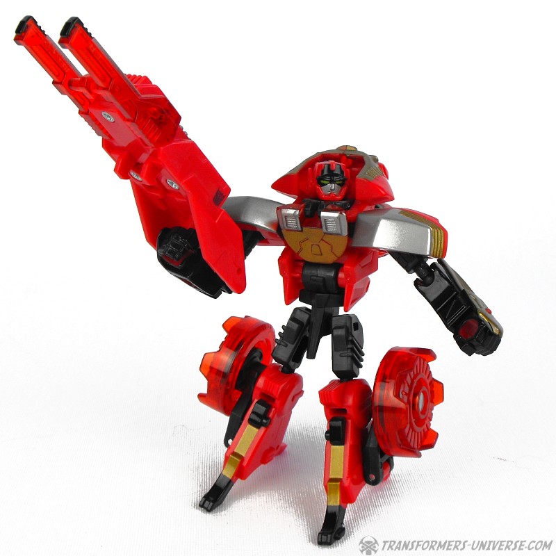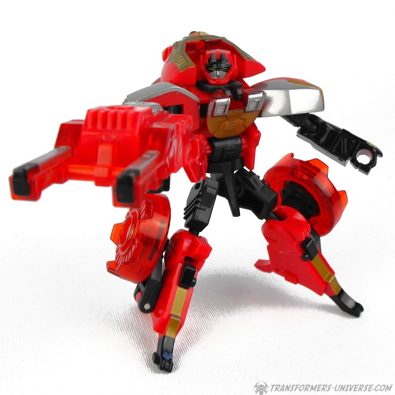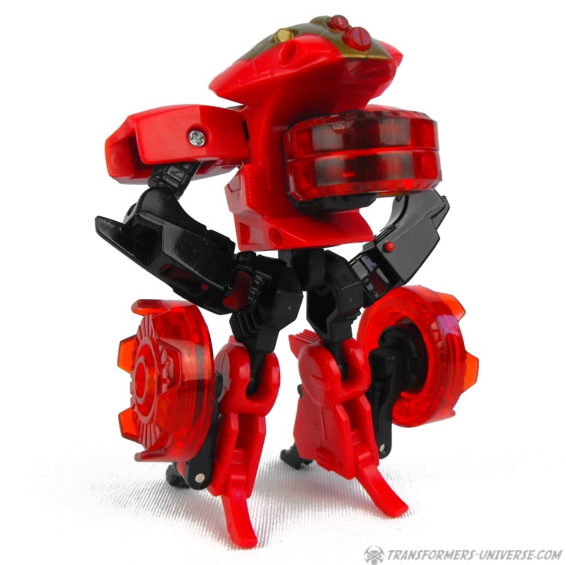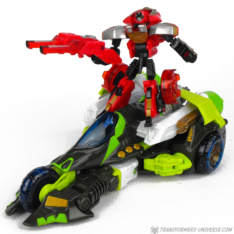 Robot Mode: Ransack in robot mode captures the image of his cartoon character almost perfectly. Small, nimble, a constant smirk on his face, and seemingly looking for trouble all the time. His posability is excellent and I just like his look very much. His weapon, when activated by his cyber key / force chip is pretty big, but that fits his image, too. Looking at how some of the other Transformers who have motorcycle alt mode look, he is probably the best biker bot ever.