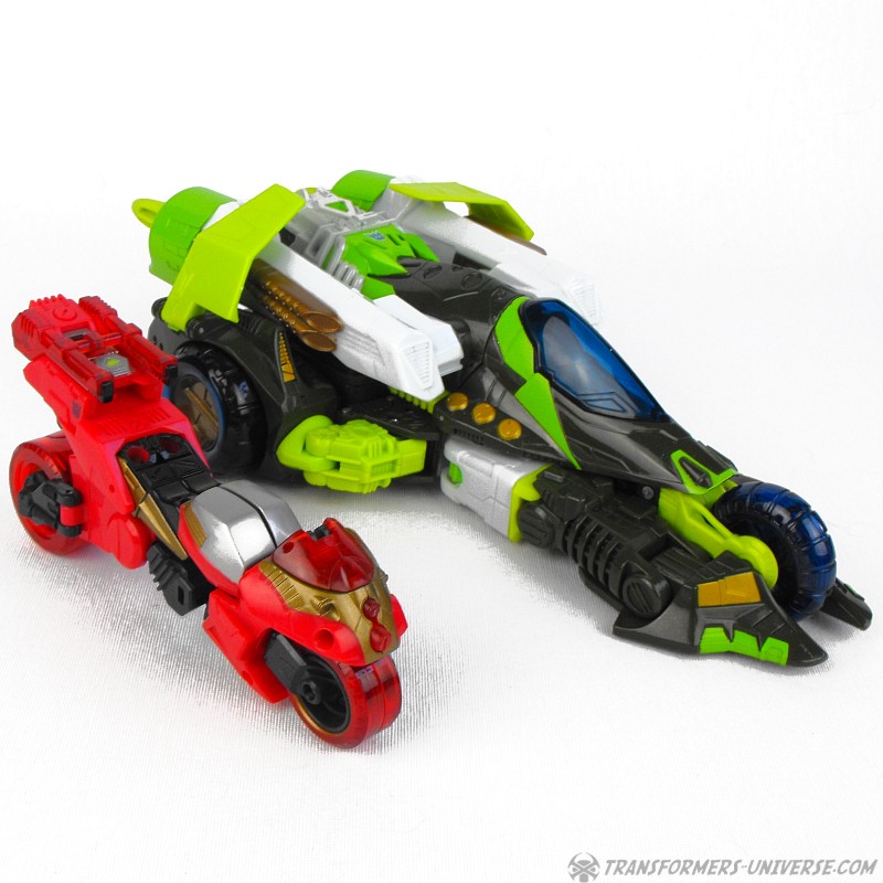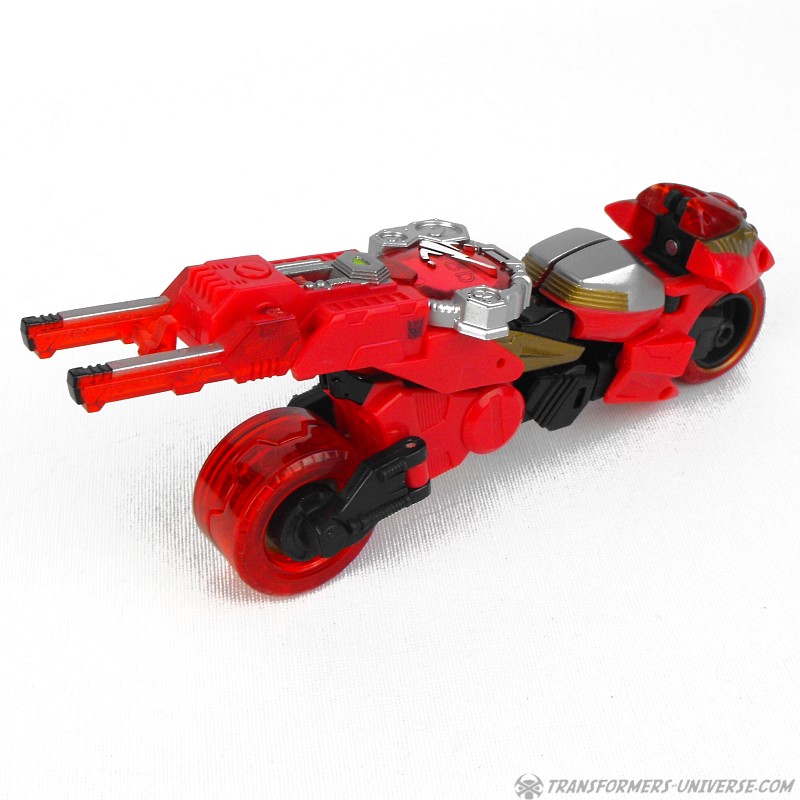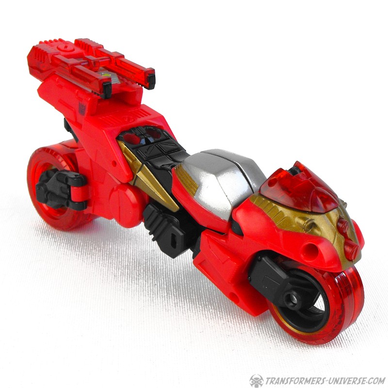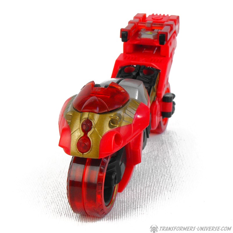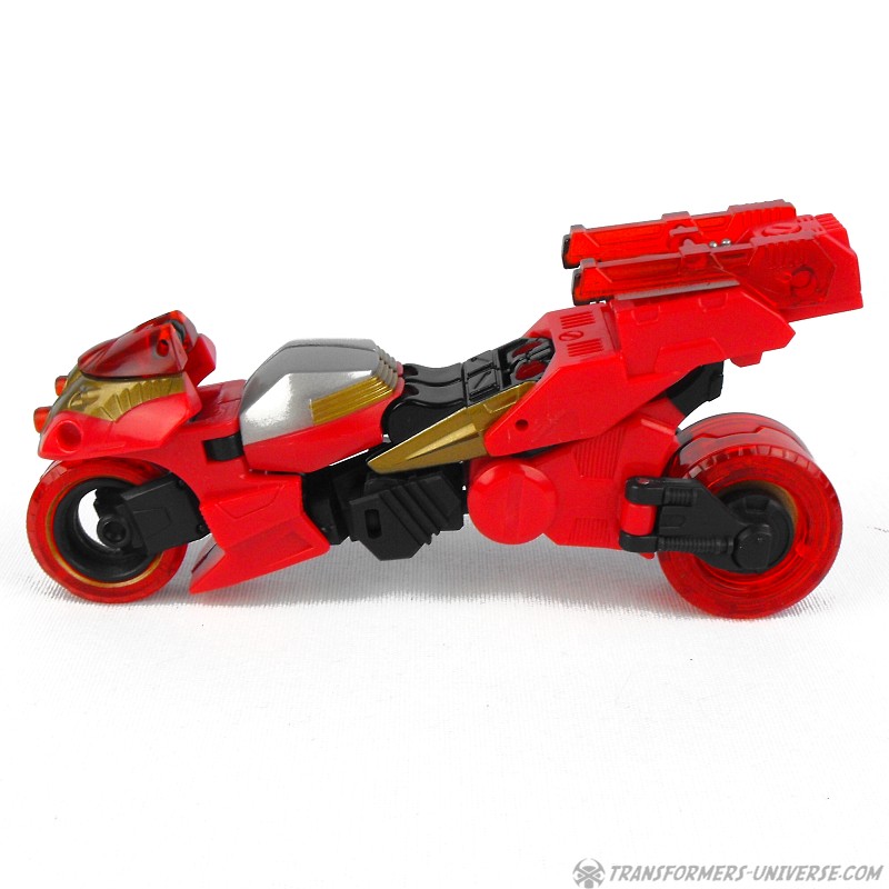 Alternate Mode: Transforming into a motorcycle, Ransack does a pretty good job. The resulting bike doesn't exactly look like something you'd see anywhere on Earth, but it's recognizable as a motorcycle and looks like futuristic Japanese bullet bike (I'm reminded of the Akira movie). Anyway, a very good bike mode. By inserting his cyber key / force chip you can flip out additional exhaust / rocket thrusters from his back, giving him a boost in speed.