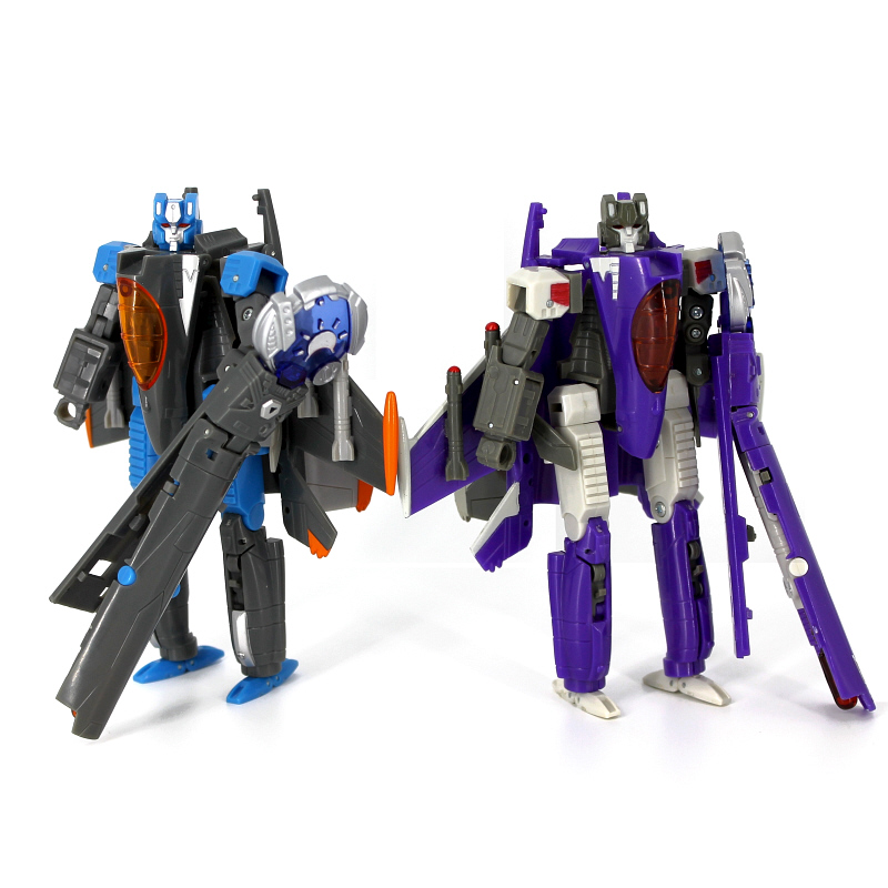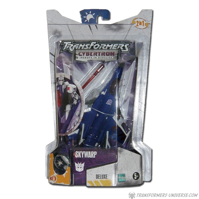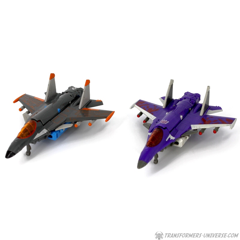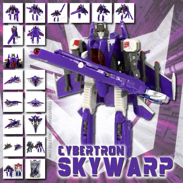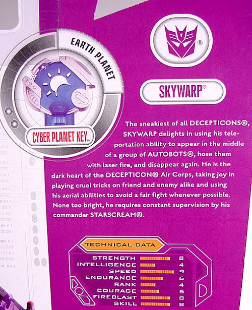 The sneakiest of all Decepticons, Skywarp delights in using his teleportation ability to appear in the middle of a group of Autobots, hose them with laser fire, and disappear again. He is the dark heart of the Decepticon Air Corps, taking joy in playing cruel tricks on friend and enemy alike and using his aerial abilities to avoid a fair fight whenever possible. None too bright, he requires constant supervision by his commander Starscream.