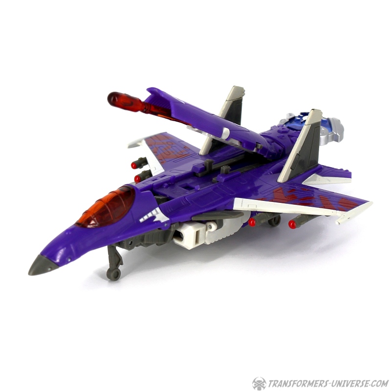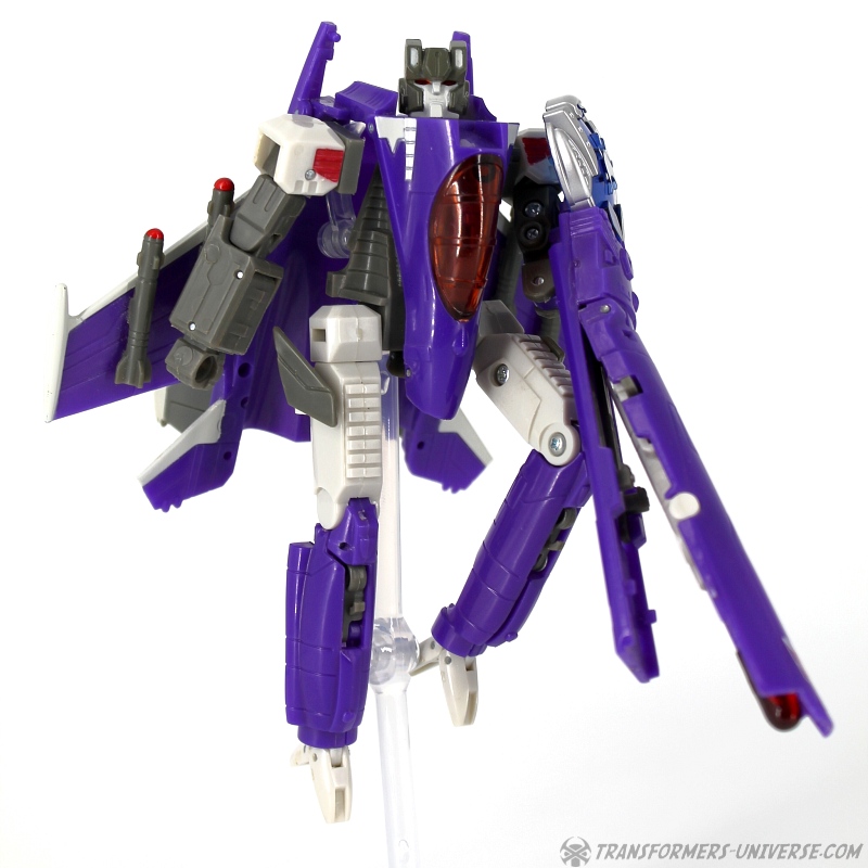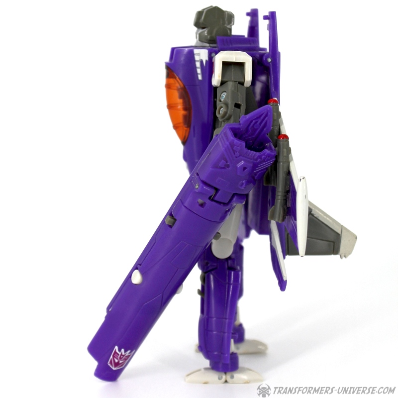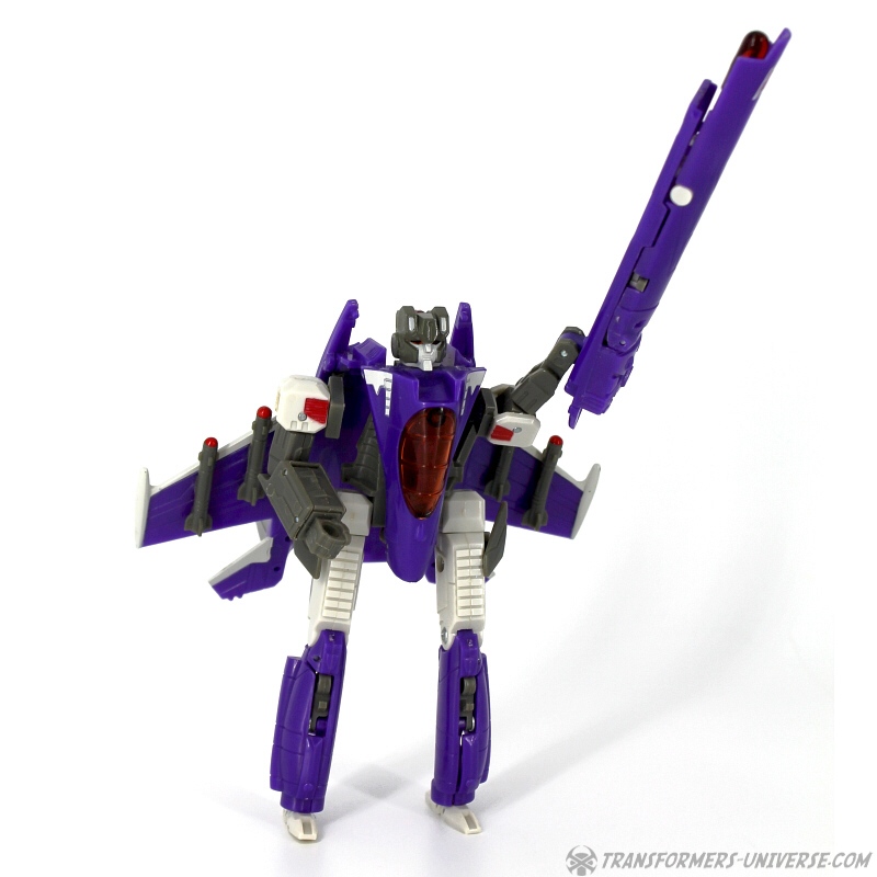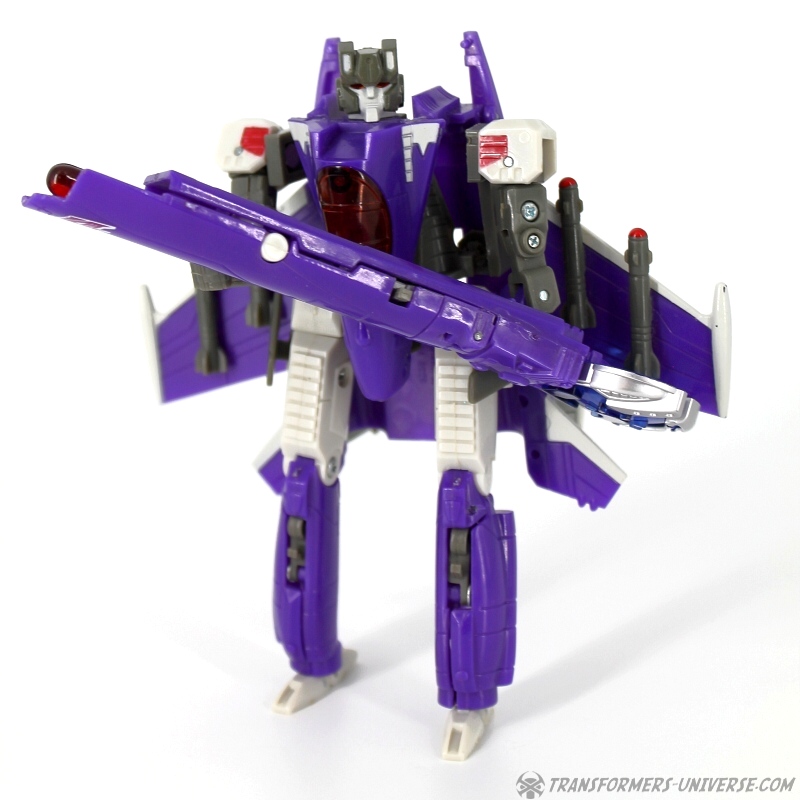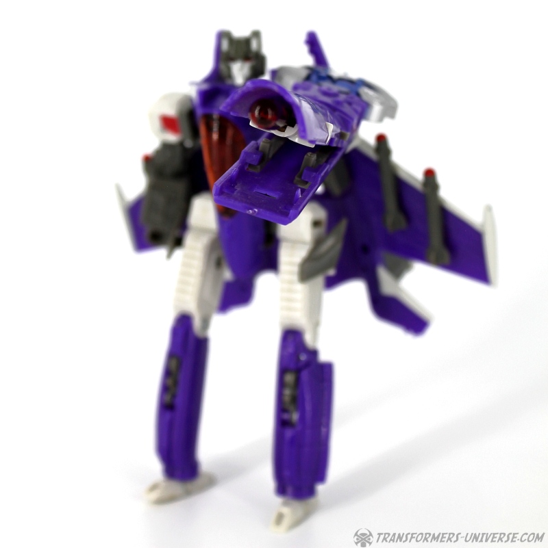 Robot Mode: Skywarp looks pretty spiffy in robot mode. I especially like the head sculpt, it looks very good. Unfortunately once you take a closer look at the design you notice quite a few problems. The big cannon that makes up his left arm is attached to a very screwy elbow-joint, making it look silly in lots of poses. Also, the shoulder barely holds onto the upper torse, getting loose every other moment. Skywarp also has very, very tiny feet, making him a bit unstable. The Cyberkey gimmick that makes the cannon flip up is really for the jet mode, using it in robot mode just looks silly. Bottom line, the robot looks great on first glance, but has a lot of problems once you really look.