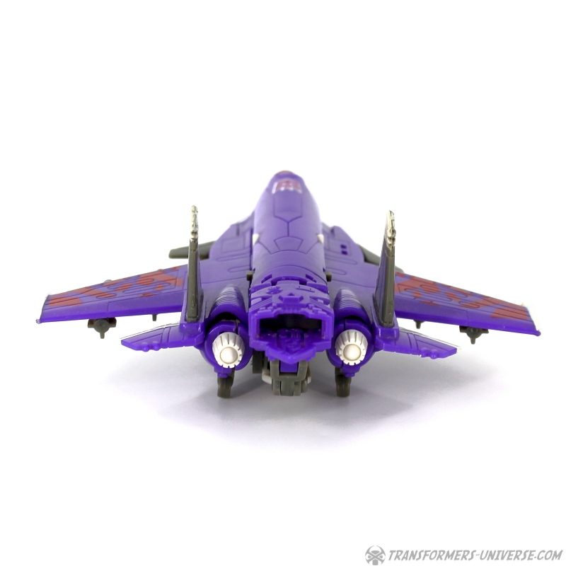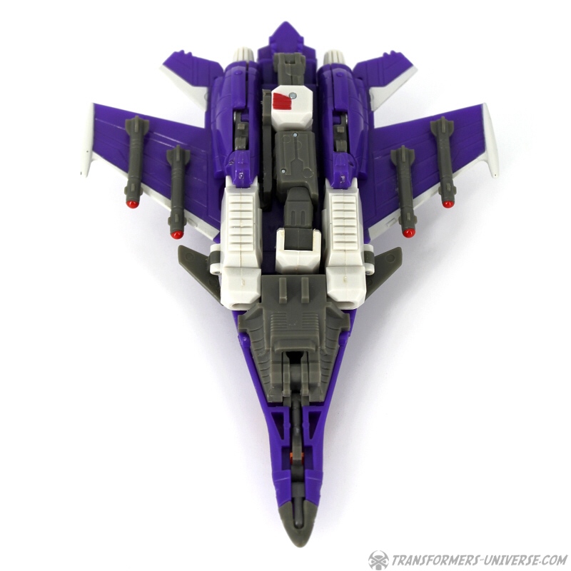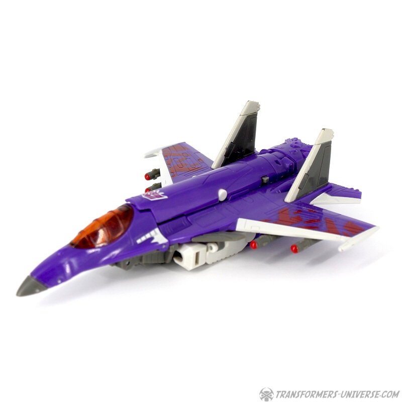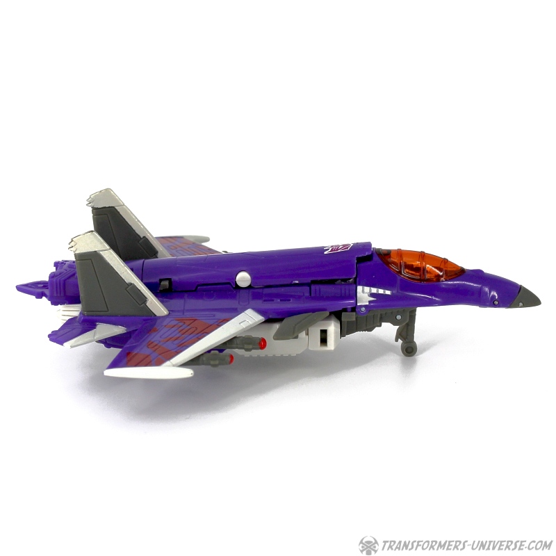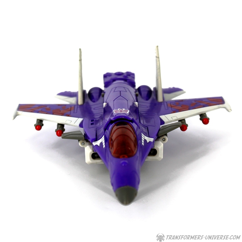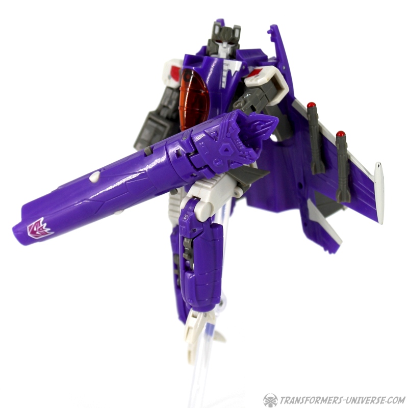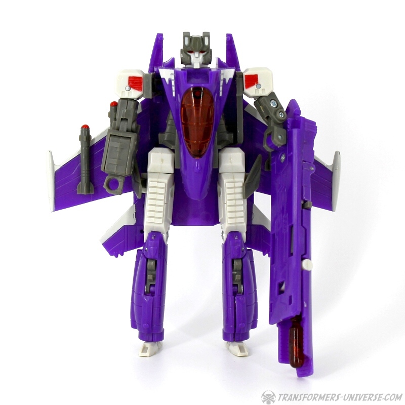 Robot Mode: Skywarp looks pretty spiffy in robot mode. I especially like the head sculpt, it looks very good. Unfortunately once you take a closer look at the design you notice quite a few problems. The big cannon that makes up his left arm is attached to a very screwy elbow-joint, making it look silly in lots of poses. Also, the shoulder barely holds onto the upper torse, getting loose every other moment. Skywarp also has very, very tiny feet, making him a bit unstable. The Cyberkey gimmick that makes the cannon flip up is really for the jet mode, using it in robot mode just looks silly. Bottom line, the robot looks great on first glance, but has a lot of problems once you really look.