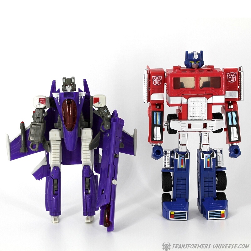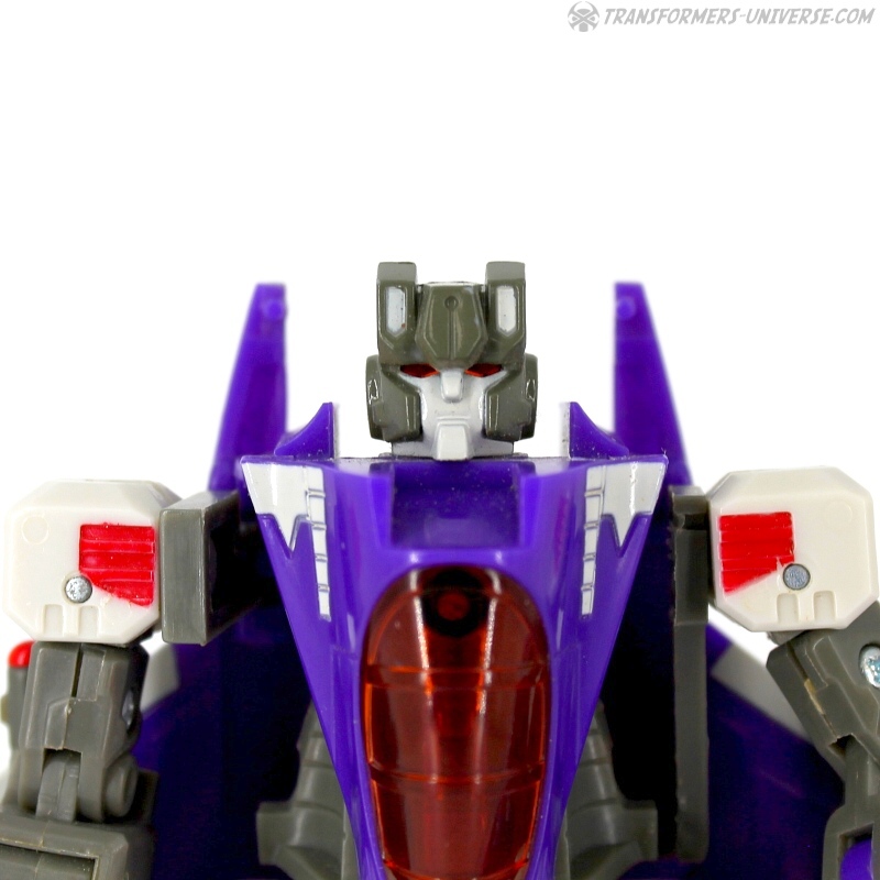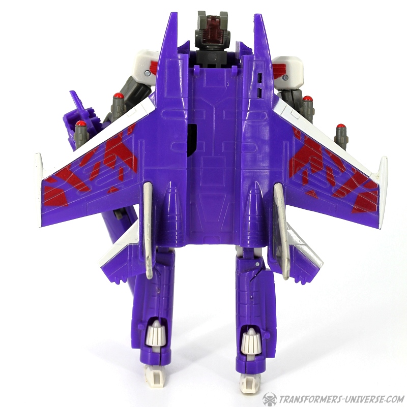 Remarks: Skywarp is a recolour of Thundercracker (though neither is a repaint of Starscream in this series). He is actually purple, though the pictures came out more blue than anything else. Anyway, Skywarp is a great jet and a good-looking robot, but design-wise he has a lot of problems that make me dislike the figure somewhat. I think with a little more effort put in you could have made him a much better toy. Better fit for the shoulders, a detachable cannon on the arm instead of it being the arm, bigger feet, and you'd have had a very good Skywarp. As it is I can only call him the bad side of average.