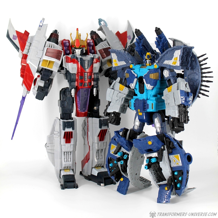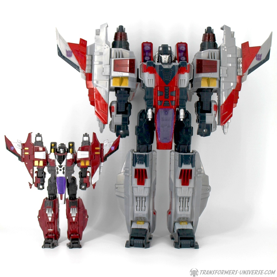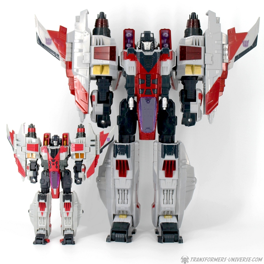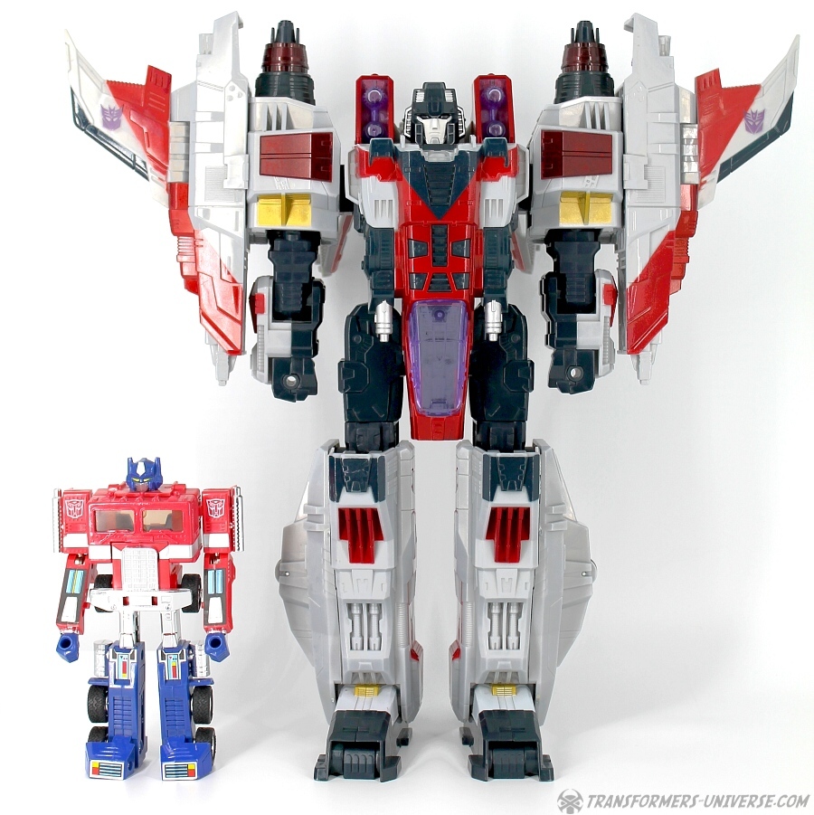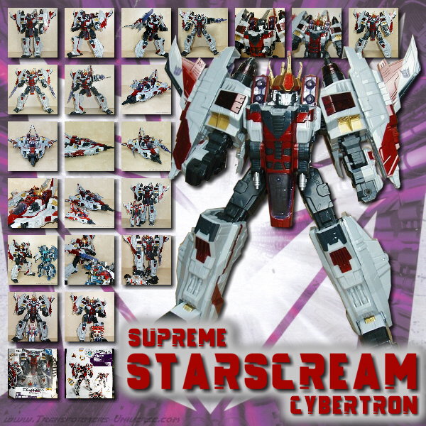 Remarks: After gaining control over several of the Cyber Planet Keys, Starscream tapped into the power of Primus and became a powerful giant. Interestingly enough he didn't manage to win so much as a single fight after that, but that is another story. As a figure Supreme Starscream is more than just a super-sized version of his Voyager-class version, some improvements have been made. Still, for a figure this size, I'd have expected a little bit more. He's larger than Primus, yet offers far less detailing and play value. So I'll rate him a notch lower than the Voyager Starscream. Recommended to Starscream fans and Cybertron completists.
