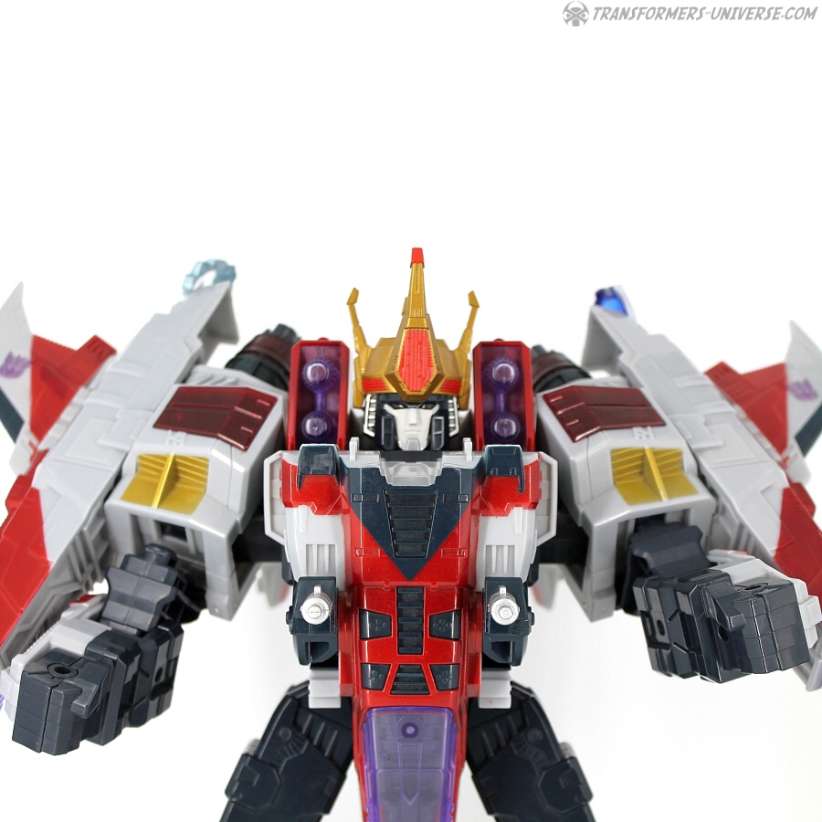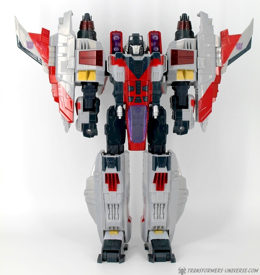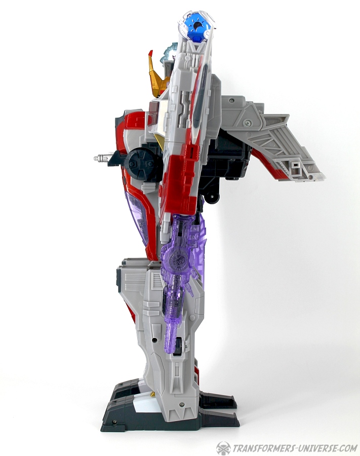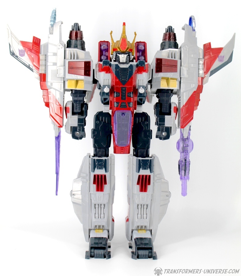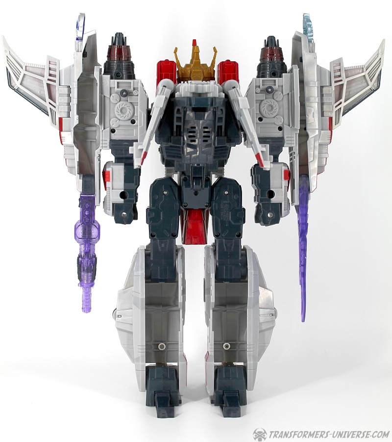 Robot Mode: Supreme-class Starscream is nearly identical to Voyager-class Starscream except for his size and some details. Supreme Starscream can aim the two guns attached to this cockpit-torso forward, giving him more firepower in robot mode. Also, instead of having purple blades in both forearms, Supreme Starscream replaces one of them with a purple cannon, that can fire a black projectile. As far as posability and detailing go, Starscream hasn't changed much, though the colouring is a bit darker, especially the red. Starscream also comes with a crown that can be placed on his head, as well as two different Cyber Planet Keys, one for Earth and one Decepticon key. All in all Supreme Starscream isn't exactly an improvement over his smaller counterpart, but neither did the size increase take anything away from him. A good robot mode.