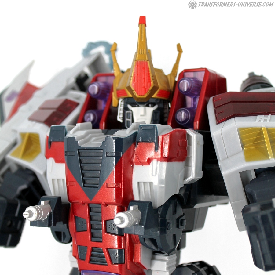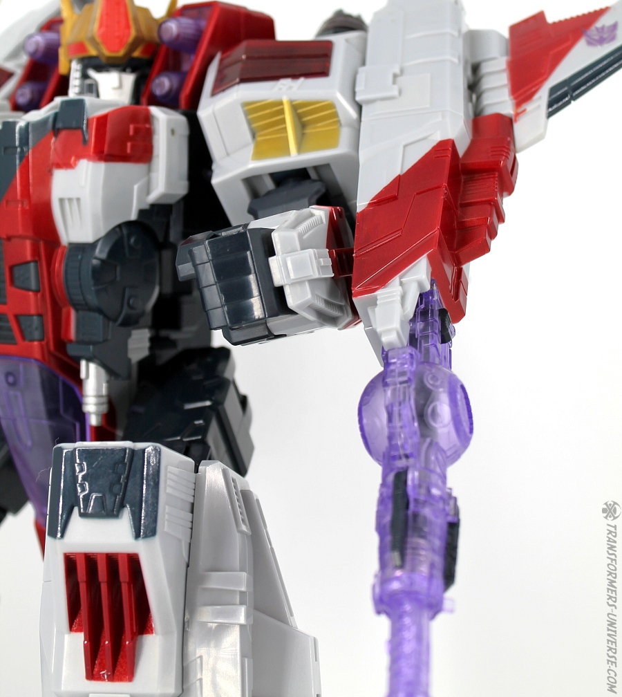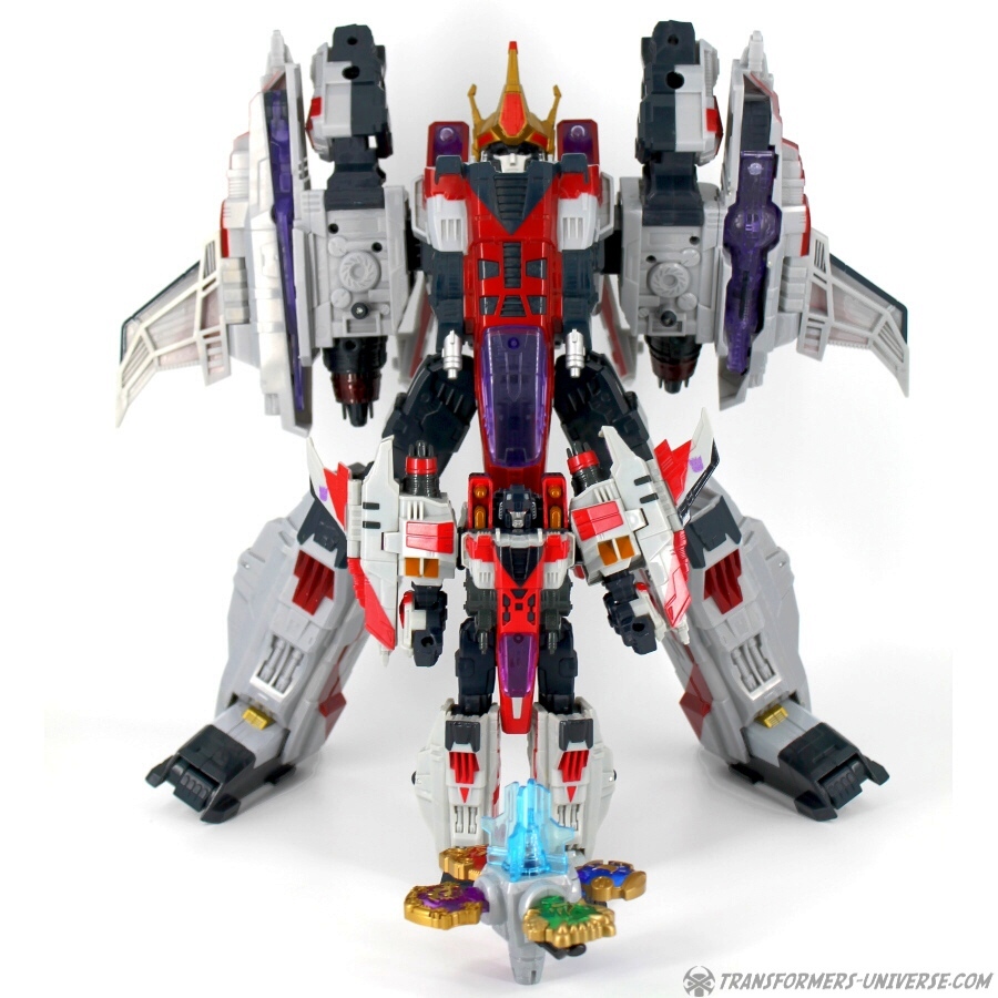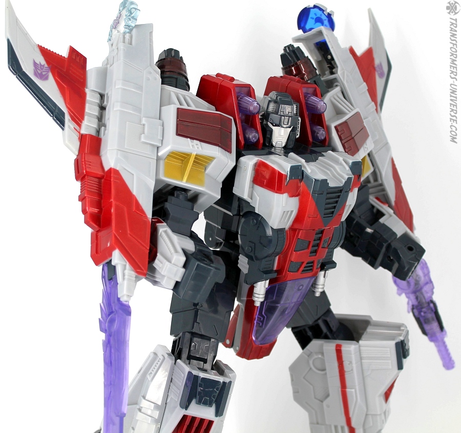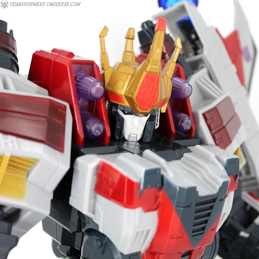 Robot Mode: Supreme-class Starscream is nearly identical to Voyager-class Starscream except for his size and some details. Supreme Starscream can aim the two guns attached to this cockpit-torso forward, giving him more firepower in robot mode. Also, instead of having purple blades in both forearms, Supreme Starscream replaces one of them with a purple cannon, that can fire a black projectile. As far as posability and detailing go, Starscream hasn't changed much, though the colouring is a bit darker, especially the red. Starscream also comes with a crown that can be placed on his head, as well as two different Cyber Planet Keys, one for Earth and one Decepticon key. All in all Supreme Starscream isn't exactly an improvement over his smaller counterpart, but neither did the size increase take anything away from him. A good robot mode.