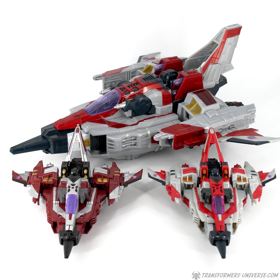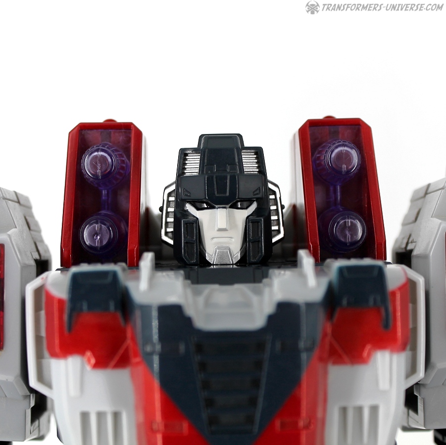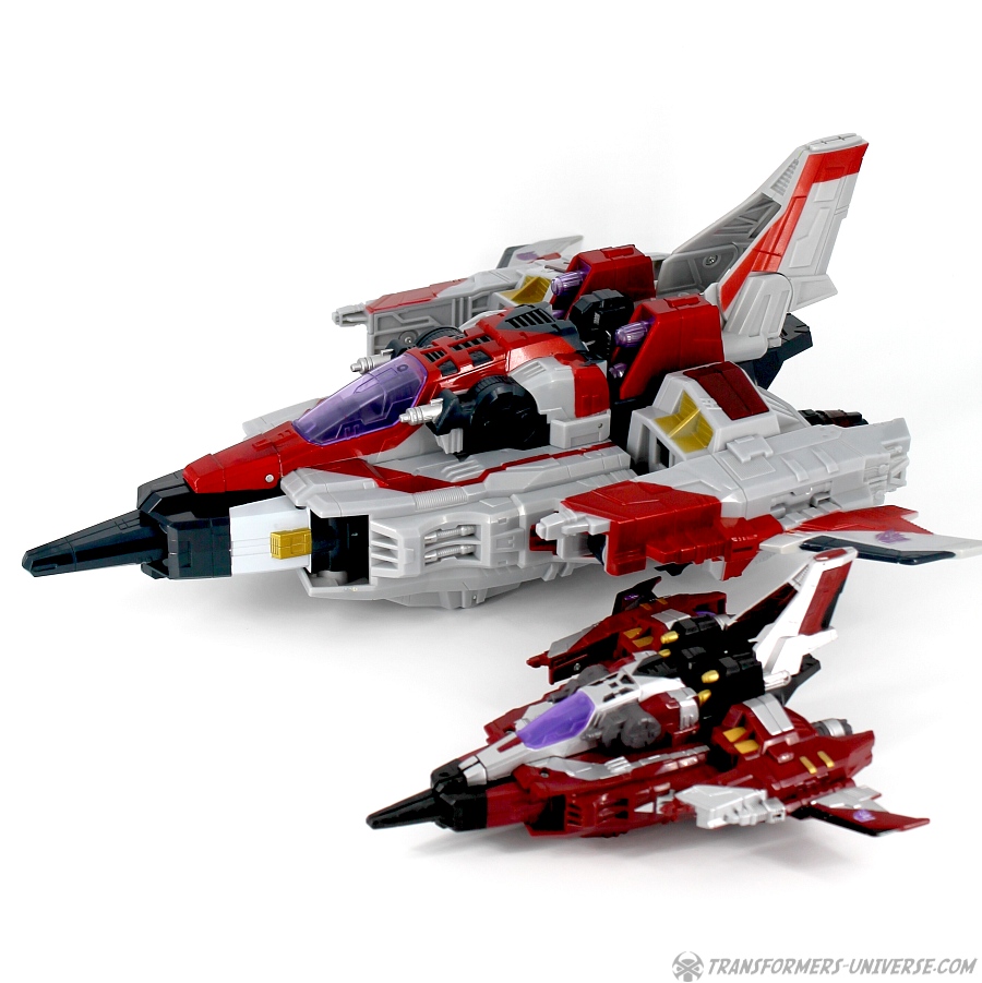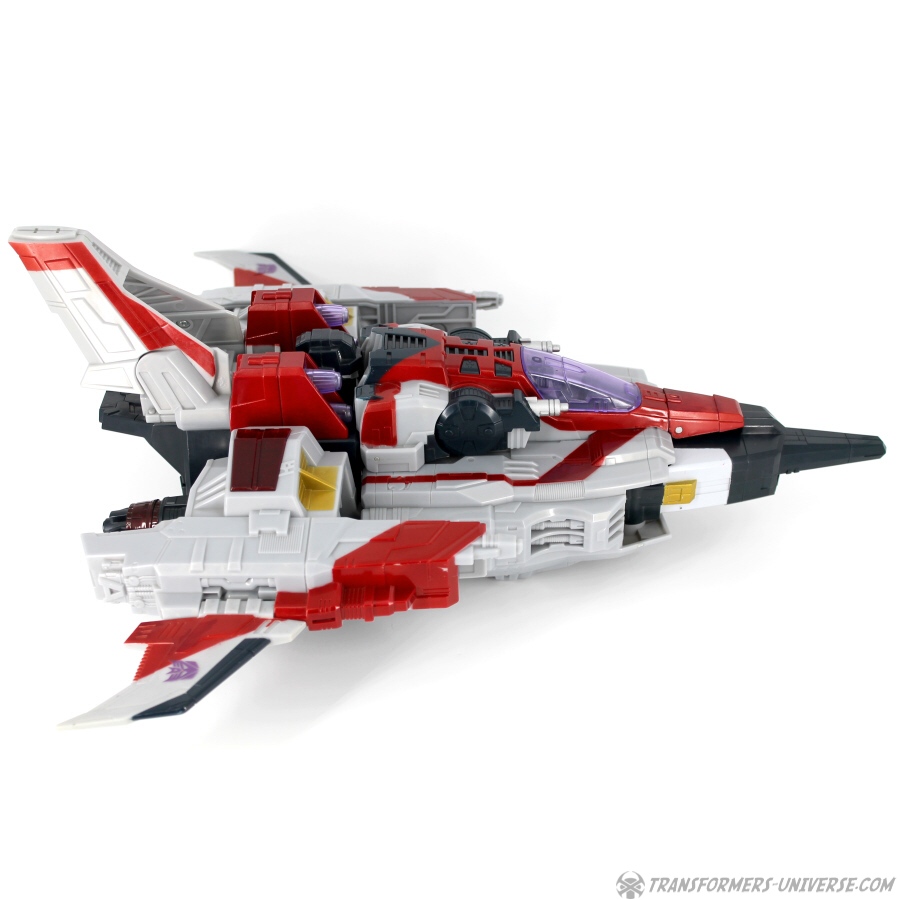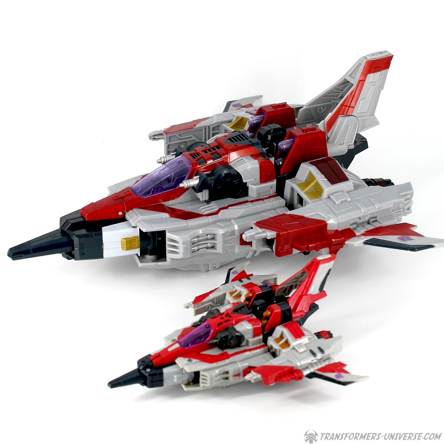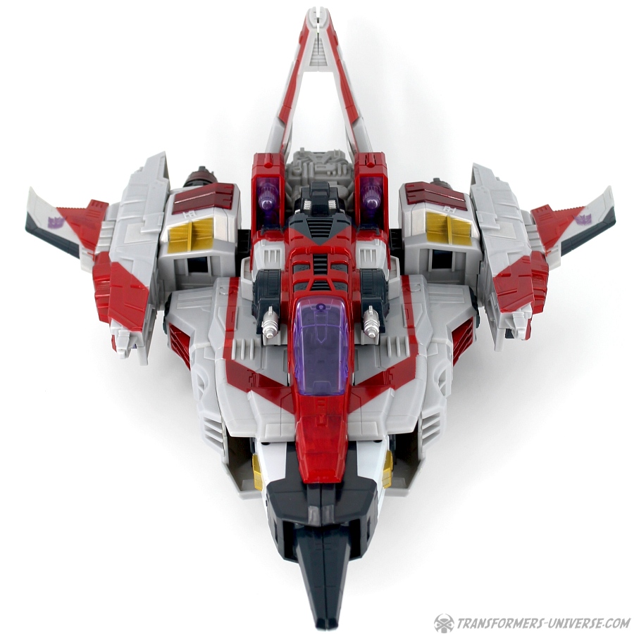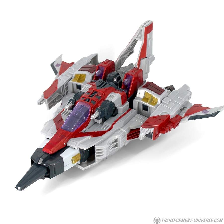 Alternate Mode: Starscream's vehicle mode is pretty much identical to that of his Voyager incarnation. A futuristic space jet that combines elements from G1's pyramid-flyers and Dreamwave's War Within series. A good-looking jet, no complaints. Starscream's crown can even remain on his head in this mode, it doesn't impede the transformation.