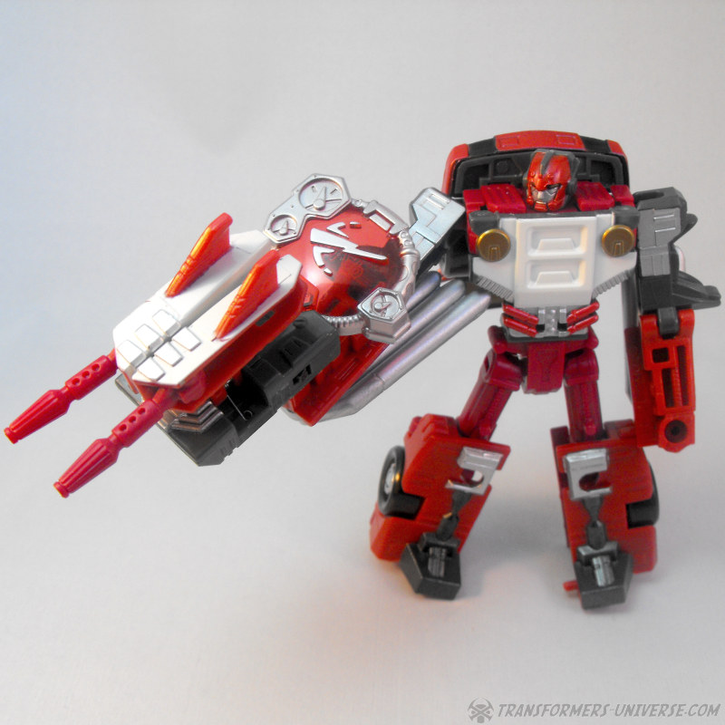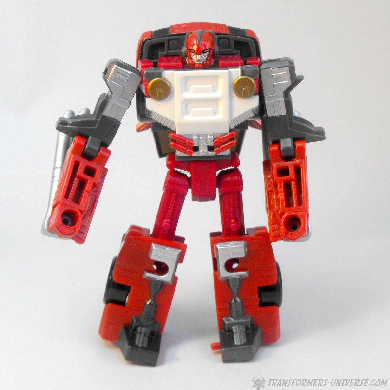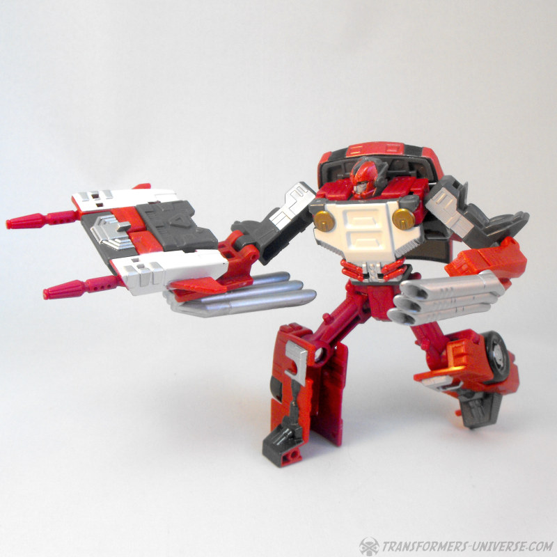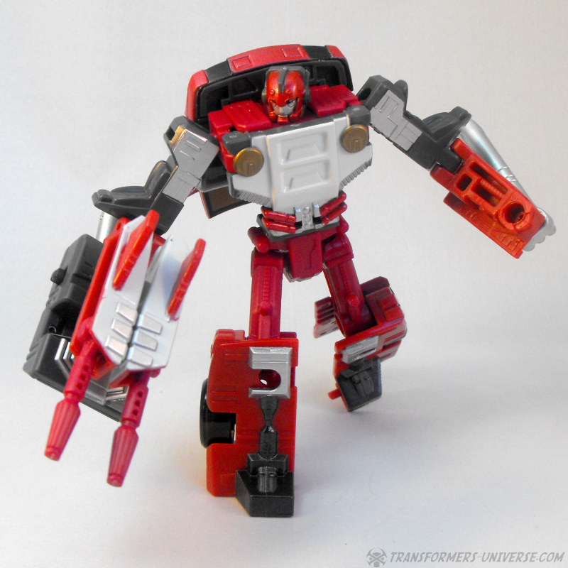 Robot Mode: Swerve is a Scout-class figure and about as articulated an detailed as you can expect at this size. He can easily pull off a number of poses, can turn his head, and manages to incorporate not just one but two different gimmicks into his rather small frame without the figure itself suffering for it. He has nice detailing and the mainly red and white paintjob suits him fine as well.