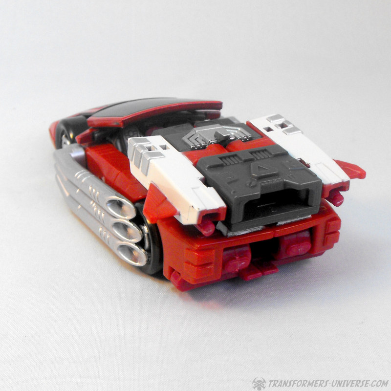 Alternate Mode: Swerve transforms into an open-top futuristic race car. The big triple exhaust pipes from the robot mode's arms are now on either side and they can swing forward for a kind of weapon-mode here, too. The Cyberkey gimmick works as well, of course, though in this case you actually do need to activate it, otherwise you can't flip out the weapon barrels. The car also features a bit of cockpit interior, a very nicely done Autobot logo across the entire hood, and nice detailing overall. So bottom line: a very nice car mode. 'Nuff said.