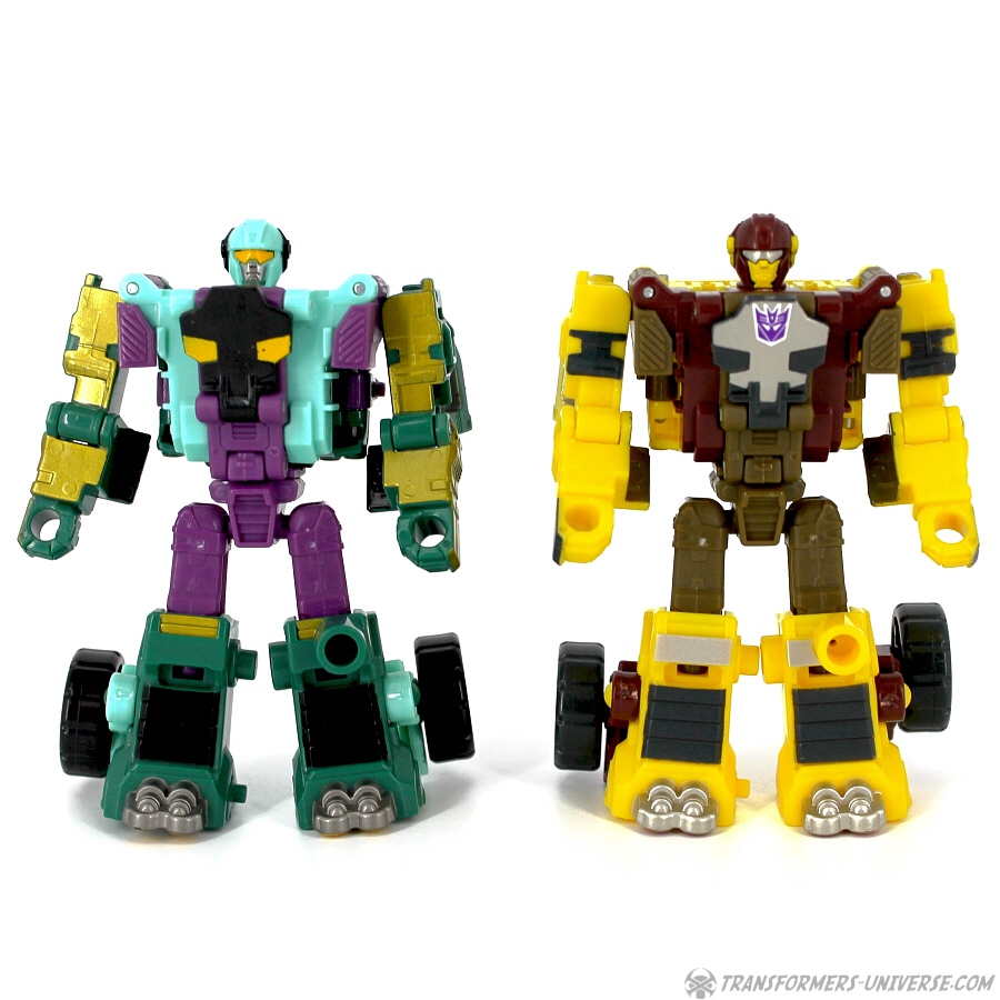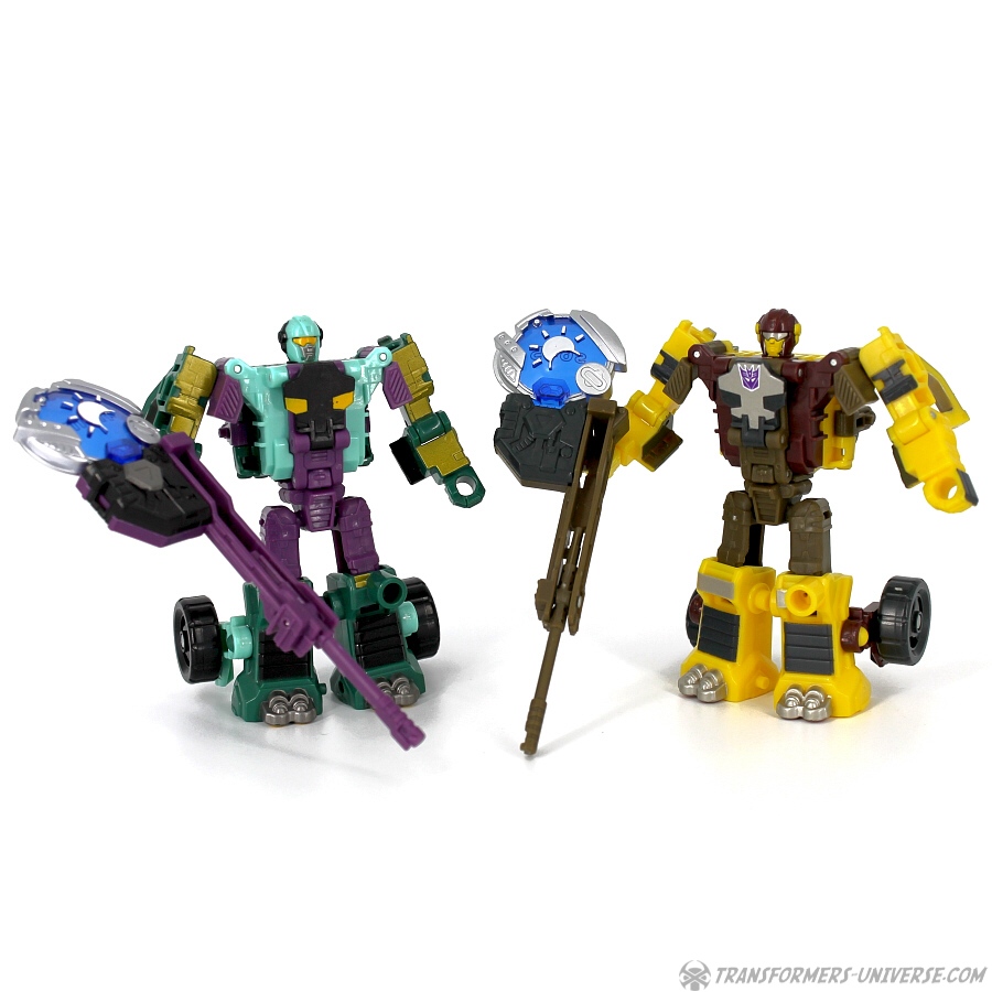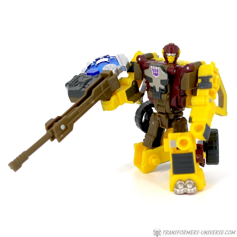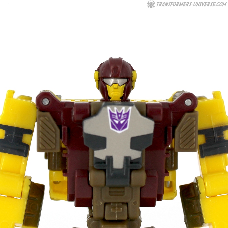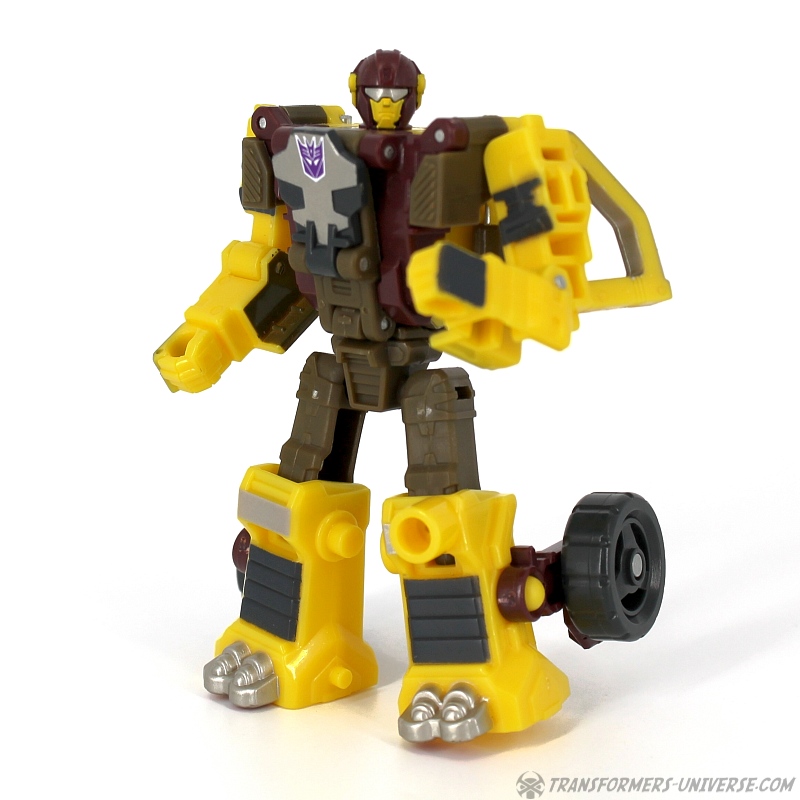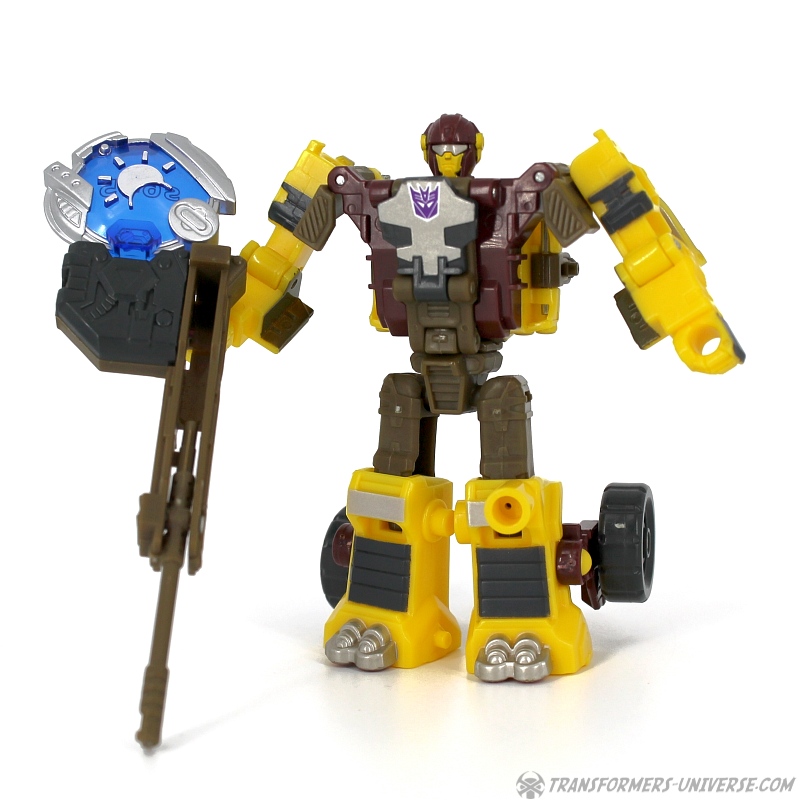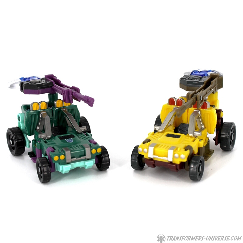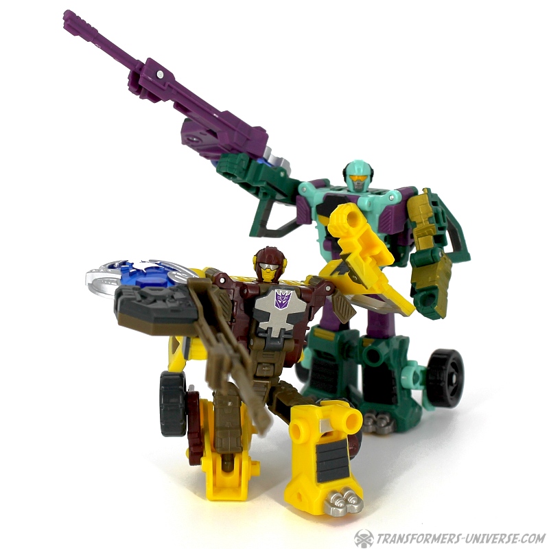 Though he is outfitted with a sensor package and weapons system nearly identical to his twin brother Hardtop, Swindle scorns long-range tactics. He´d rather charge an Autobot and club him across the visual cluster with his laser rifle than actually use it to blast another robot. Swindle is deceptively agile and tough for his size, traits developed over years of picking fights and winning. He is not as slavishly loyal to Megatron as his brother; he will work for anyone who lets him trash Autobots.