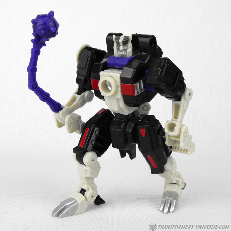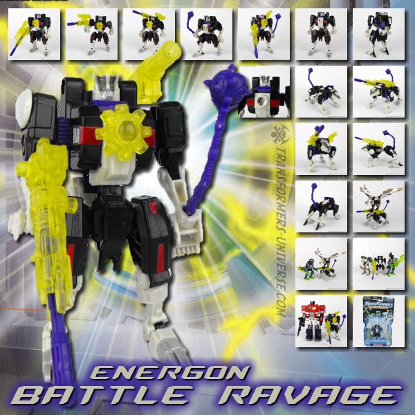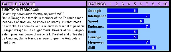 Battle Ravage is a ferocious member of the Terrorcon race. Incapable of emotion, he knows no mercy. In robot mode, he attacks its enemies with a relentless arsenal of powerful Energon weapons. In cougar mode, beware of his Energon-eating jaws and powerful mace tail. Created and unleashed by Unicron, Battle Ravage is sure to give the Autobots a hard time.