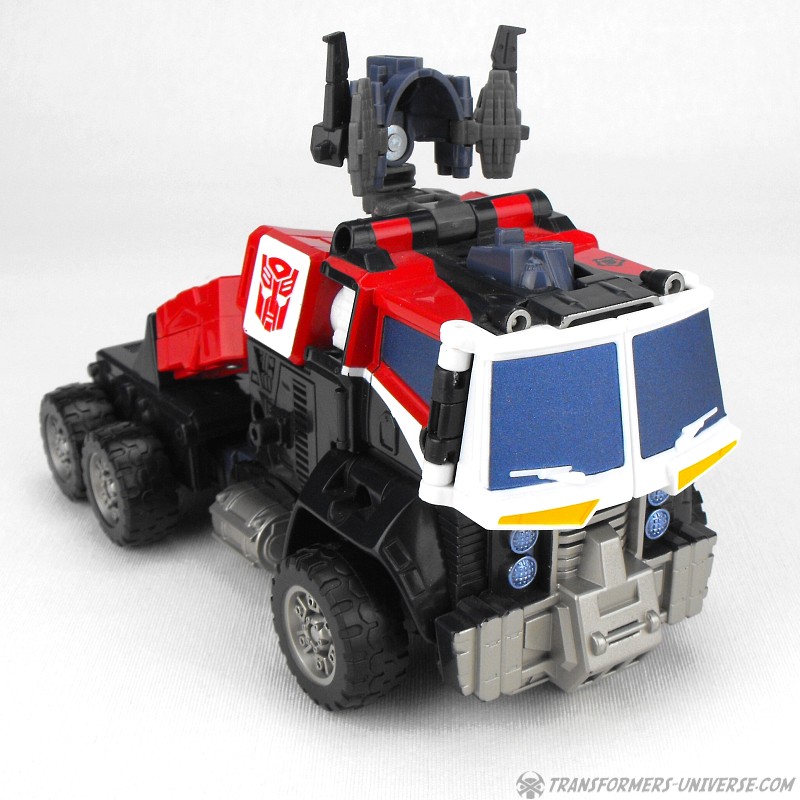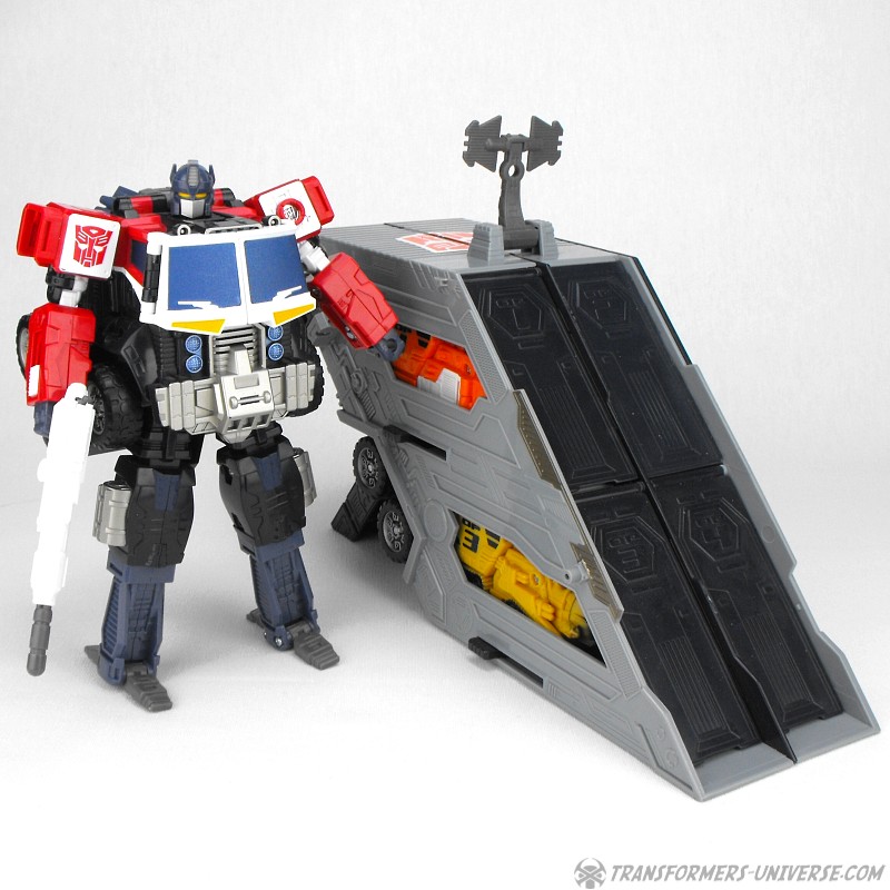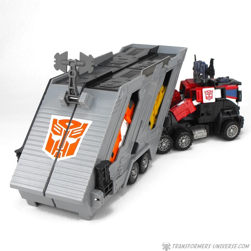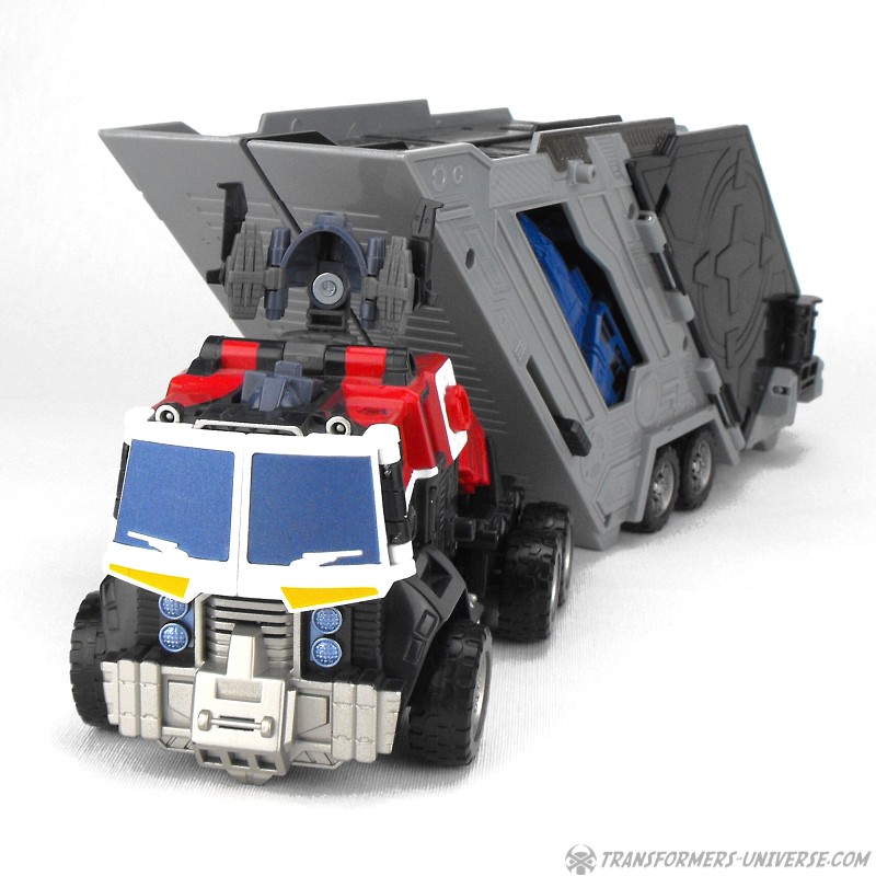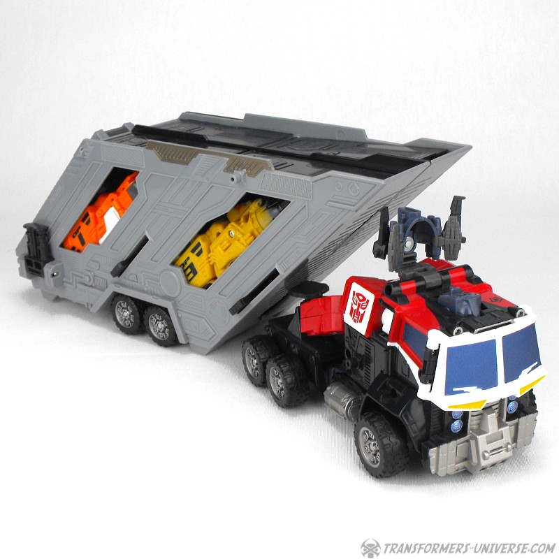 Optimus pulls a trailer in this mode. Unlike earlier incarnations this trailer does not transform into a battle station or combine with Optimus into his Super Mode, but rather serves as a transport / base for four separate vehicles, the OP Force.