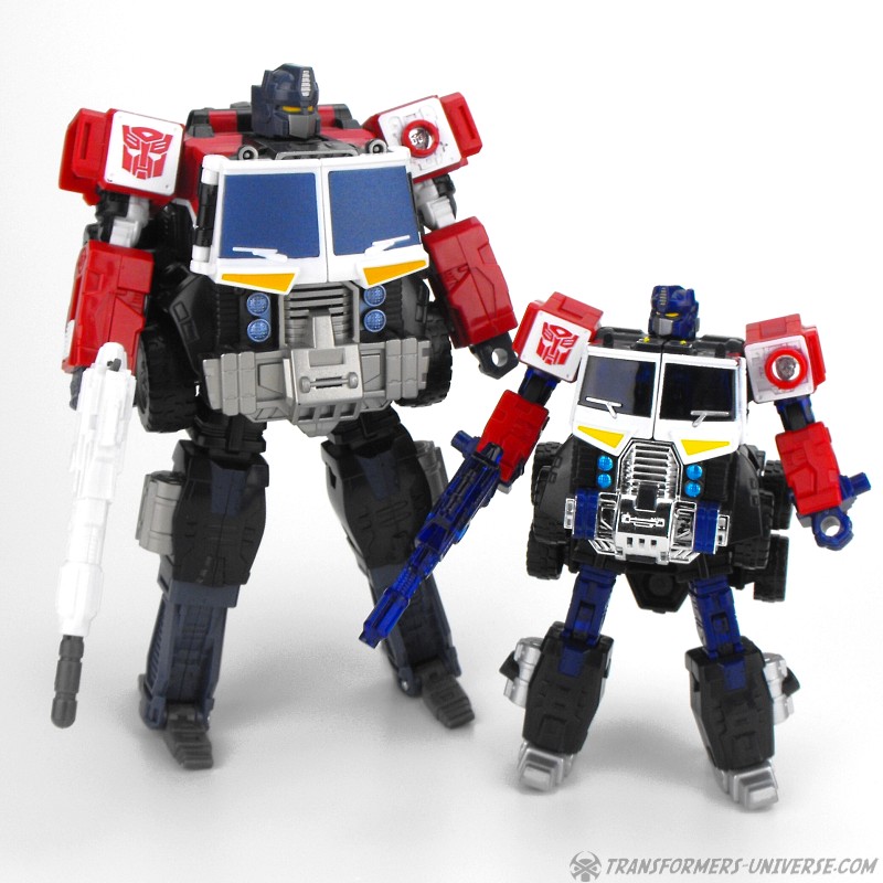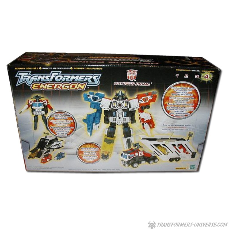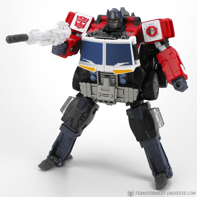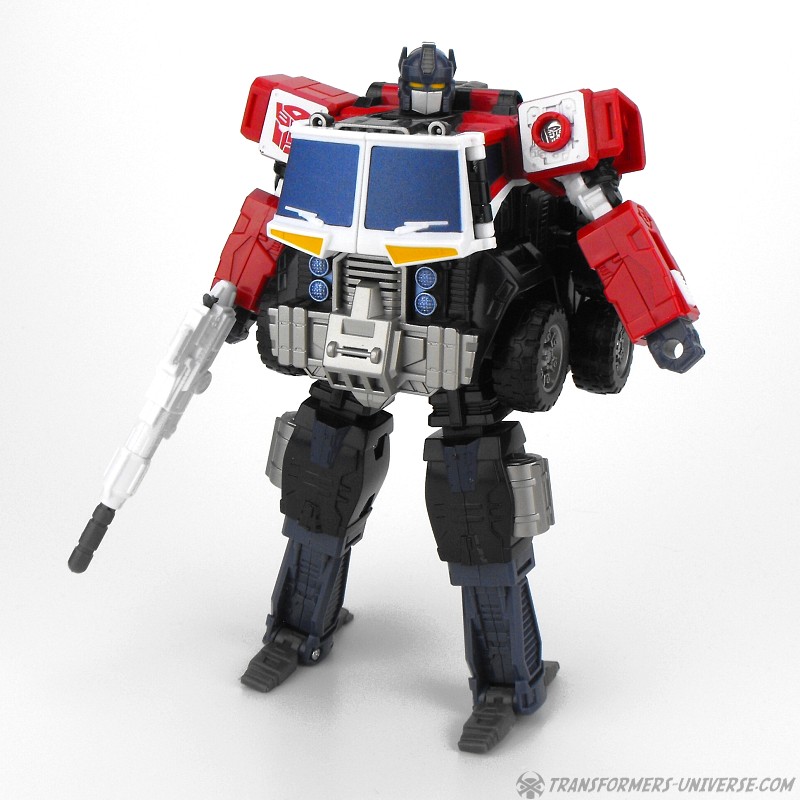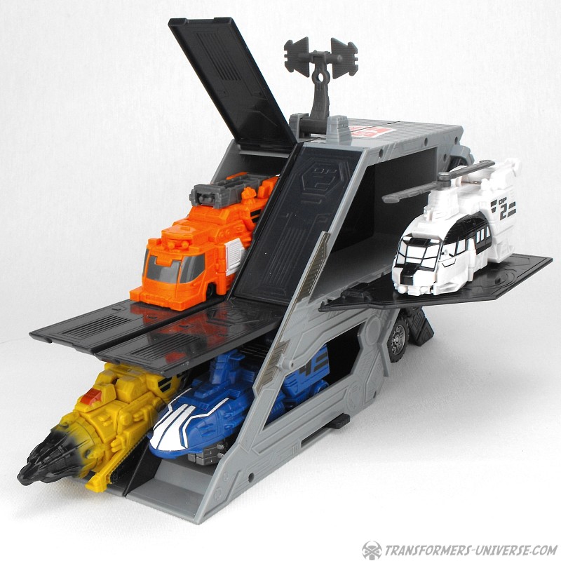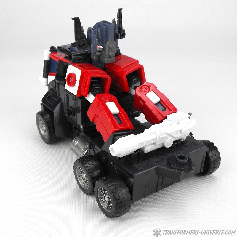 Optimus pulls a trailer in this mode. Unlike earlier incarnations this trailer does not transform into a battle station or combine with Optimus into his Super Mode, but rather serves as a transport / base for four separate vehicles, the OP Force.