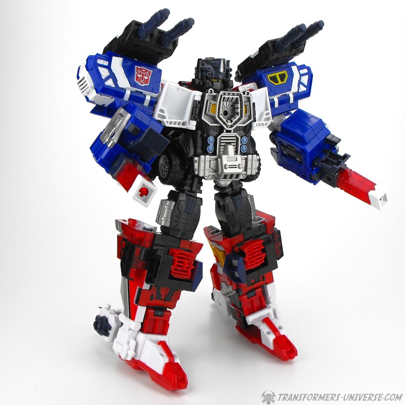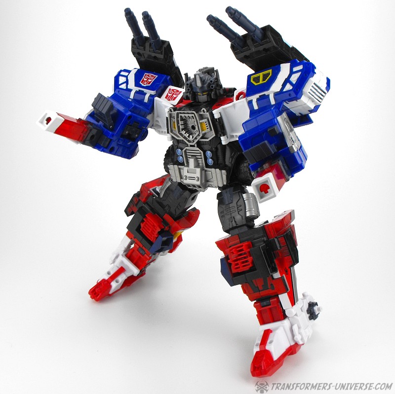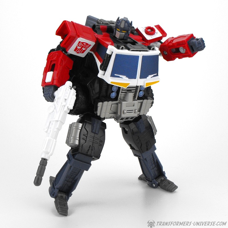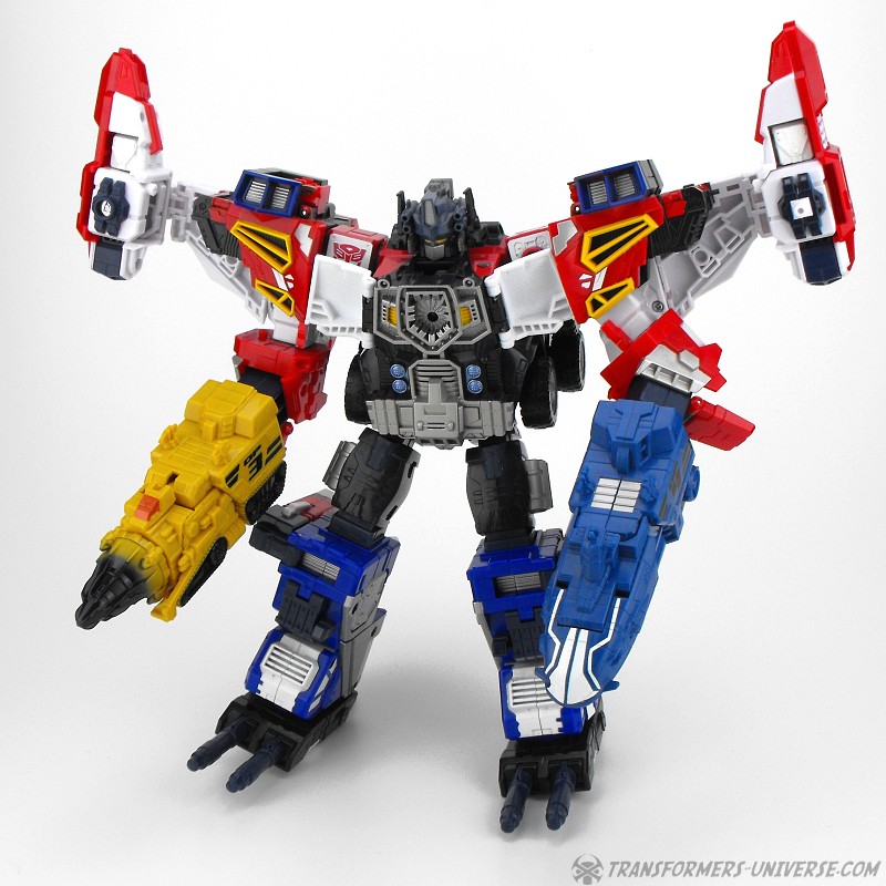 This combined mode can be enhanced further by adding Optimus' OP Force vehicles to the mix. Two can attach to the legs, one to the right arm (the drill makes the most sense here, IMO) and one to the right shoulder. Optimus' own weapon (and other Energon weapons) can attach to the left arm. The result is one heavily armed giant, but it looks a bit overcrowded in this mode. I like it a bit more streamlined, so I usually leave the OP Force vehicles off.