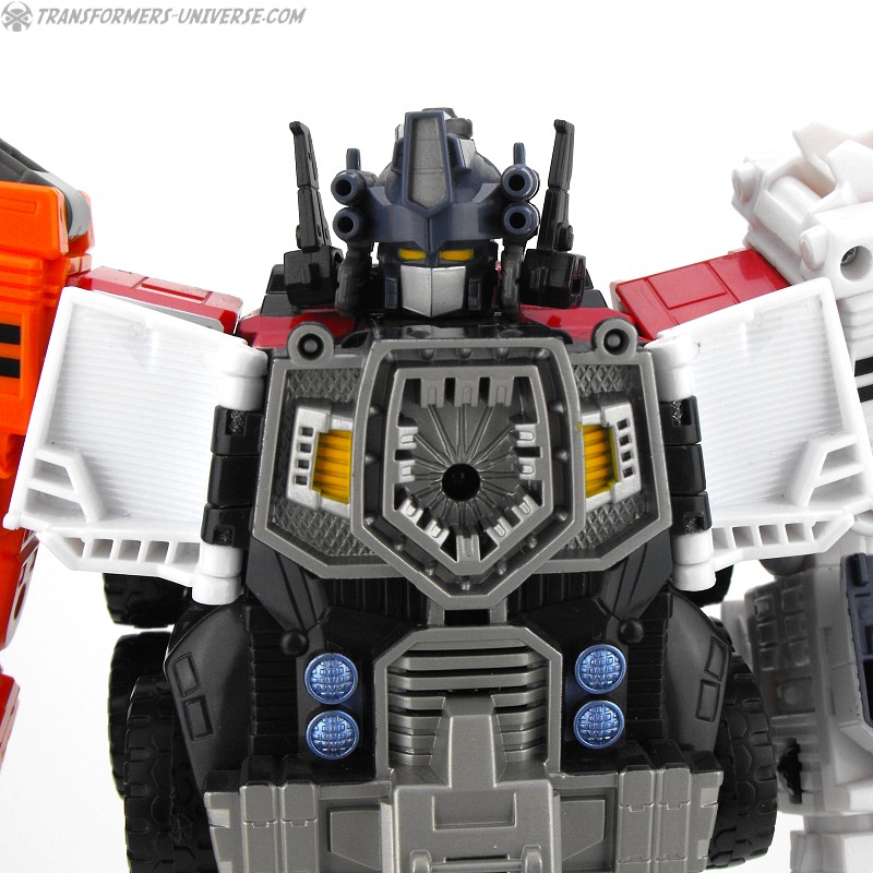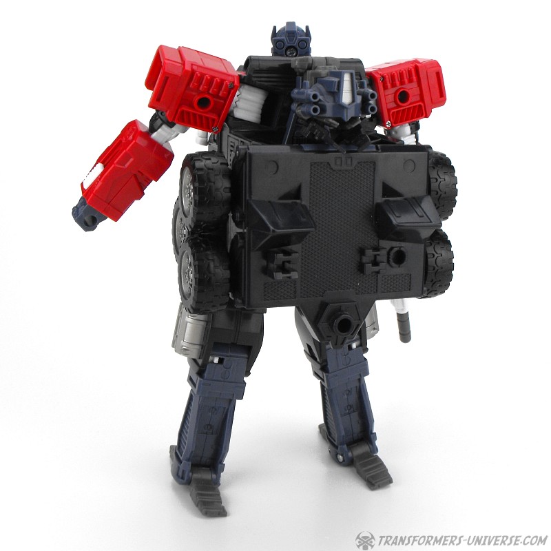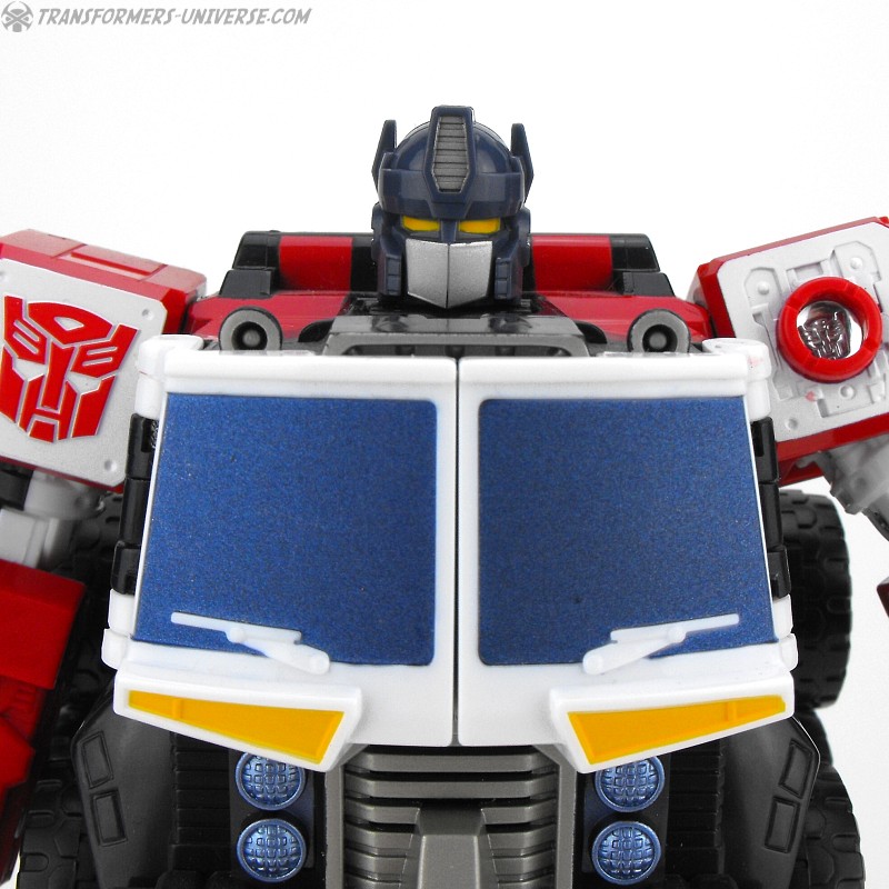 Optimus can also combine with Omega Supreme (see Omega's review for pictures). Basically his folded-up truck cap mode with only the head extended becomes the center of Omega's body, like putting on a kind of huge armour. The resulting combiner, named Optimus Supreme (though I would have preferred Omega Prime in memory of RID), doesn't look that different from Omega Supreme, except that the head of Optimus has now replaced Omega's and the yellow panel that formerly covered the area between Omega's shoulders is now upright. This gives Optimus one hell of a blind spot to his right, but the designers took the time to add some details to the panel, so now it looks like a kind of missile launcher. Nice touch.