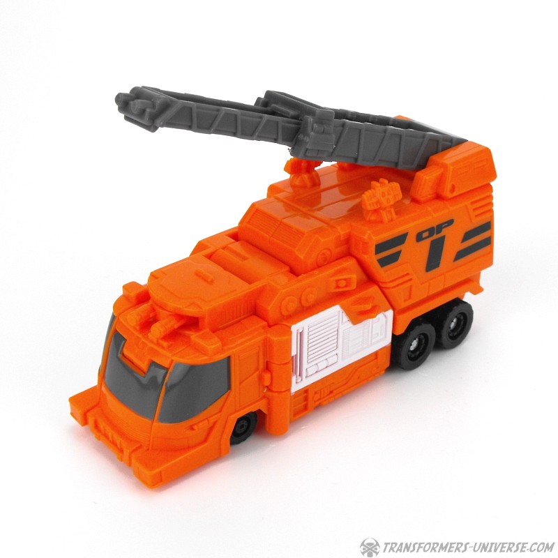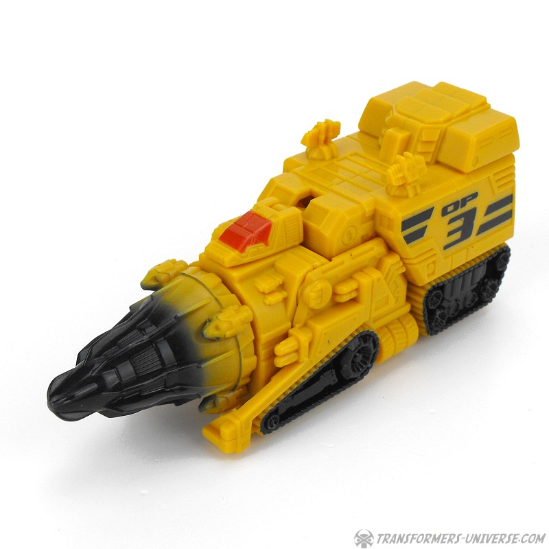 Partners / Add-Ons: Optimus comes with four extra vehicles, the OP Force. The four vehicles are a fire engine, a submarine, a helicopter, and a drill tank. There isn't really that much play value in the four in vehicle mode, though the designers did try to make each more than a simple brick. The helicopter's rotor spins, the fire engine's ladder extends, the drill head spins as well. Only the submarine doesn't really do anything in this mode. The four can stow away in the trailer, which can transform into a kind of base tower (called 'Energon Tower') for them.