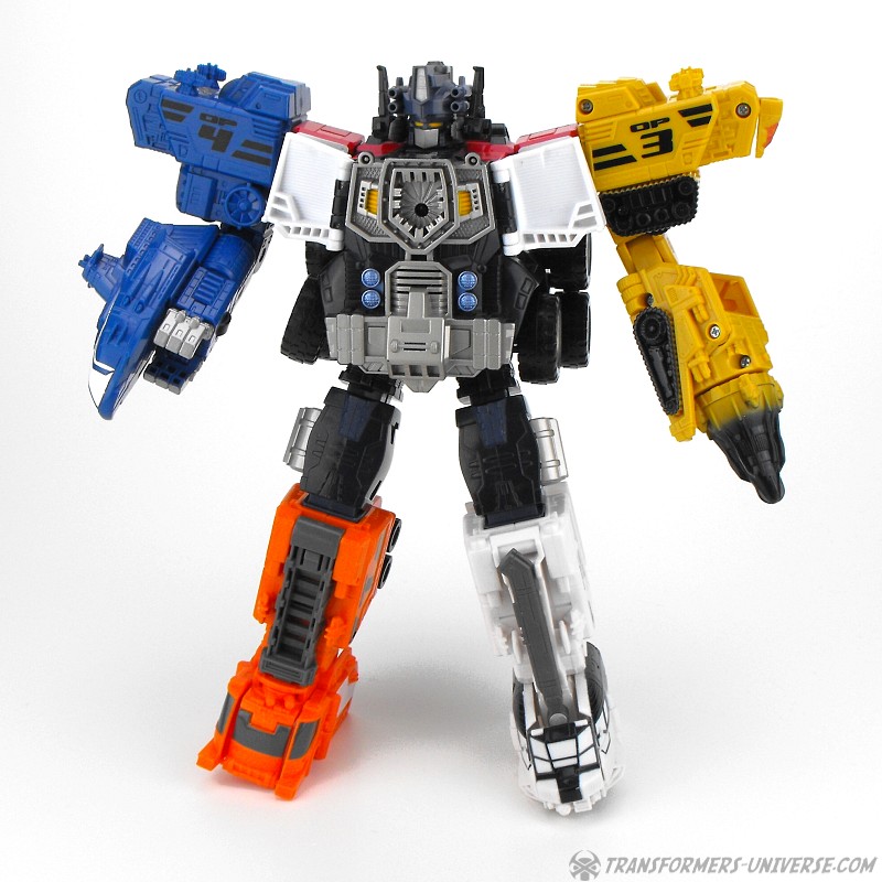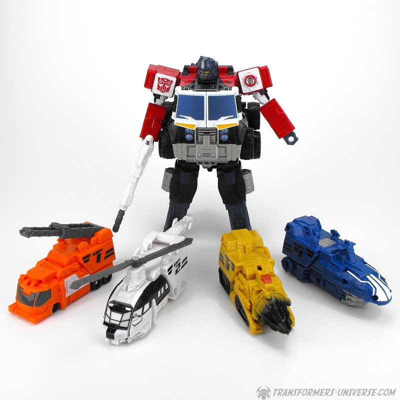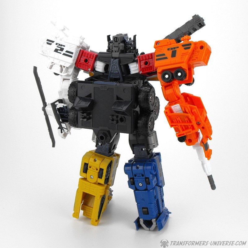 Combiner Modes: Optimus combines with his four OP Force vehicles in classic G1 combiner style. Optimus becomes the torse, the four smaller vehicles become the arms and legs. There is no restriction on which vehicle becomes which, all can serve as right or left arms or legs. Optimus' head gets a helmet, as the antenna from the truck mode wraps around it. The resulting robot looks pretty decent despite the odd mix of colours and is surprisingly posable. My only real complaint here is the head. It doesn't look like a bigger head, but rather like a small head with a huge helmet. The helmet also restricts the head's motion, it can only turn sideways a little bit. All in all, though, a great combiner mode, much more fun than the basic robot mode.