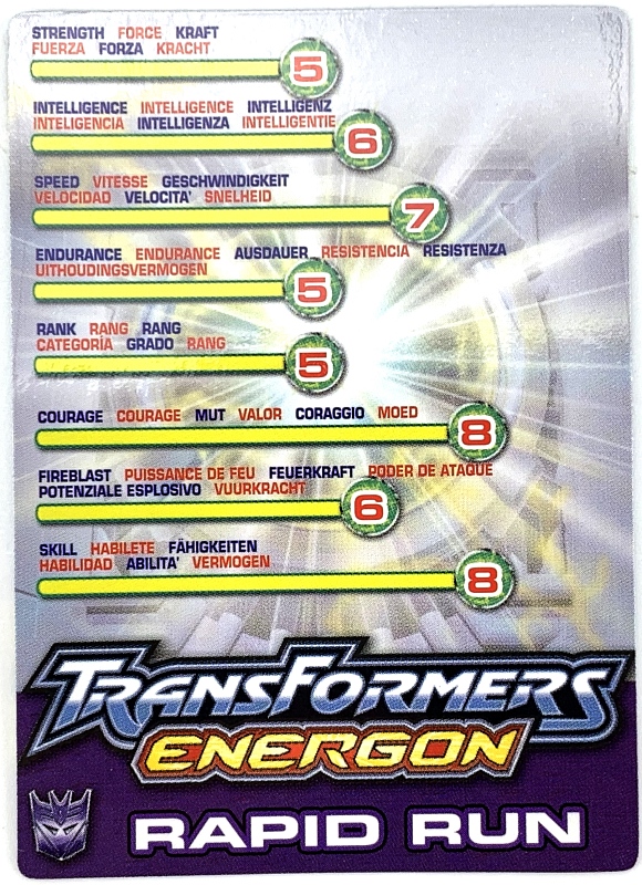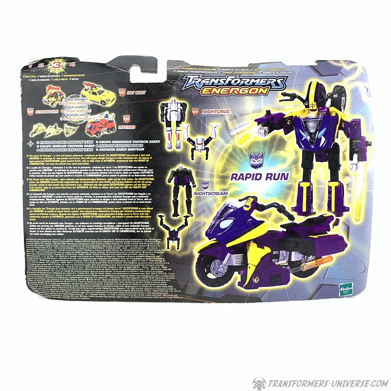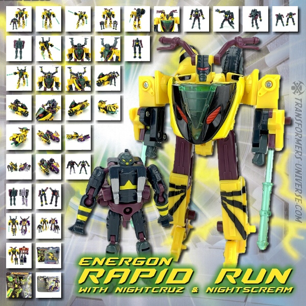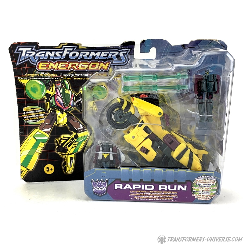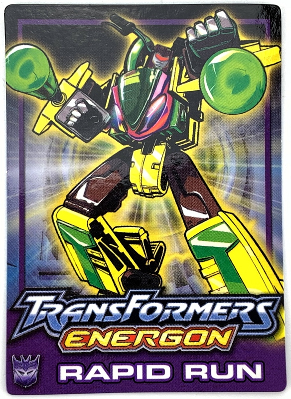 Remarks: Rapid Run was supposed to come out late in Armada as a powered-up version of Sideways. For some reason or other he was moved to Energon instead, where he became his own character. He never appeared anywhere, though, and his only characterization came from the Transformers Collectors Club magazine, which described him as a mercenary in the service of Unicron.