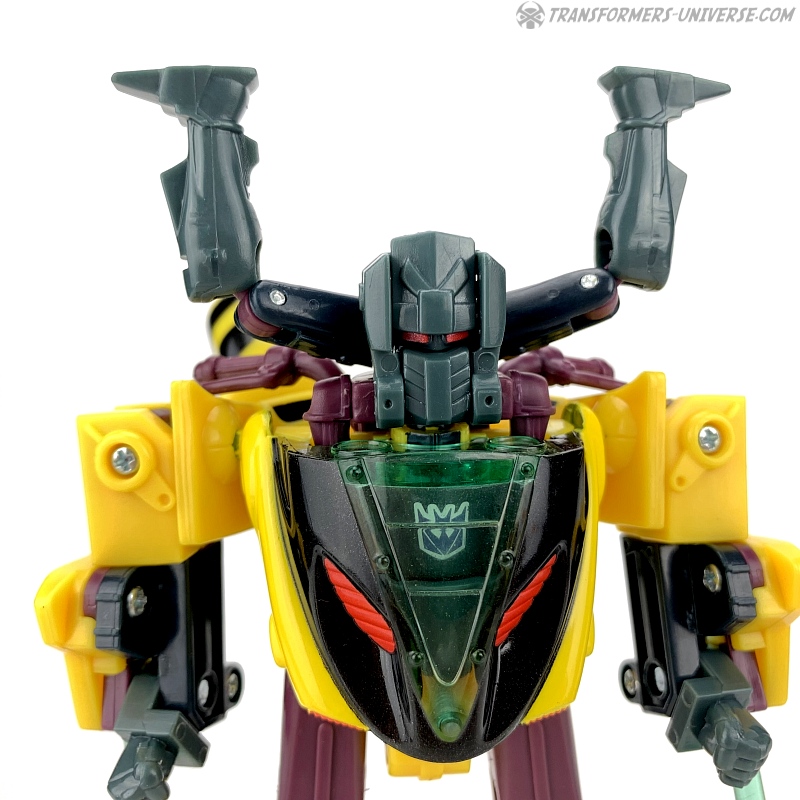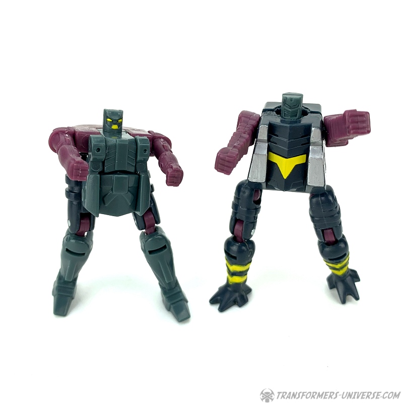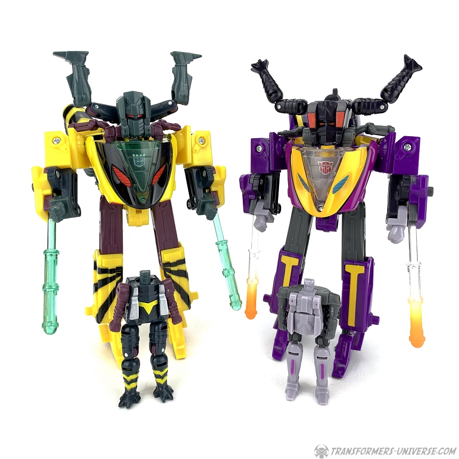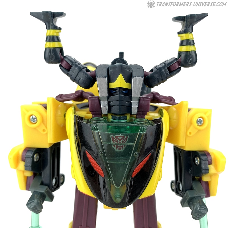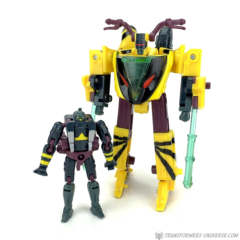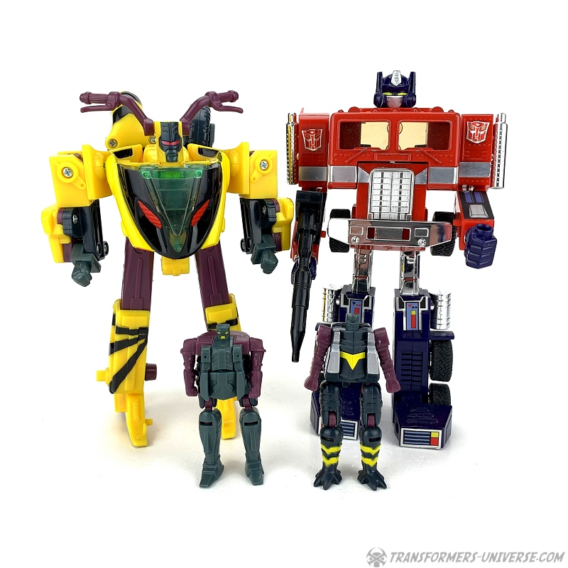 Partner: Rapid Run comes with two Mini-Cons: Nightscream (who turns into his Decepticon head) and Nightcruz (his Autobot head). The two Mini-Cons are, of course, repaints of Rook and Crosswise and, just like their predecessors, they can also combine into a larger robot called Nightcreeper. Not sure if there is some sort of joke here about having the Mini-Cons associated with the canary-yellow Rapid Run all having ‘night’ in their name. Anyway, they are remarkably well-articulated and quite large for Armada-era Mini-Cons and while they might look a bit disproportioned, they work pretty well. Both the head and combiner mode are nicely done. So bottom line: great Mini-Cons, though mostly useless without Rapid Run.