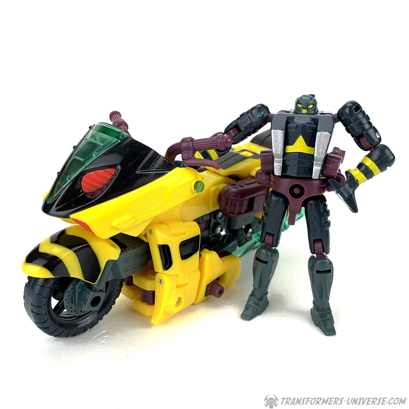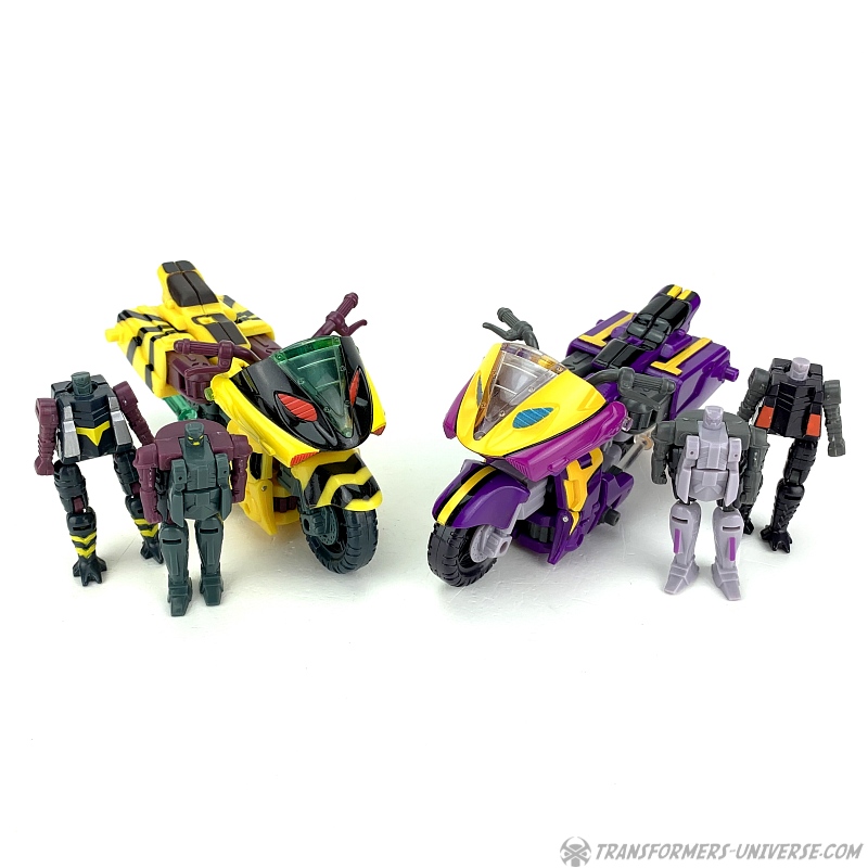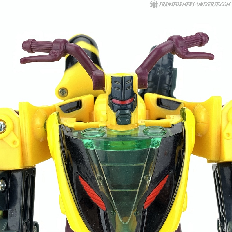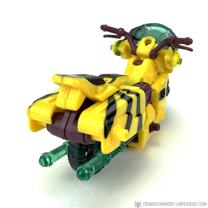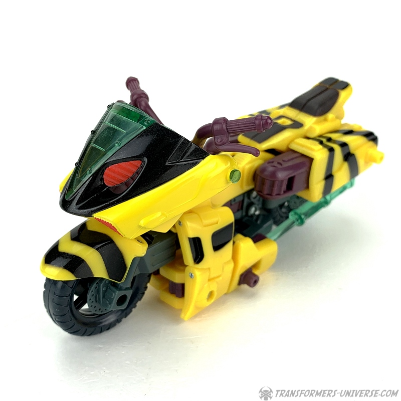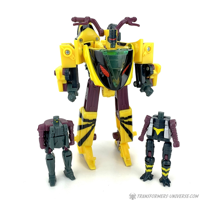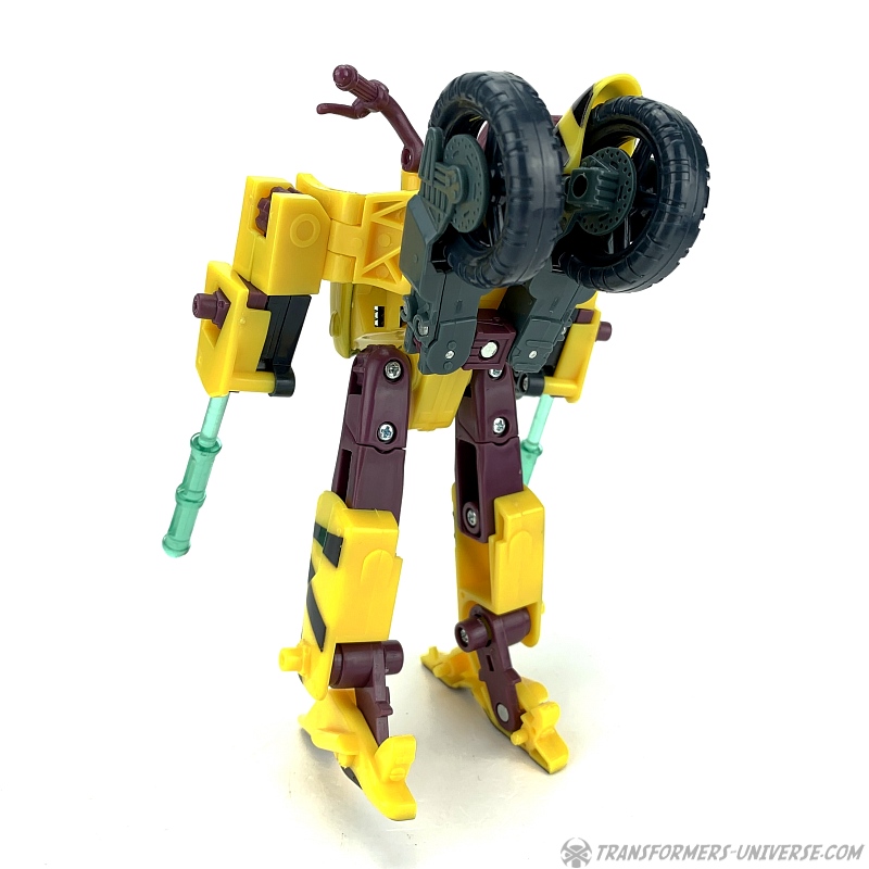 Alternate Mode: Rapid Run transforms into a mostly yellow racing cycle. The transformation isn’t terribly complicated, but neither is it all that simple. The batons become Rapid Run’s exhaust pipes and his feet become the driver’s seat. His Mini-Con partners can serve as riders, either combined or individually (see below). The bike itself looks pretty good, though it has almost no clearance to the ground. So overall, a decent alternate mode, but nothing too special.