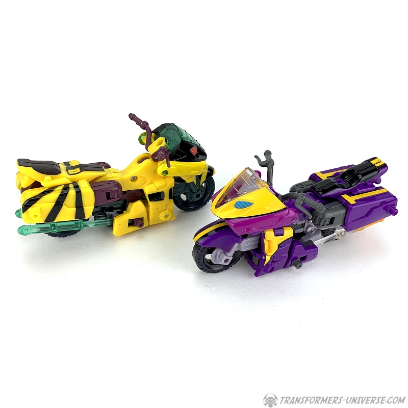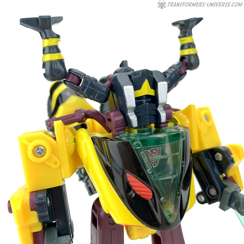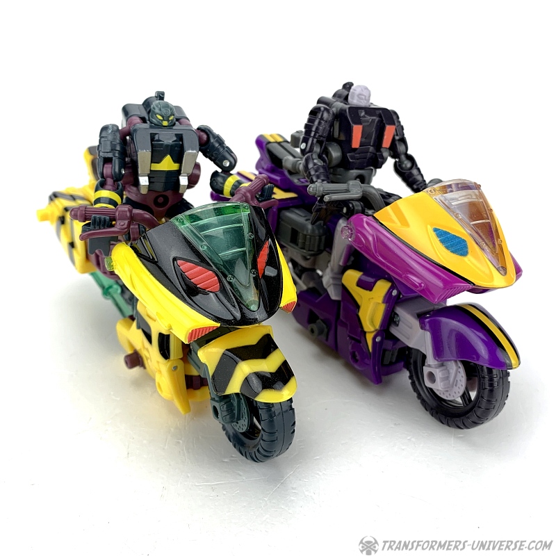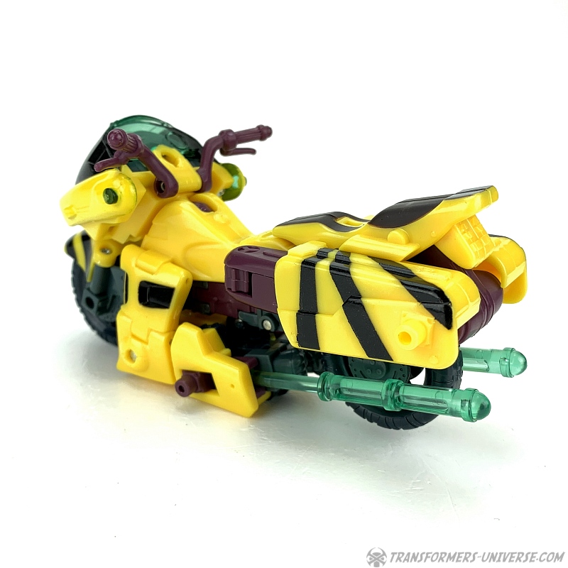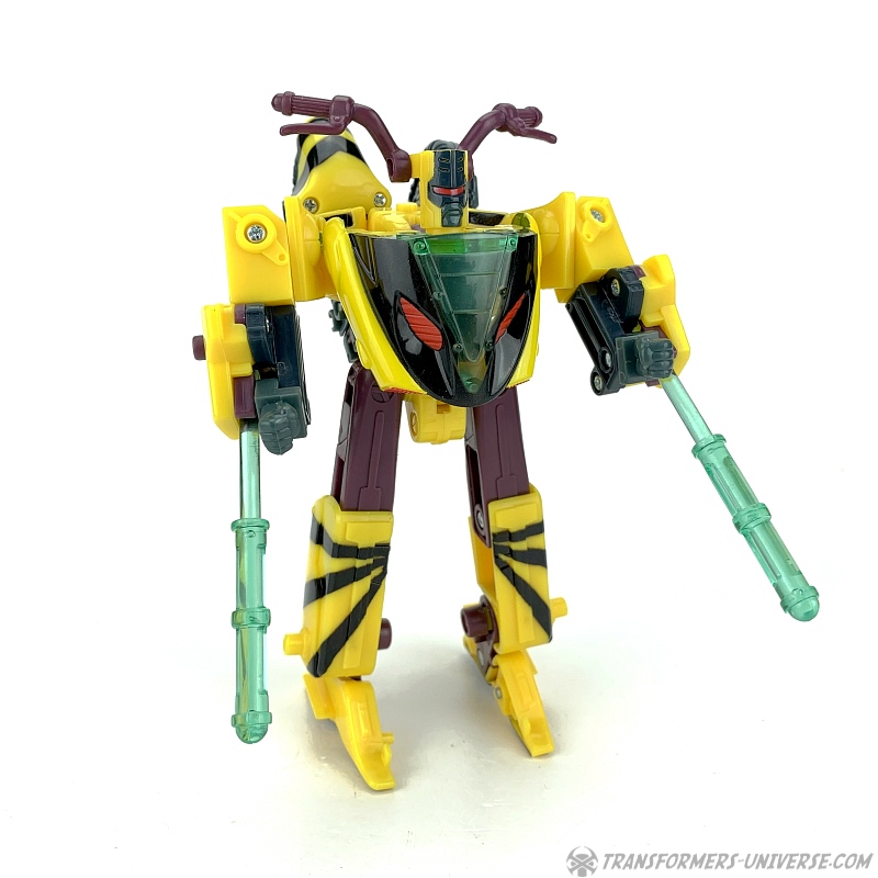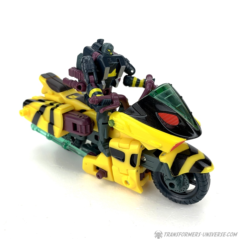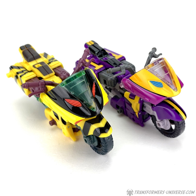 Alternate Mode: Rapid Run transforms into a mostly yellow racing cycle. The transformation isn’t terribly complicated, but neither is it all that simple. The batons become Rapid Run’s exhaust pipes and his feet become the driver’s seat. His Mini-Con partners can serve as riders, either combined or individually (see below). The bike itself looks pretty good, though it has almost no clearance to the ground. So overall, a decent alternate mode, but nothing too special.