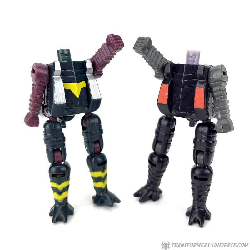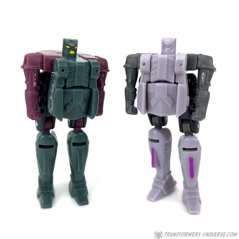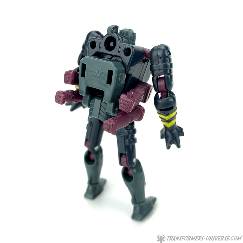 Rapid Run’s main gimmick is, of course, the same as Sideways’. He can slide down his own (rather small) head and replace it with either of this two Mini-Con partners (see below). Each Mini-Con becomes a head, one causing a Decepticon symbol to appear on his chest, the other unveiling an Autobot symbol. The two Mini-Con heads look pretty cool, despite their ‘antenna’ clearly being robot legs. Personally I still think that the Autobot-head looks more menacing than the Decepticon-head, but that’s subjective, of course.